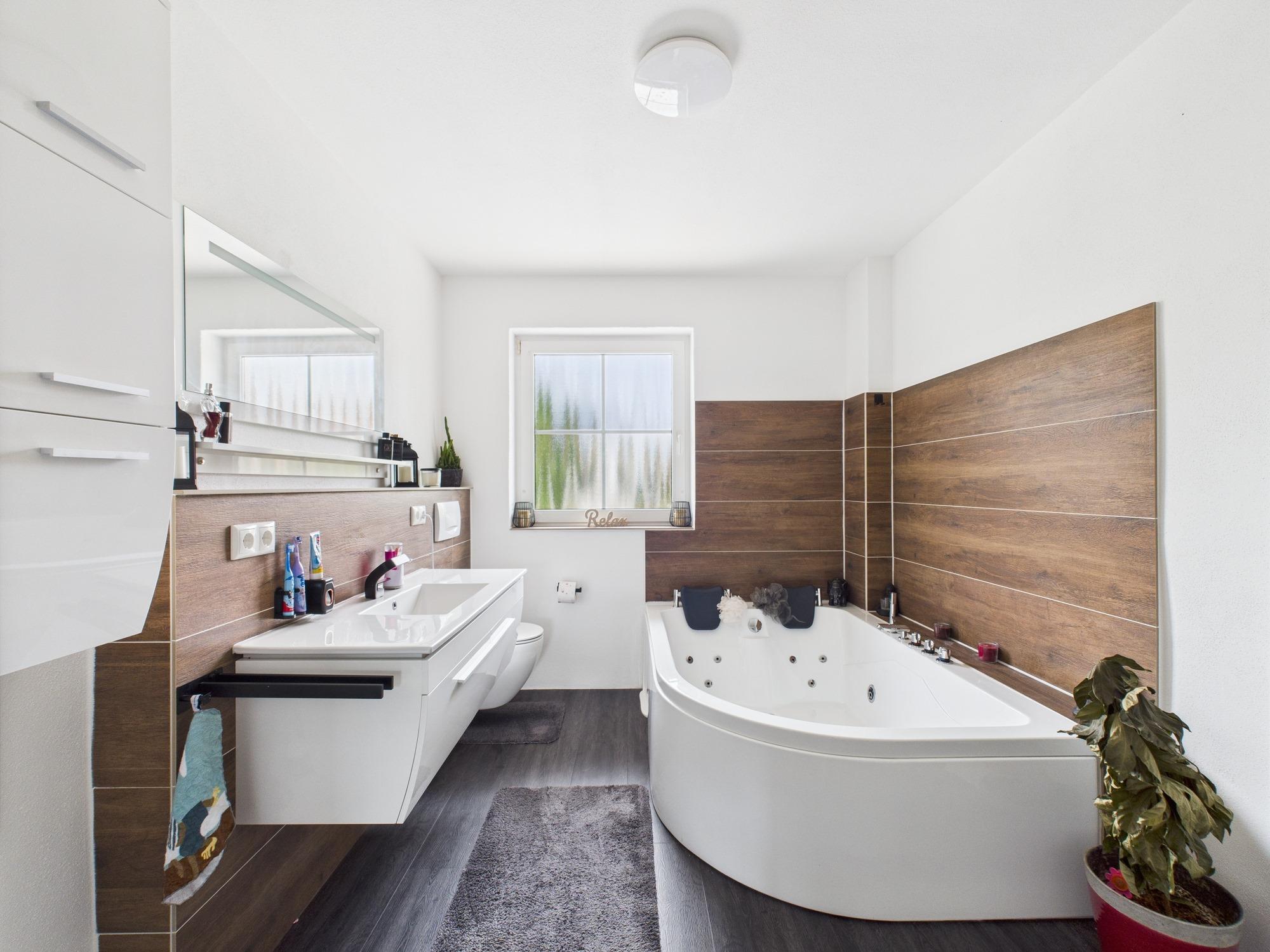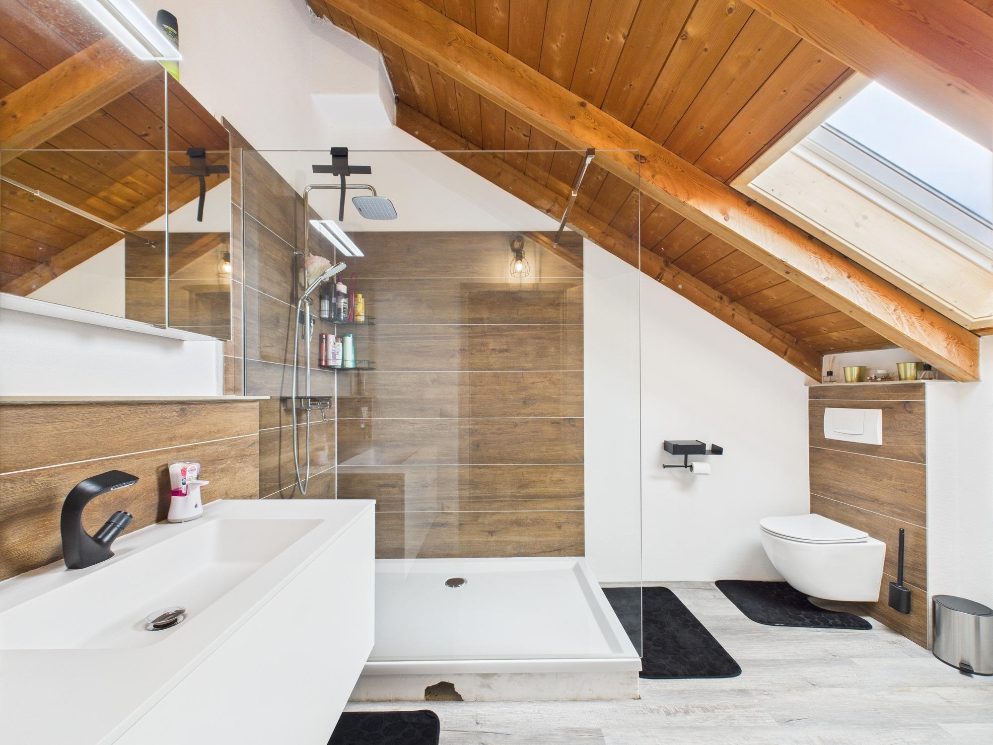 Im Obergeschoss befinden sich mehrere Schlaf- und Kinderzimmer, ein Tageslichtbad mit Badewanne und Dusche sowie ein Balkon mit Blick ins Grüne. Das Dachgeschoss ist als großzügiges Dachstudio ausgebaut und bietet vielfältige Nutzungsmöglichkeiten. Es eignet sich hervorragend als Kinderbereich, Rückzugsort für Teenager, Gästeetage oder Homeoffice. Ein eigenes Duschbad sorgt hier für zusätzlichen Komfort.