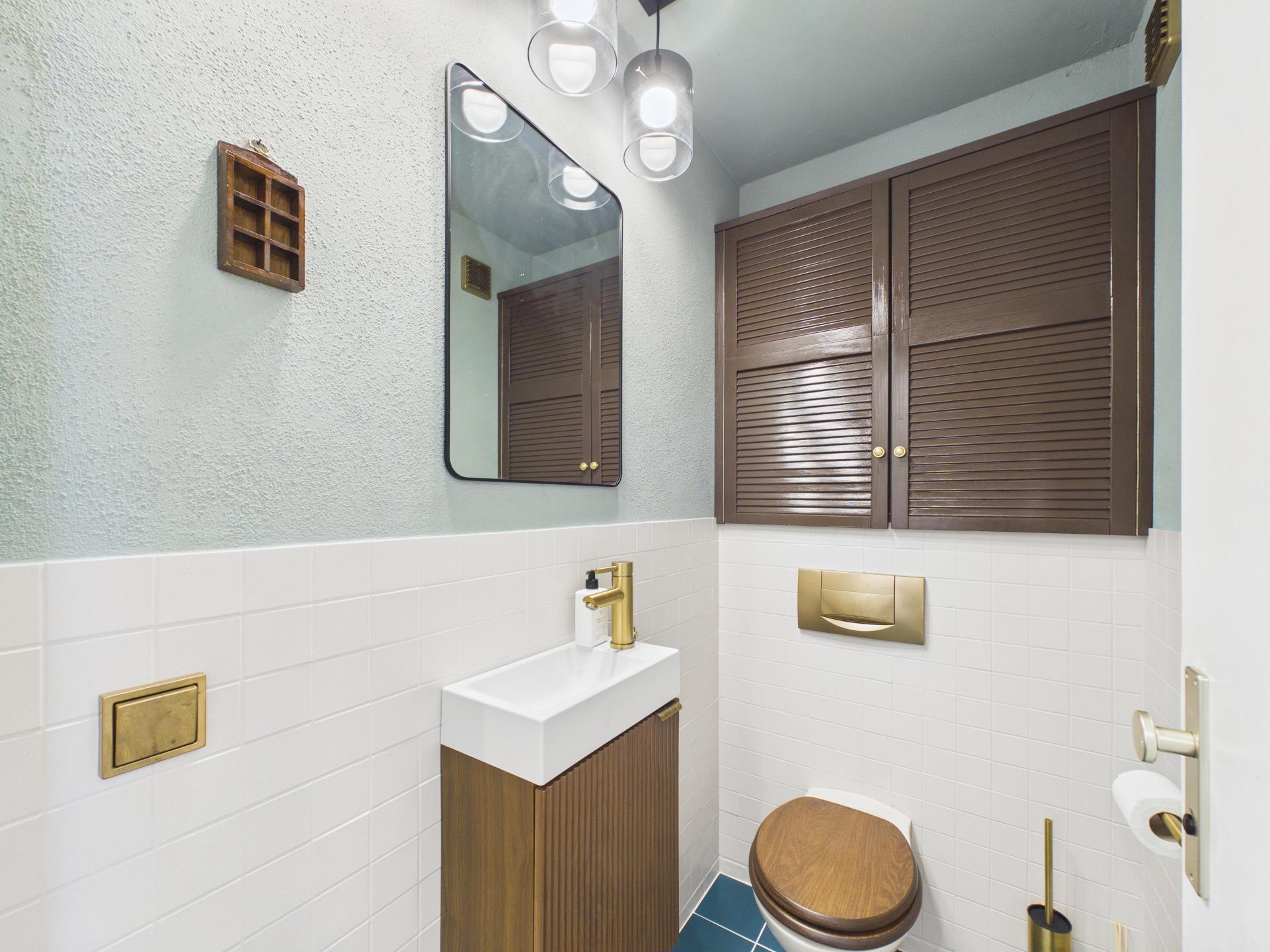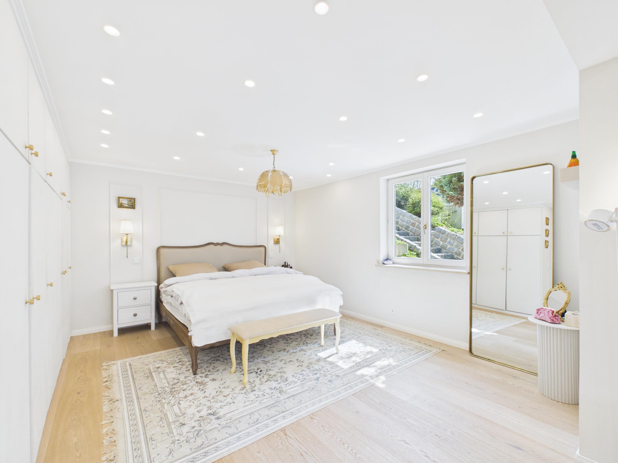Das Obergeschoss bildet das Herzstück des Hauses und überzeugt mit klassischem Wohnkomfort in großzügiger Dimension. Ein einladender Wohn- und Essbereich mit Kamin schafft eine behagliche Atmosphäre, während zwei Schlafzimmer, ein Büro sowie eine separate Küche ideale Voraussetzungen für das Familienleben bieten. Ein besonderes Highlight sind die großzügigen Außenflächen: Der Westbalkon über die gesamte Hausbreite sowie die sonnige Süd-/Ostterrasse mit direktem Zugang zum Garten verbinden Innen- und Außenleben auf besonders reizvolle Weise.