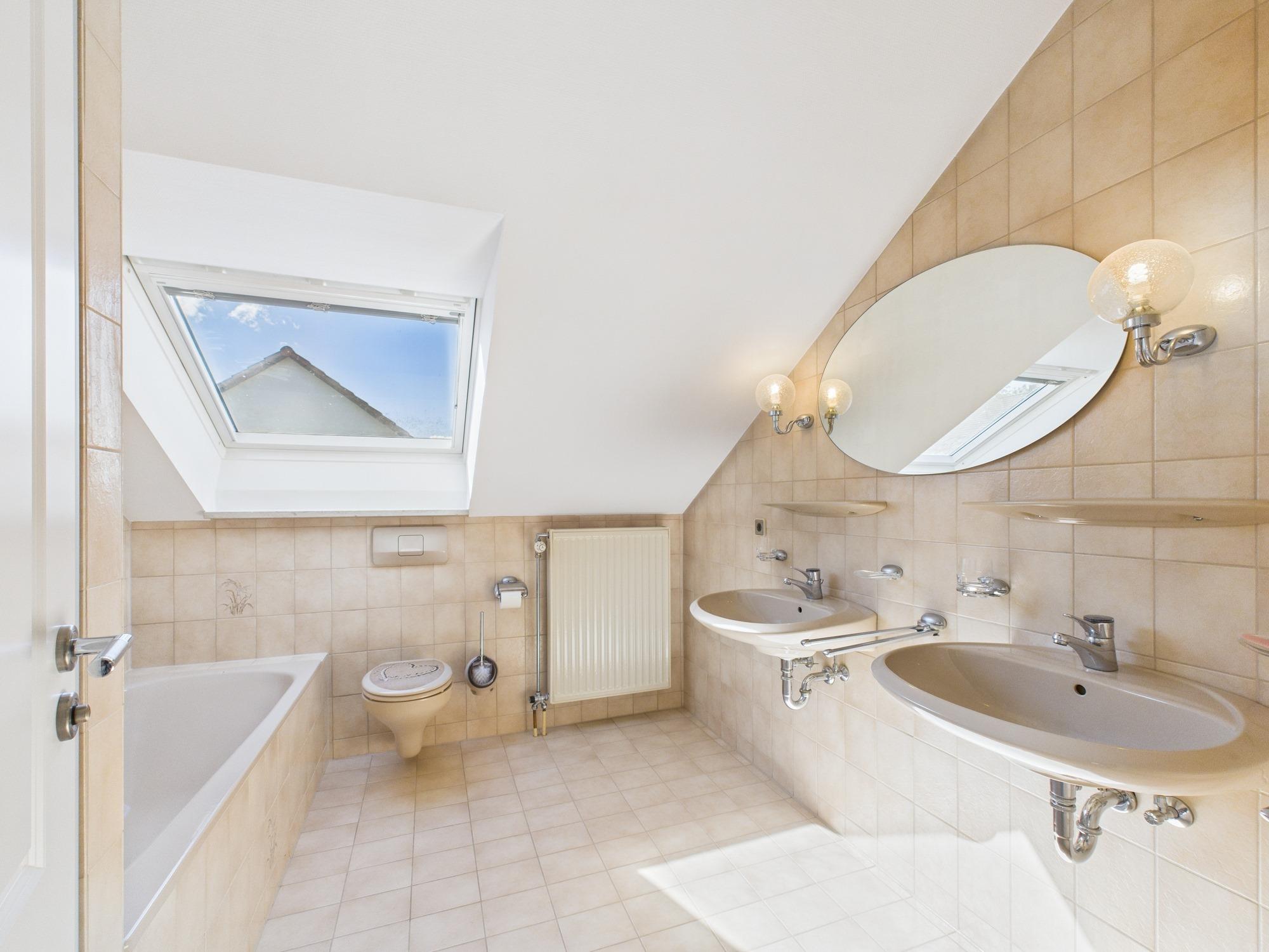 - Hauptbadezimmer im Obergeschoss, gestaltet mit beigen Fliesen; ausgestattet mit Badewanne, separater Dusche mit Glaskabine, Doppelwaschtisch mit ovalen Becken, beleuchtetem Spiegel, WC und großem Fenster