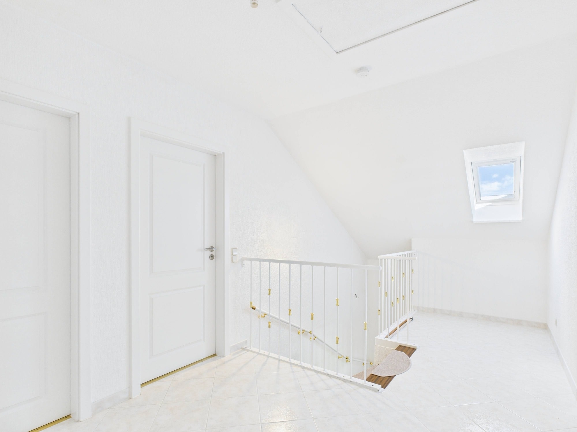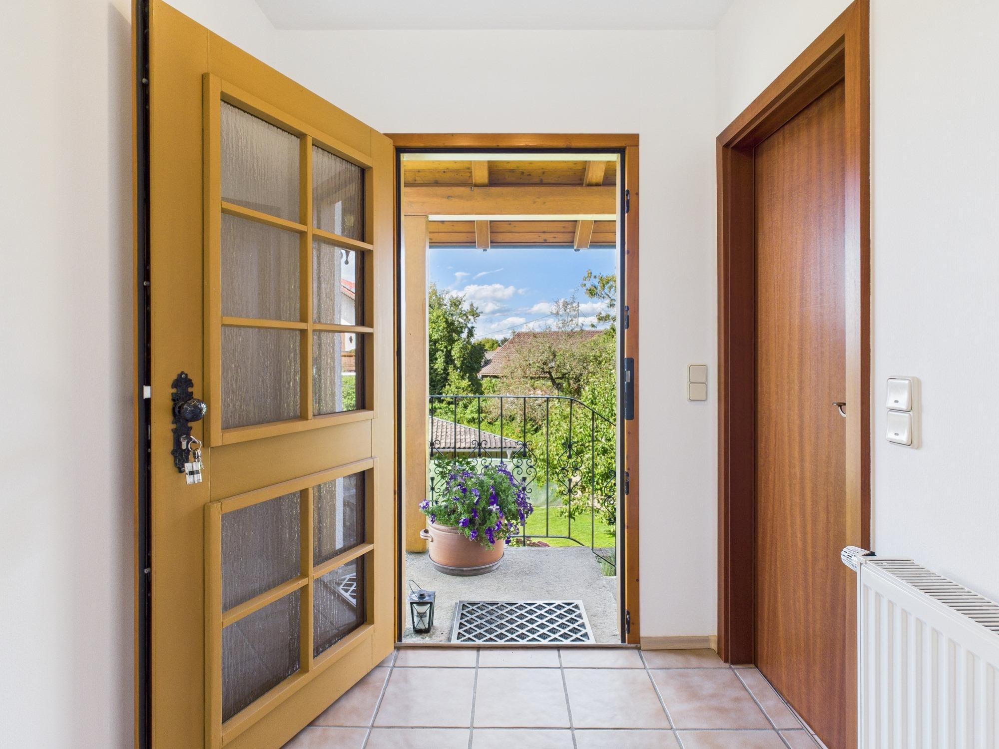 - Eingangsbereich mit gefliester Diele und offenem Treppenaufgang; Treppenstufen aus Massivholz mit weiß lackiertem Geländer