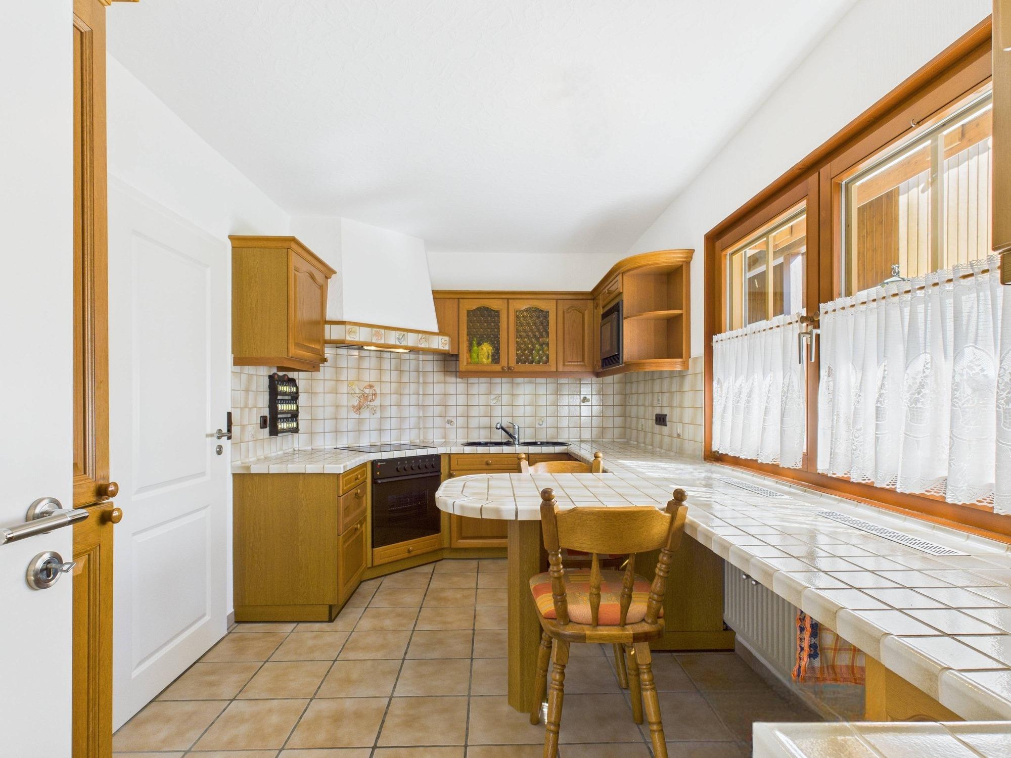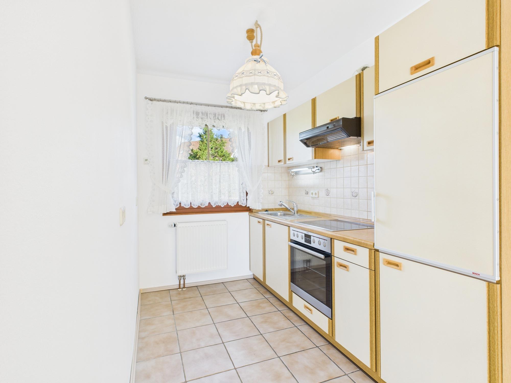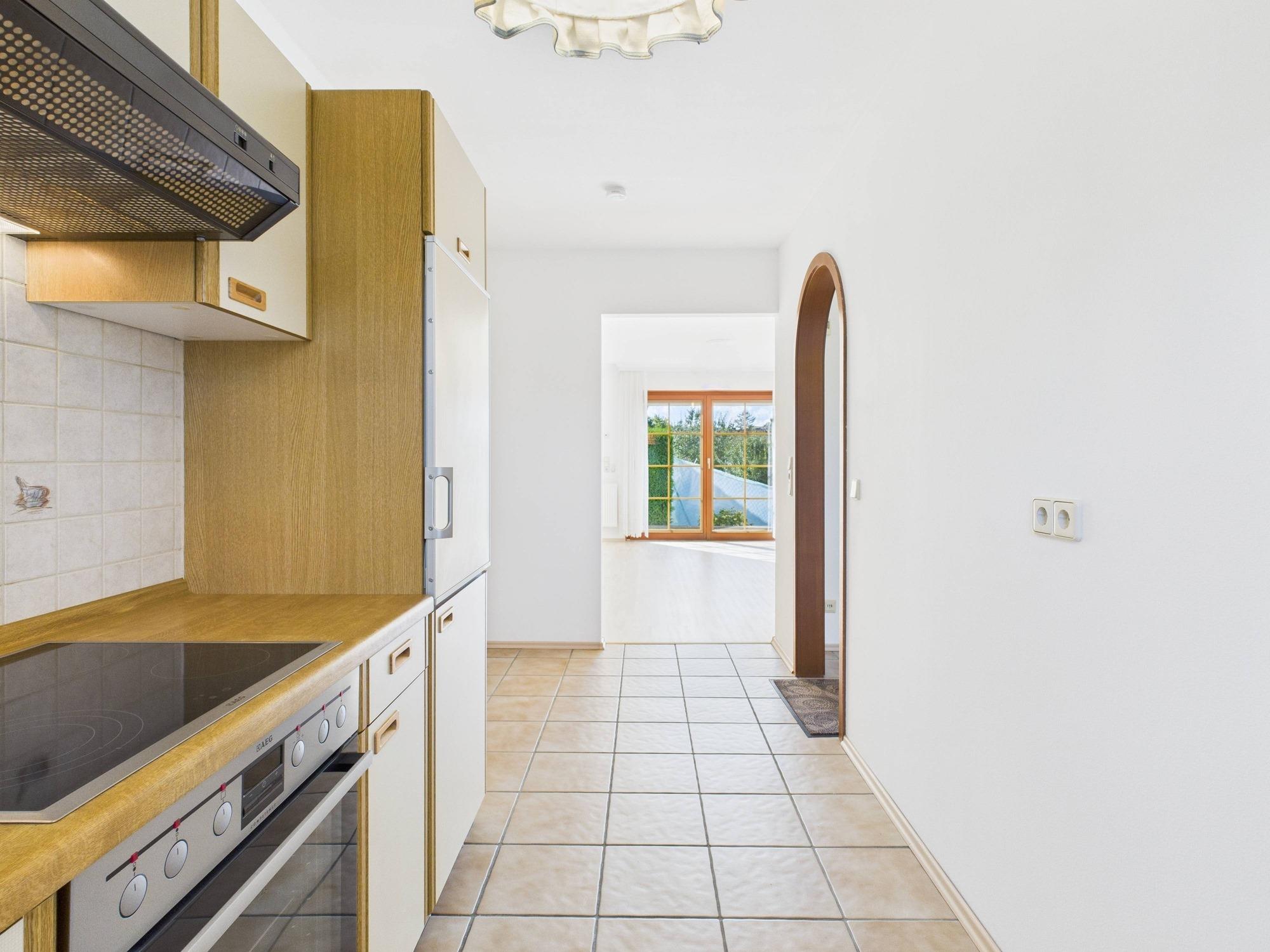 - Einbauküche mit hellen Fronten, geflieste Arbeitsplatte und Fliesenspiegel in Beige; ausgestattet mit Cerankochfeld, Dunstabzug, Backofen, Kühlschrank und Geschirrspüler (AEG, Bauknecht, Miele)