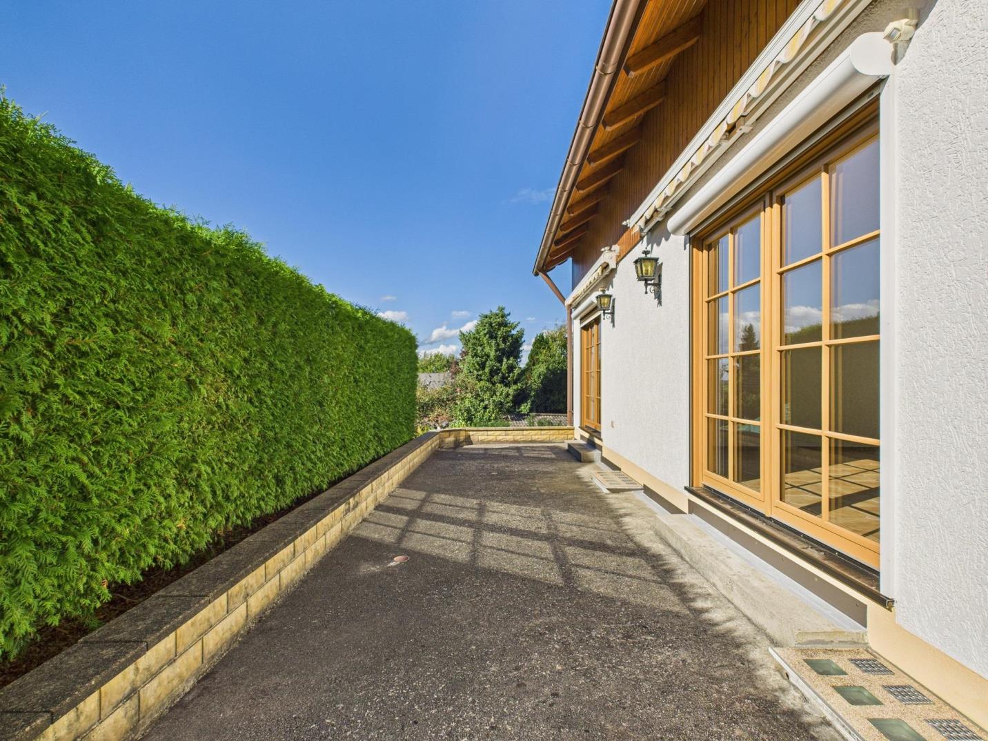 - Terrasse: Ausgestattet mit elektrischer Markise inklusive Windsensor, Stromanschluss sowie Beleuchtung mit Bewegungsmelder