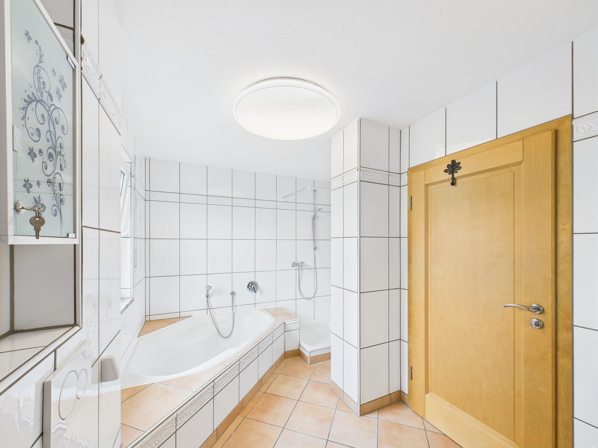 Obergeschoss: Tageslichtbad mit Wanne und Dusche, Arbeits- oder Gästezimmer sowie zwei weitere Schlafzimmer.