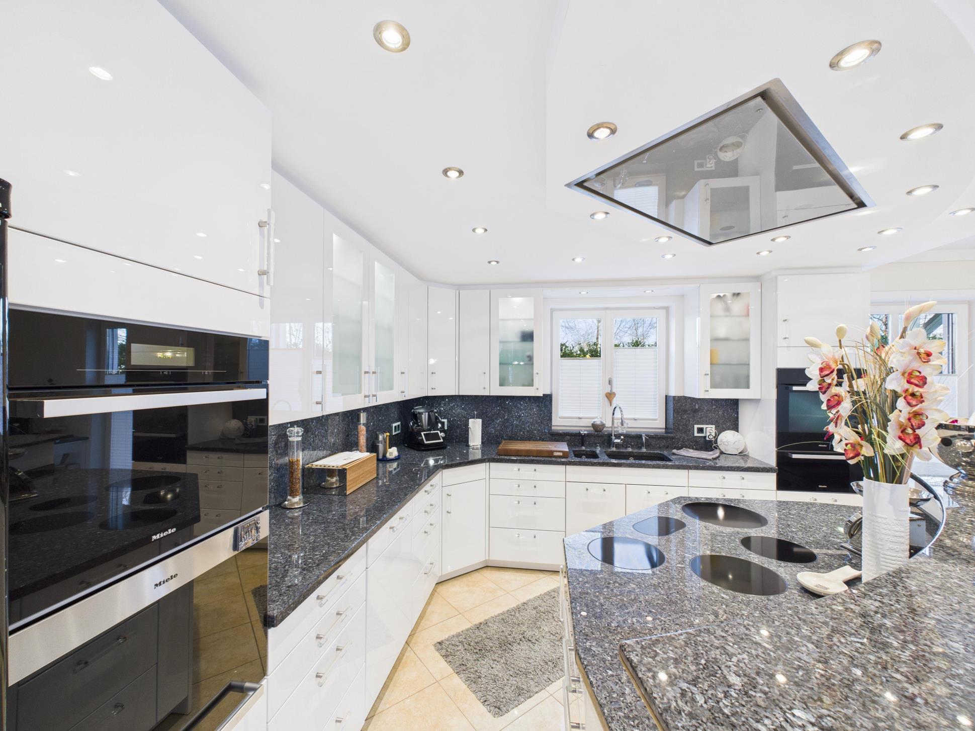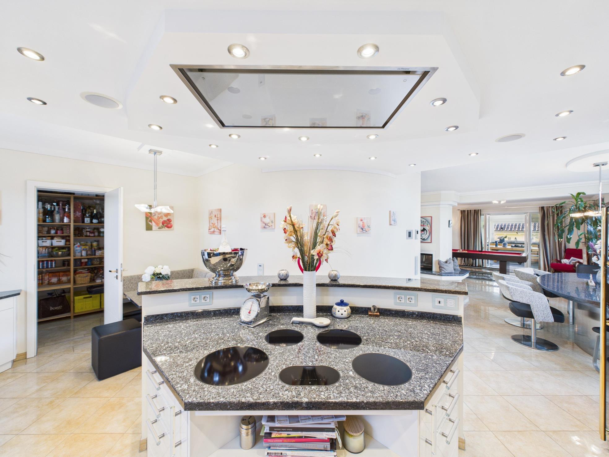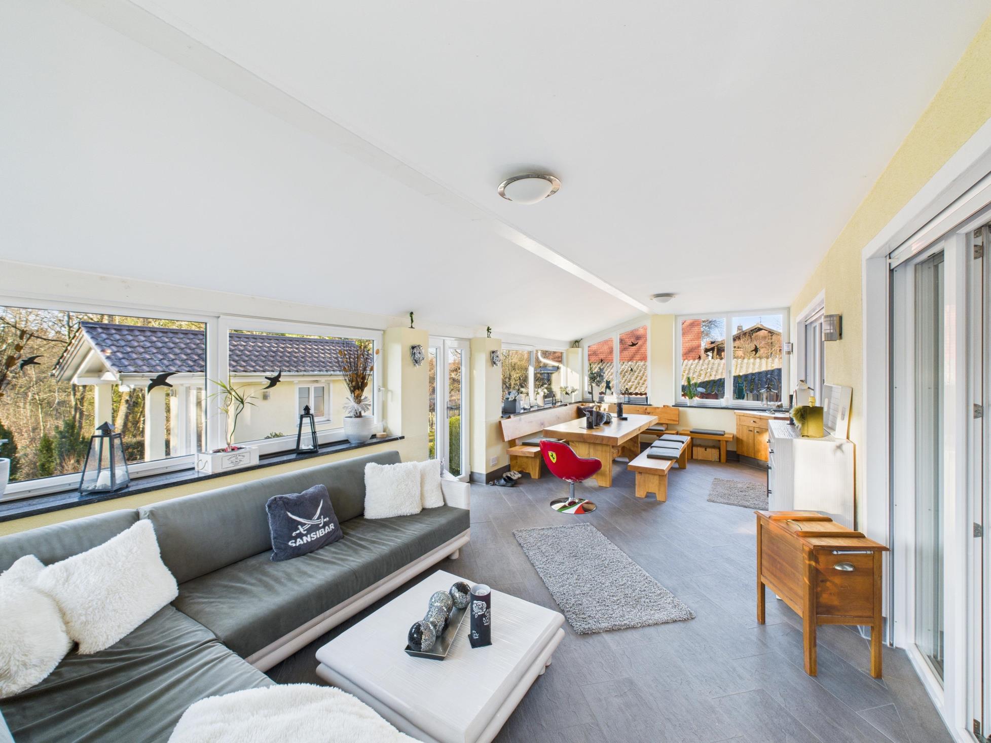 Lichtdurchflutete Wohnräume mit beeindruckenden Raumhöhen, klare Grundrisse und hochwertige Materialien schaffen eine Atmosphäre, die zugleich repräsentativ und wohnlich ist. Das Herzstück des Hauses bildet der offen komponierte Wohn und Essbereich mit einem zentralen Tunnelofen als emotionalem Mittelpunkt. Ergänzt durch einen ganzjährig nutzbaren Wintergarten, eine hochwertige Küche mit angrenzender Speisekammer und durchdachte Details, die im Alltag den Unterschied machen.