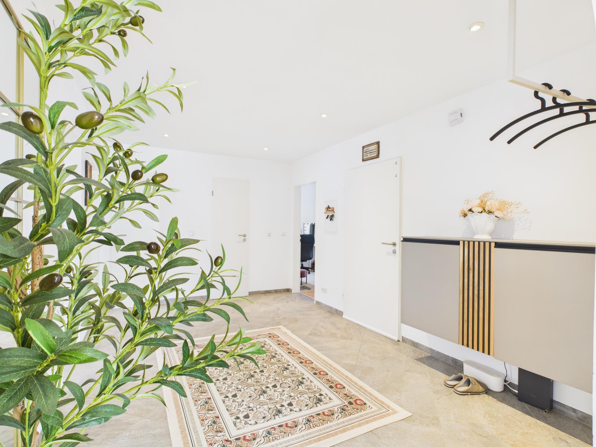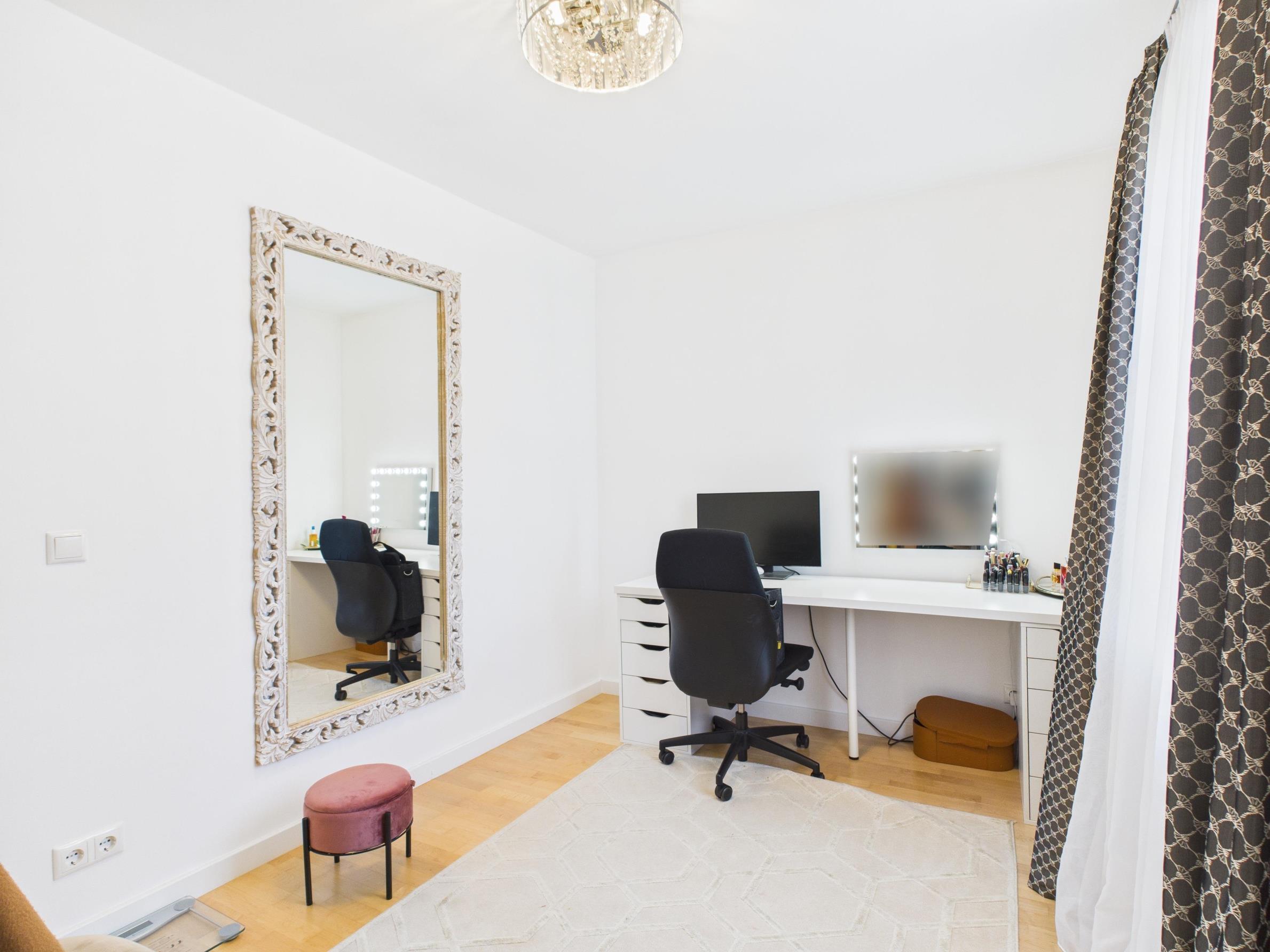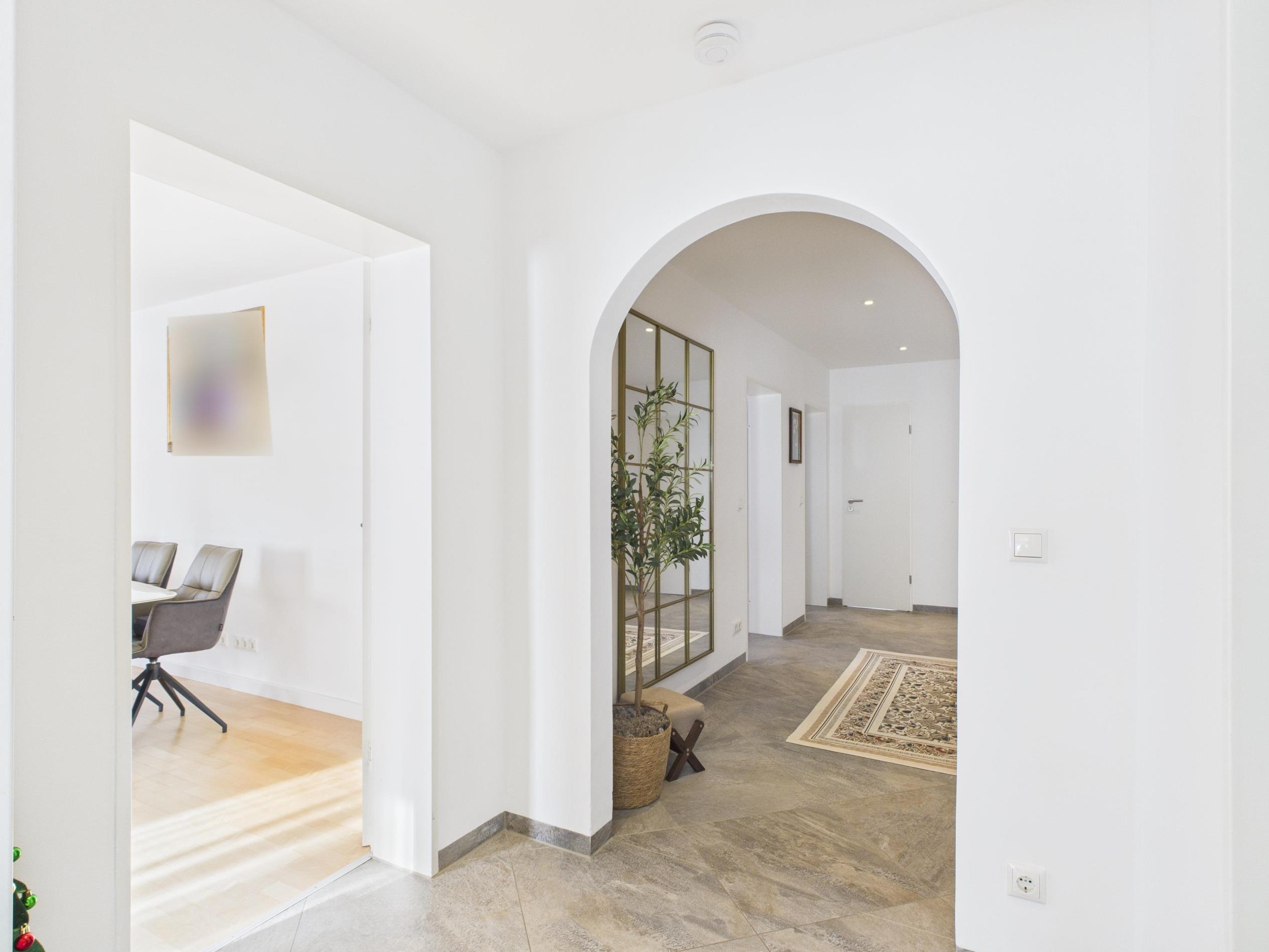 Ergänzt wird die Ausstattung durch moderne technische Elemente. Dazu zählen unter anderem eine beleuchtete Badewanne mit integrierter Audiofunktion sowie ein Smart-Home-System, über das verschiedene Komponenten der Wohnung wie Küche, Rollläden und weitere Funktionen komfortabel per Smartphone gesteuert werden können.