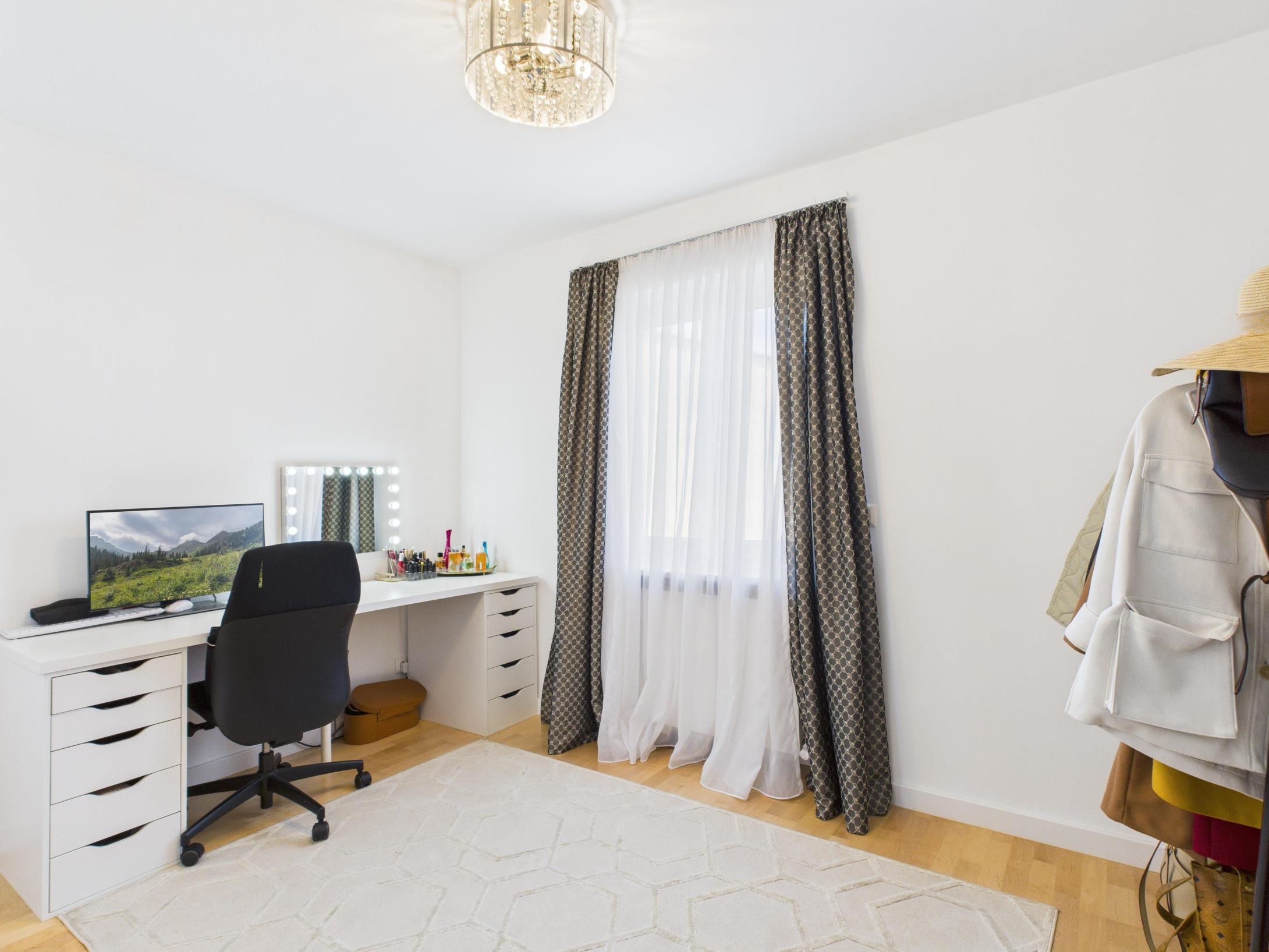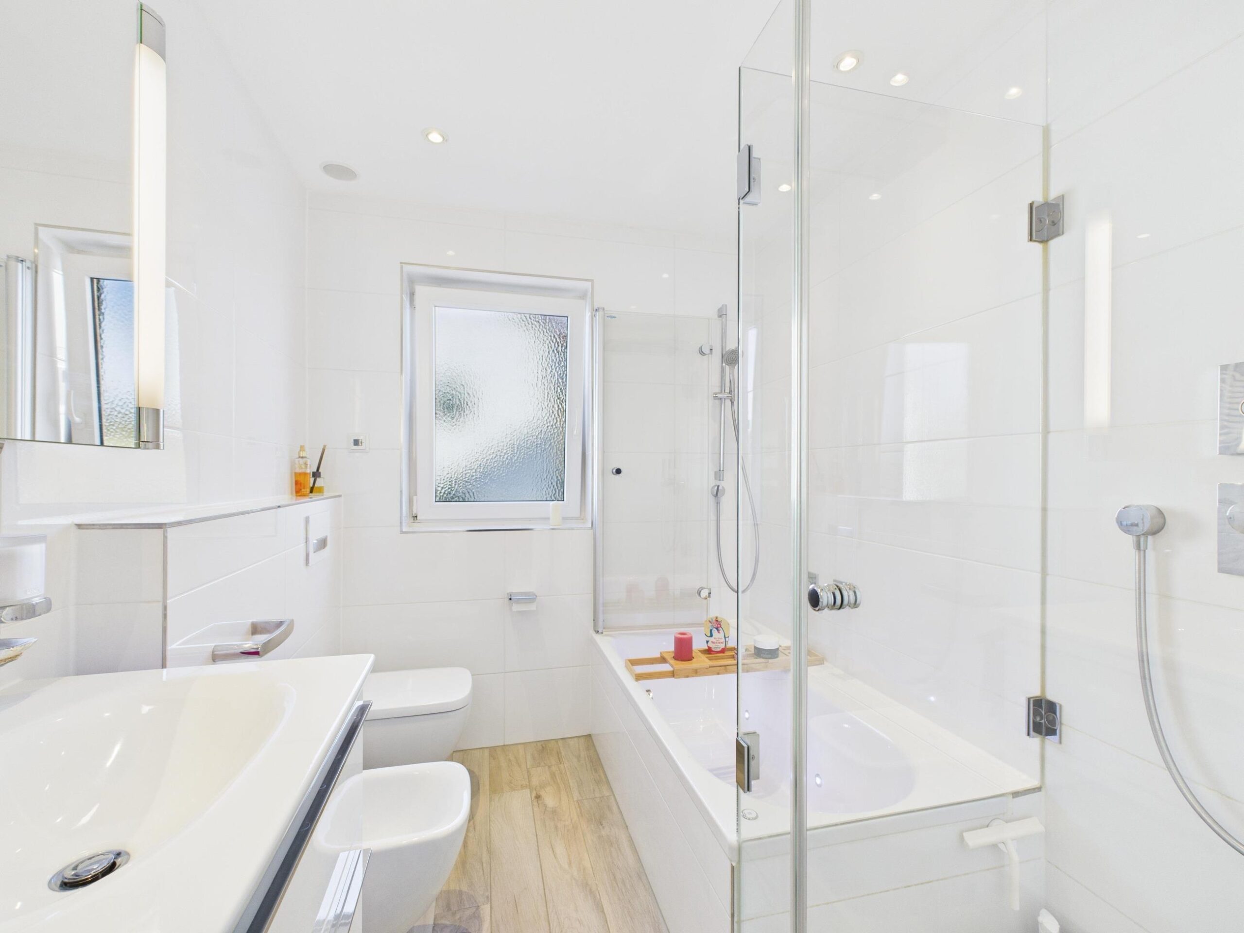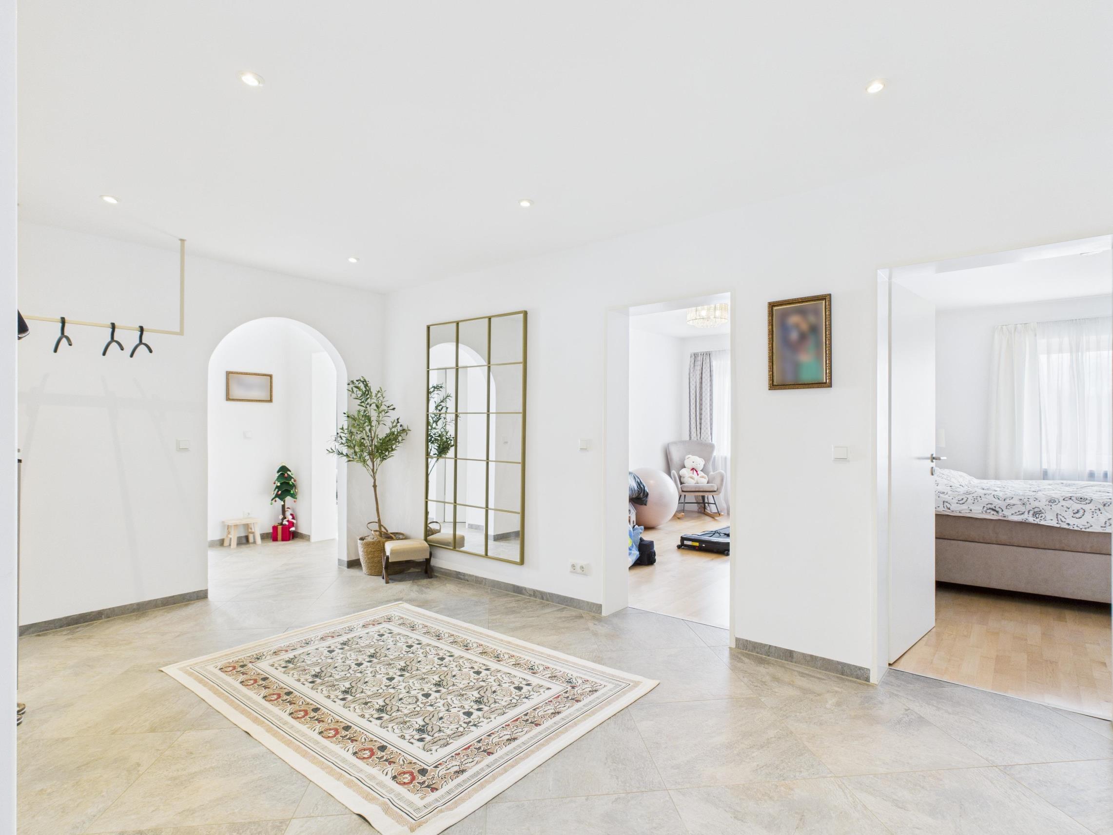 Ergänzt wird die Ausstattung durch moderne technische Elemente. Dazu zählen unter anderem eine beleuchtete Badewanne mit integrierter Audiofunktion sowie ein Smart-Home-System, über das verschiedene Komponenten der Wohnung wie Küche, Rollläden und weitere Funktionen komfortabel per Smartphone gesteuert werden können.