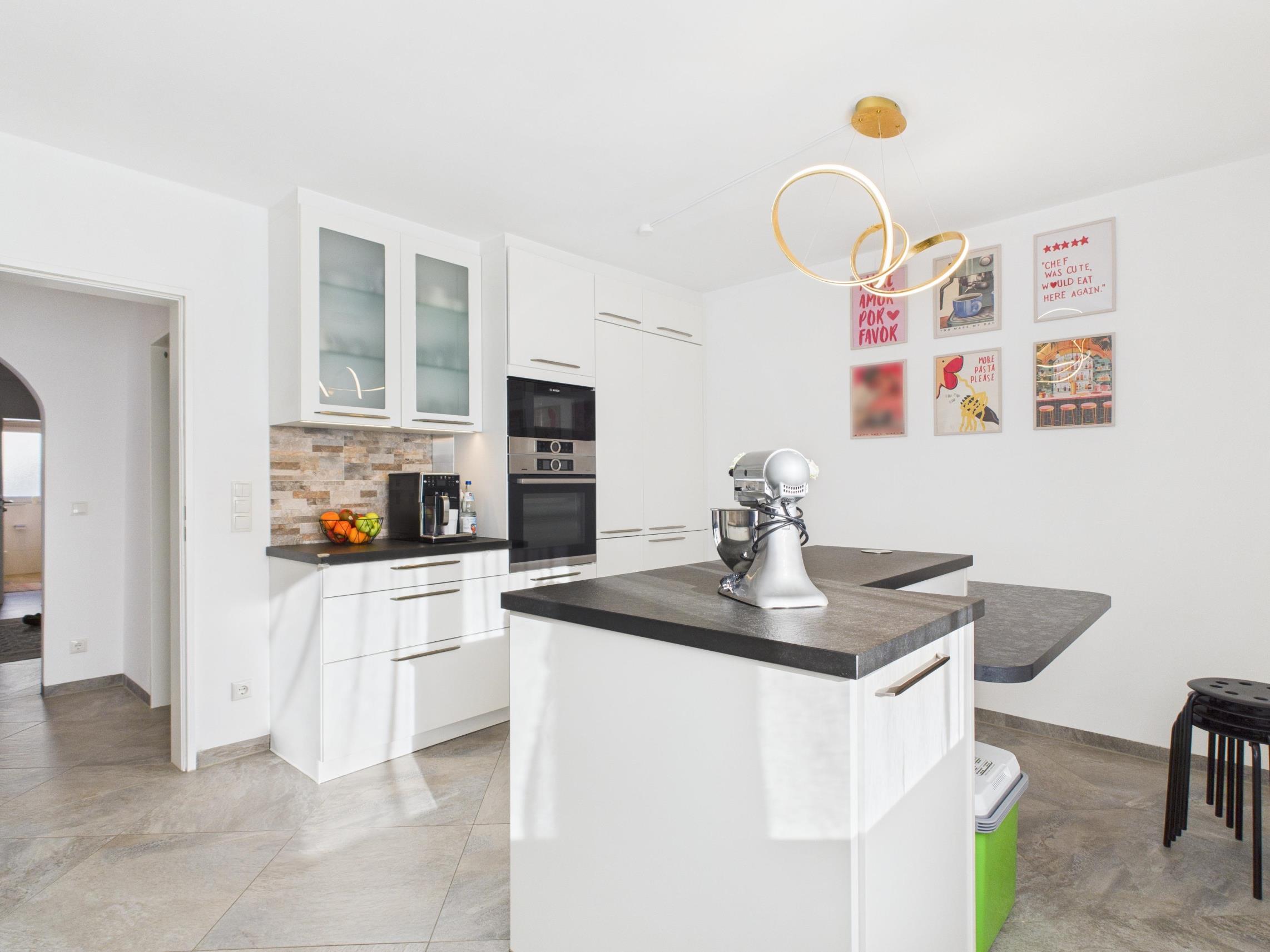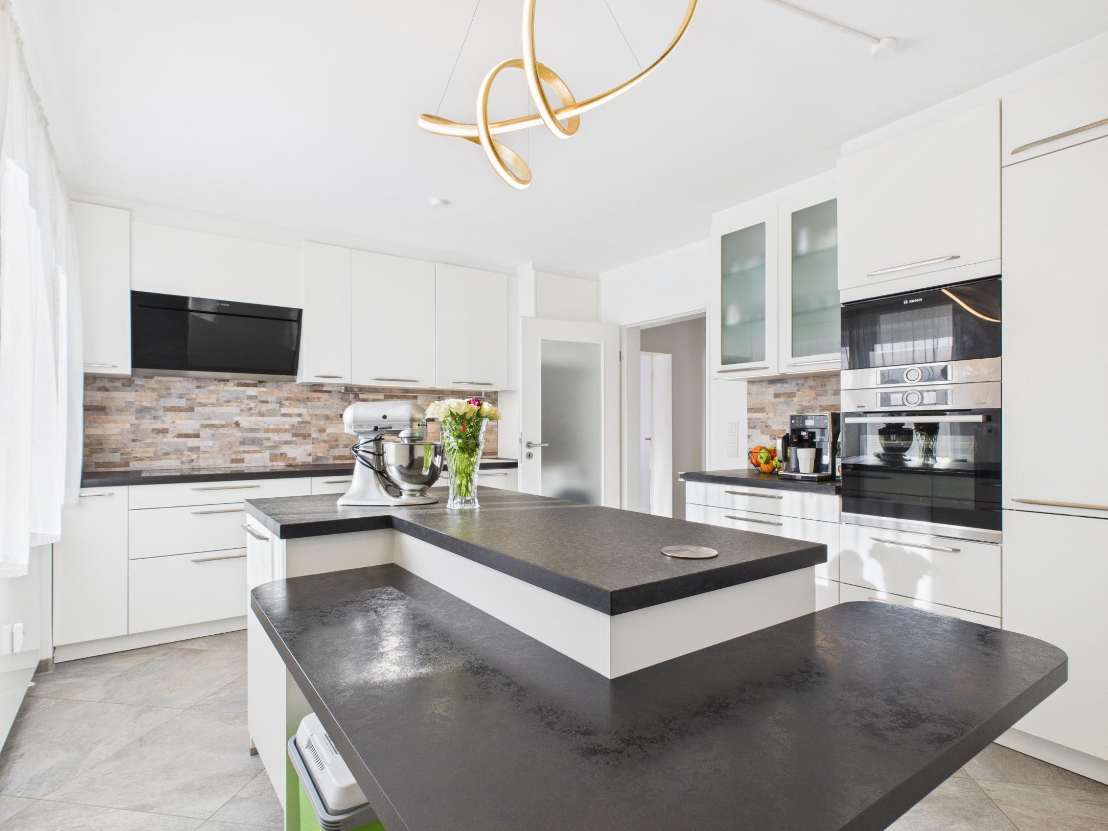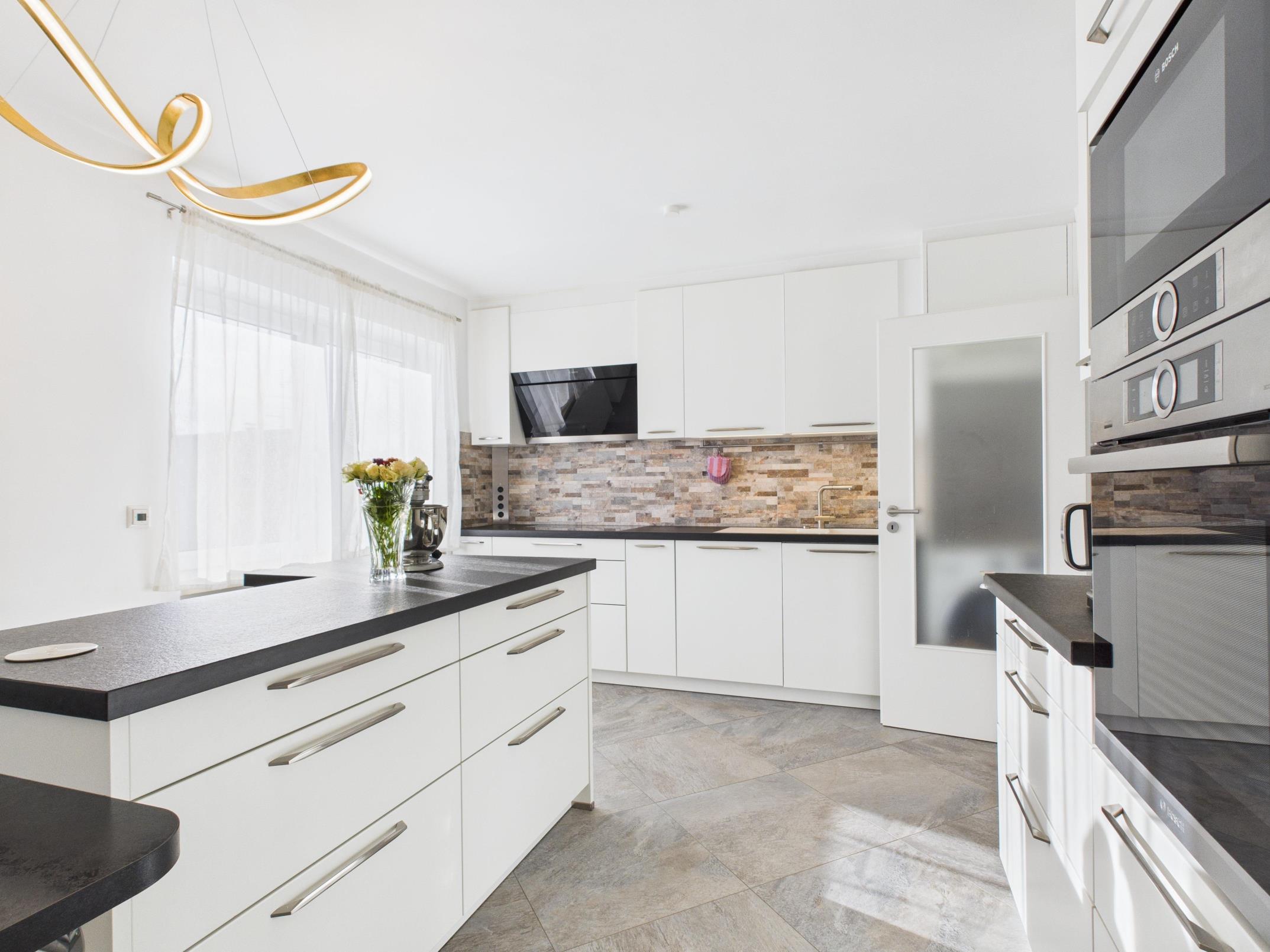 Ein zentrales Highlight bildet die offen gestaltete, exklusiv ausgestattete Küche. Diese präsentiert sich in zeitlosem, modernem Design und ist mit hochwertigen Einbaugeräten ausgestattet. Die großzügige Kücheninsel bildet den Mittelpunkt des Raumes und bietet sowohl zusätzlichen Arbeitsbereich als auch Platz für gemeinsames Kochen und Verweilen. Die Arbeitsflächen bestehen aus Naturstein und unterstreichen den hochwertigen Charakter der Küche sowohl optisch als auch funktional.