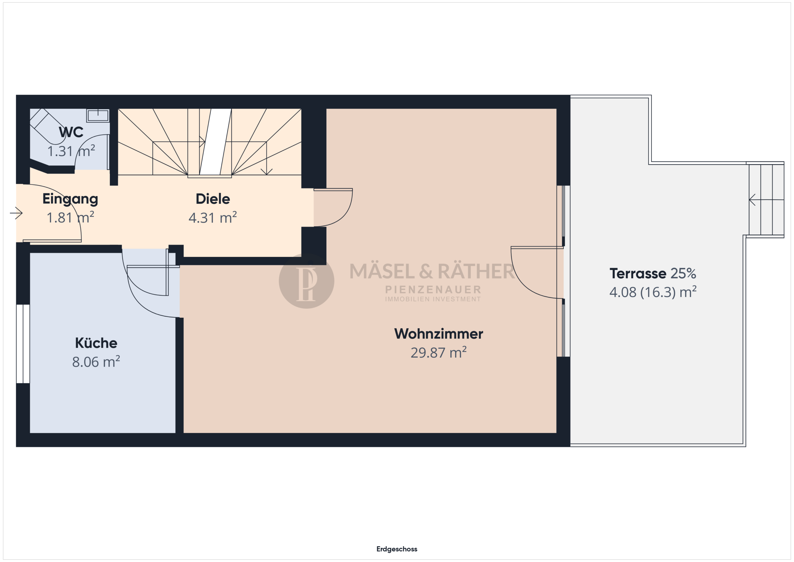 - Erdgeschoss: Diele, Garderobe, offenes Treppenhaus, Küche, Essbereich, Wohnzimmer, Gäste-WC mit Tageslicht