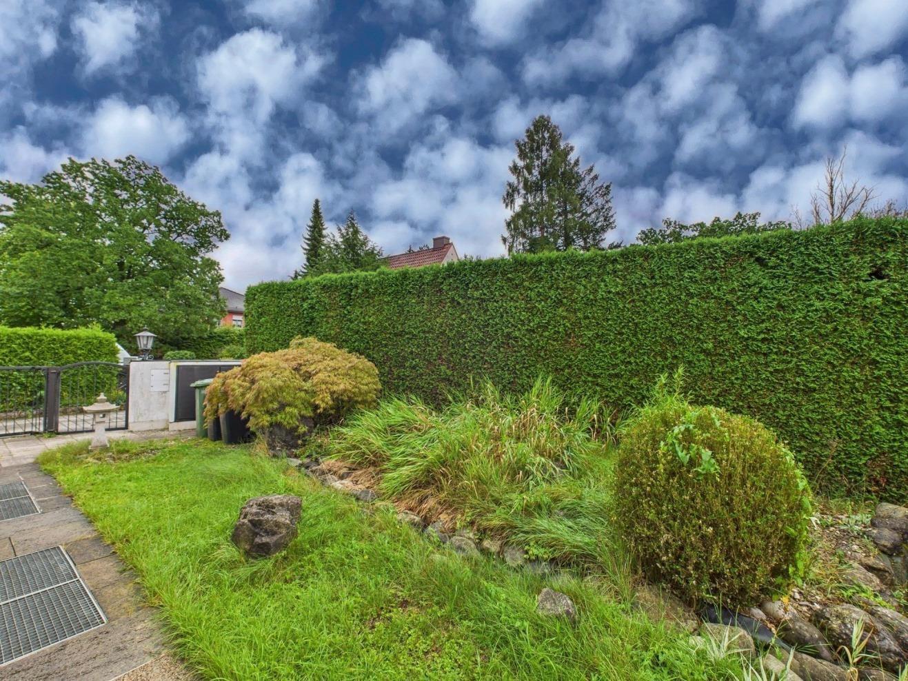 Vom hellen Wohnbereich aus öffnet sich der Zugang zur überdachten Terrasse und zur grünen Oase. Die Außenanlagen sind pflegeleicht gestaltet, um Rasenmähen und andere Gartenarbeiten auf ein Minimum zu reduzieren. Hier können Sie mit viel Privatsphäre die Ruhe und warmen Sommertage genießen.