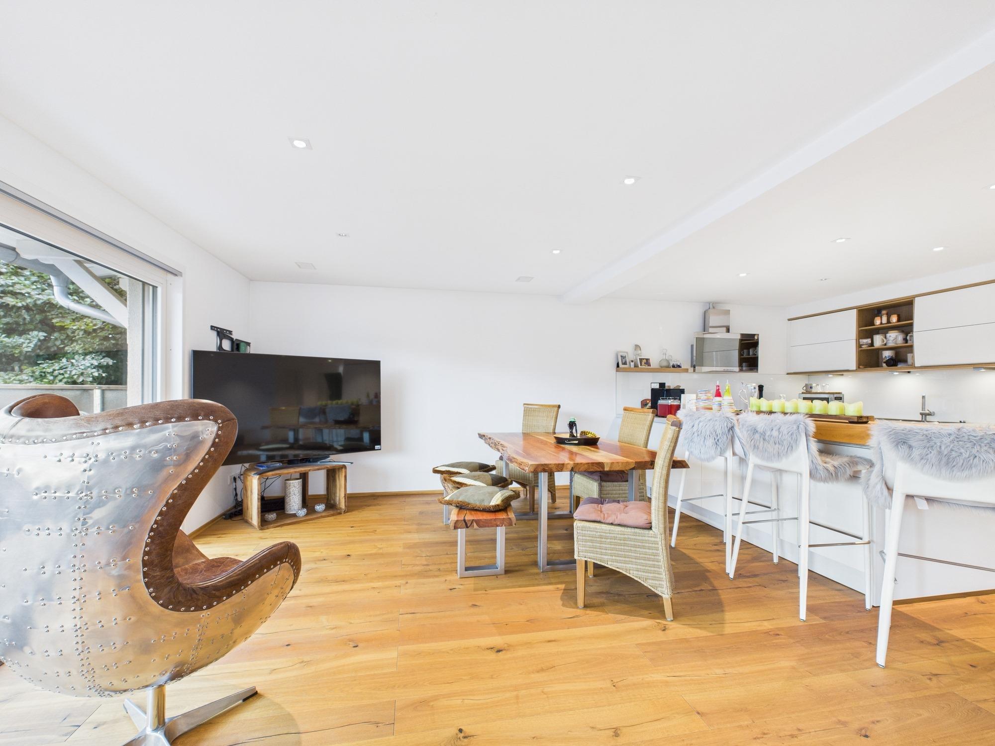 Zusätzlich erwarten Sie ein Hauswirtschaftsraum und ein separates WC. Der helle Wohnbereich wird durch eine bodentiefe Balkontür lichtdurchflutet. Die exklusive, U-förmige Küche mit integrierter Theke vereint Funktionalität mit Stil.