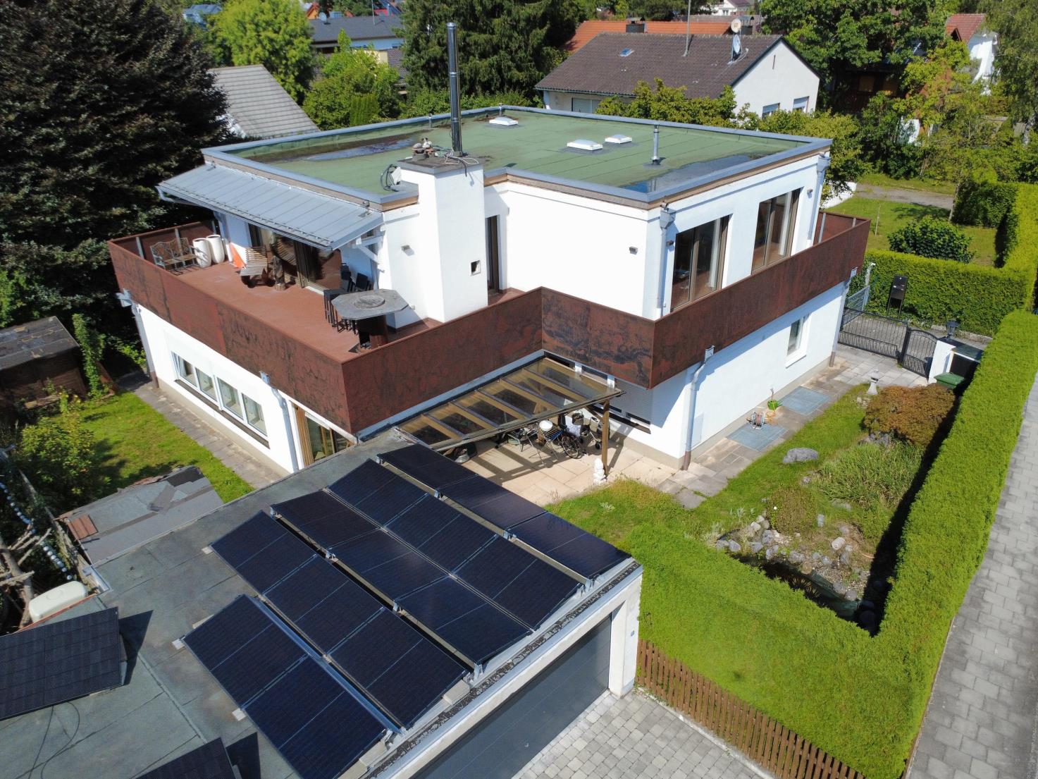 Auf dem Garagendach befindet sich eine Solarthermieanlage, die umweltfreundlich Warmwasser aufbereitet und nachhaltig Energiekosten senkt.