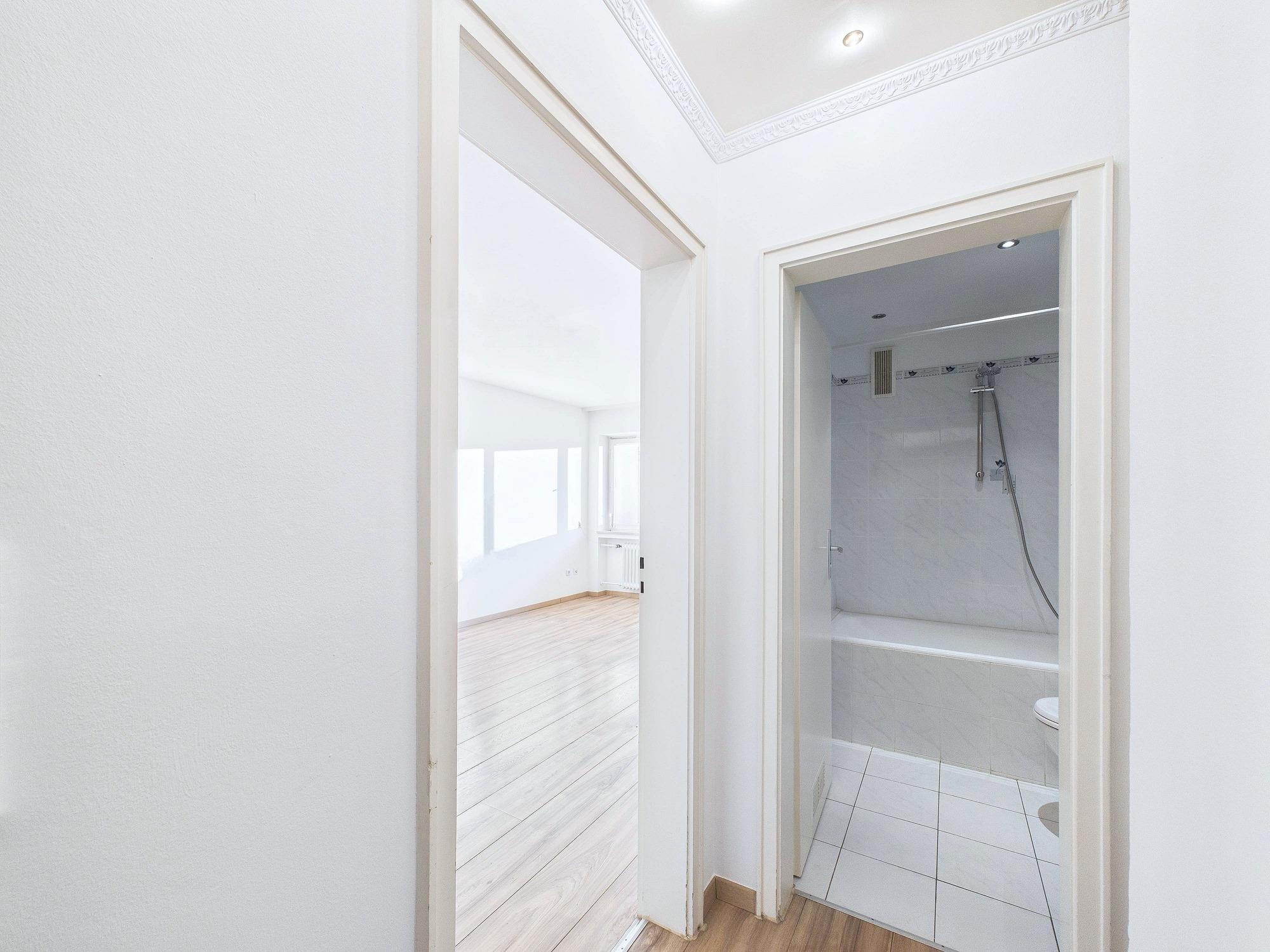 Der funktionale Grundriss verbindet Wohn- und Schlafbereich harmonisch und ermöglicht eine effiziente Nutzung der vorhandenen Fläche. Über den Eingangsbereich ist das Badezimmer mit hellen Fliesen und Badewanne erreichbar.