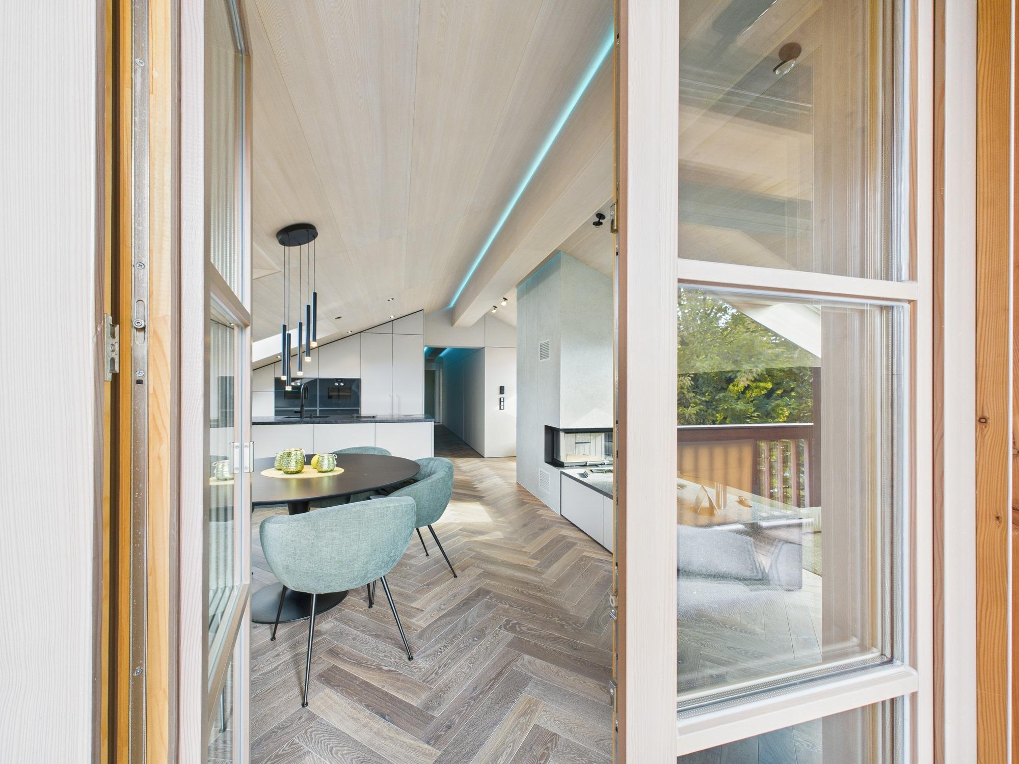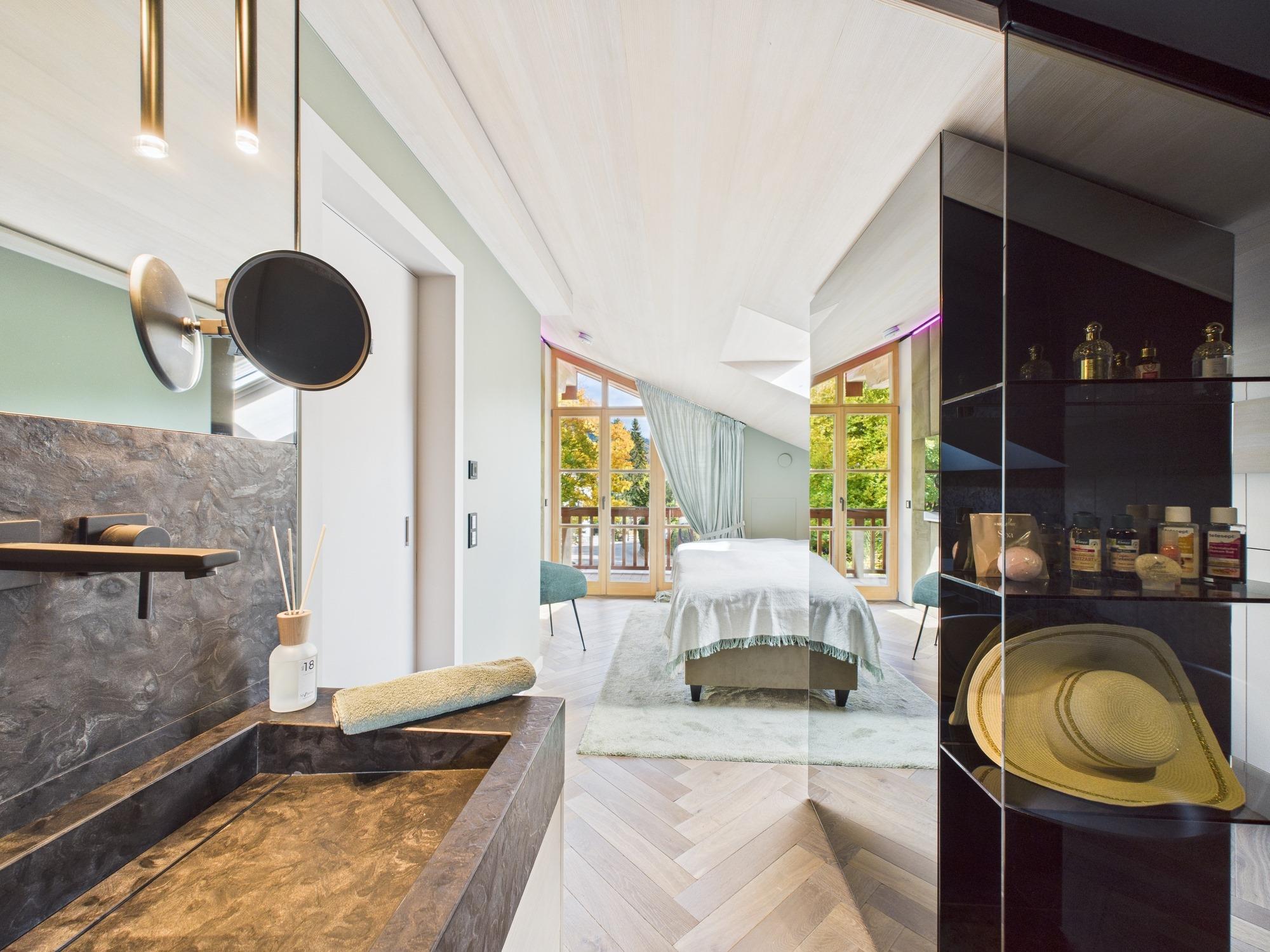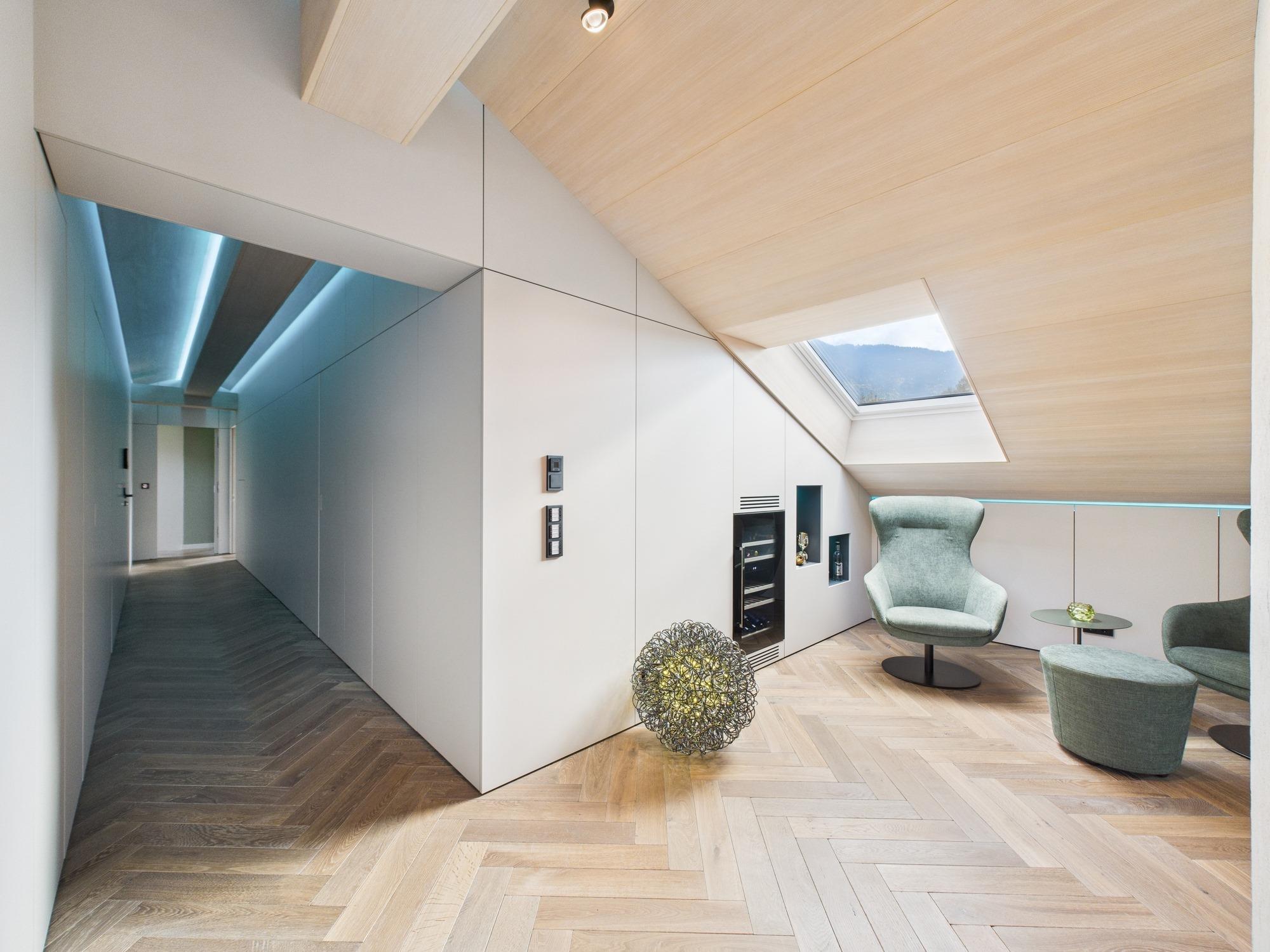 Wer eintritt, erkennt sofort die Handschrift eines kuratierten Interieurs: die Maßküche als skulpturales Statement mit Gaggenau-Ausstattung, der offene Kamin als ruhender Mittelpunkt, Fischgrätböden mit souveräner Gelassenheit. In den Bädern wird die Stille fast haptisch – Großformate, präzise Fugen, im Dampfbad Blattgold als leiser Akzent, im Gäste-WC eine markante Elefantenhaut-Optik. Überall Einbauten aus regionaler Schreinerarbeit, bündig geführt, mit Schattenfugen inszeniert – Ordnung, die nicht erzieht, sondern befreit.