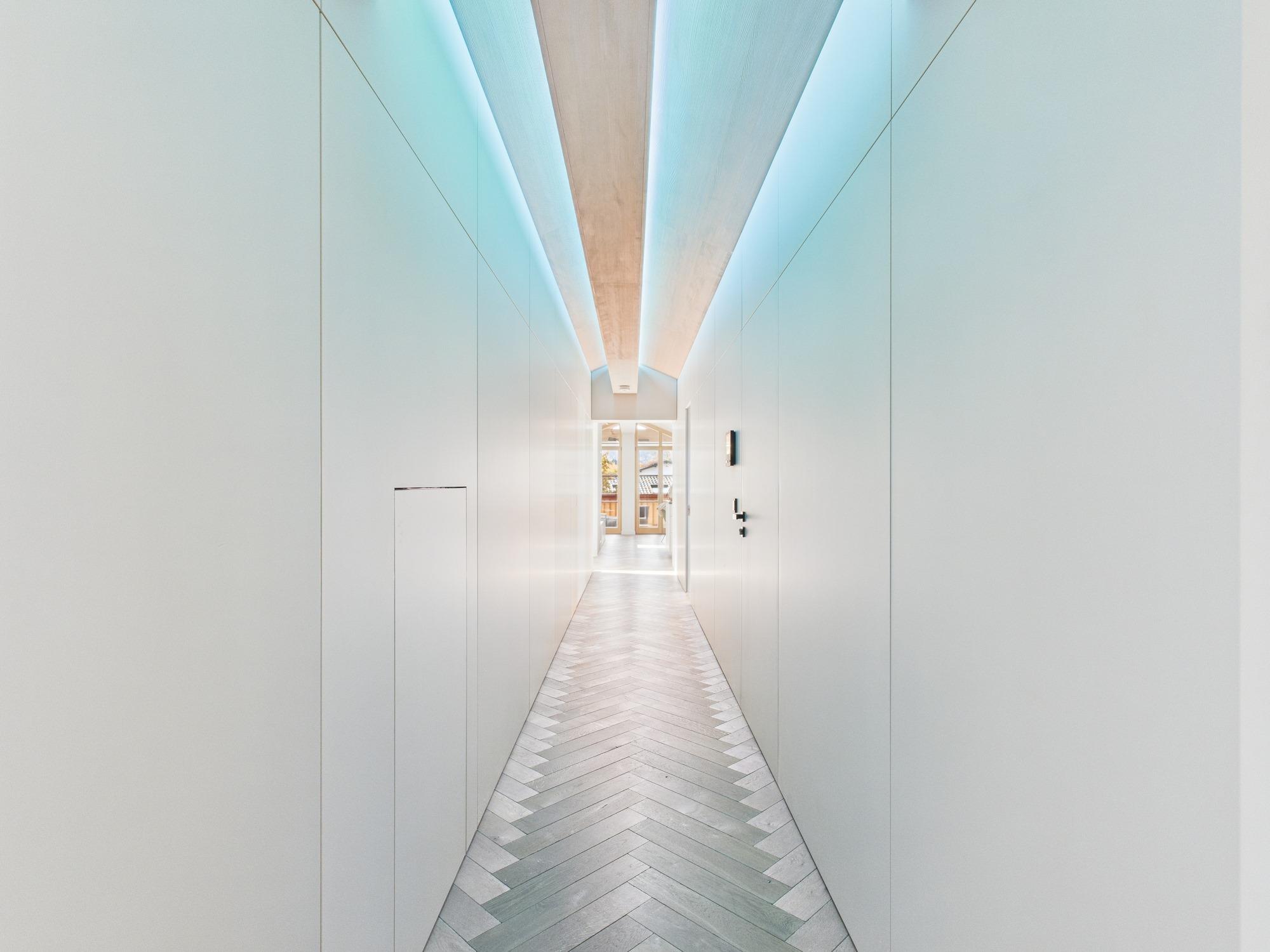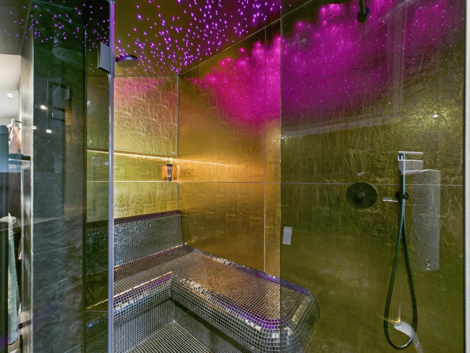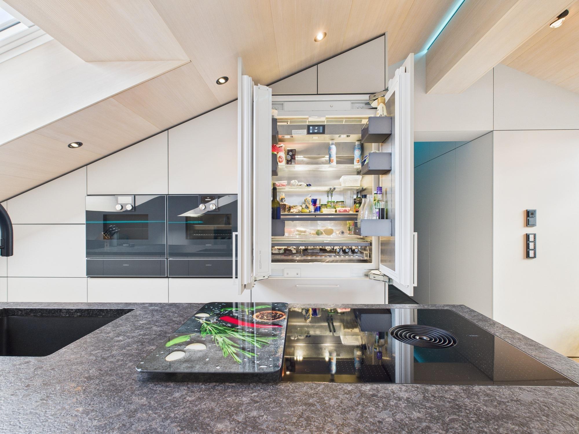 Wer eintritt, erkennt sofort die Handschrift eines kuratierten Interieurs: die Maßküche als skulpturales Statement mit Gaggenau-Ausstattung, der offene Kamin als ruhender Mittelpunkt, Fischgrätböden mit souveräner Gelassenheit. In den Bädern wird die Stille fast haptisch – Großformate, präzise Fugen, im Dampfbad Blattgold als leiser Akzent, im Gäste-WC eine markante Elefantenhaut-Optik. Überall Einbauten aus regionaler Schreinerarbeit, bündig geführt, mit Schattenfugen inszeniert – Ordnung, die nicht erzieht, sondern befreit.