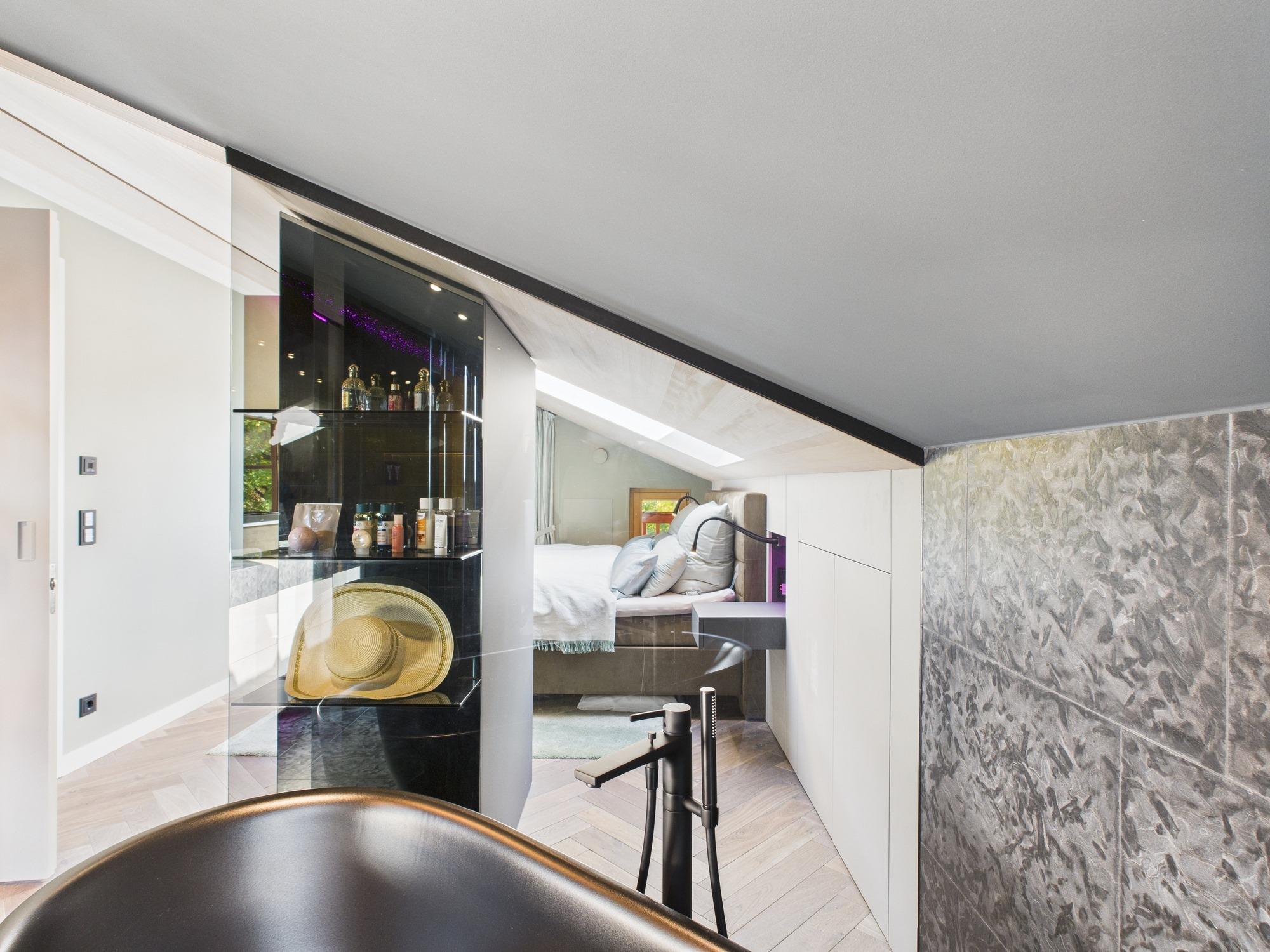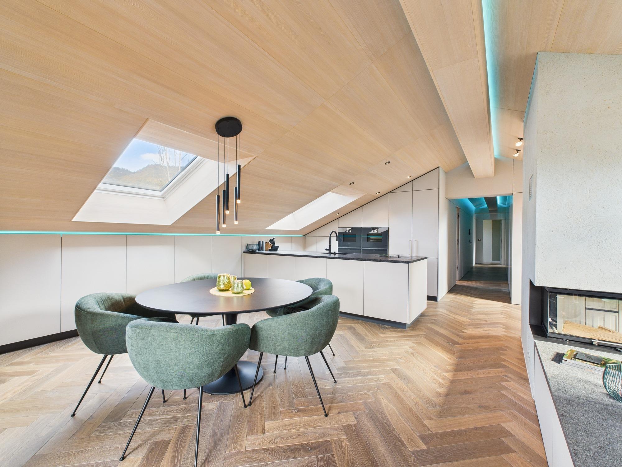Zwischen See und Himmel, dort wo Rottach-Egern seine eleganteste Ruhe entfaltet, öffnet dieses Dachgeschoss die Tür zu einem Lebensgefühl, das man nicht beschreibt – man spürt es. Ein Zuhause wie eine Partitur: klar komponiert, präzise gesetzt, in jedem Takt von Handwerk und Material getragen. Die Architektur bleibt zurückhaltend, damit die Wertarbeit im Vordergrund steht: wandgleiche Türen, bündige Linien, gedämpfte Übergänge. Nichts Zufälliges. Alles gewollt.