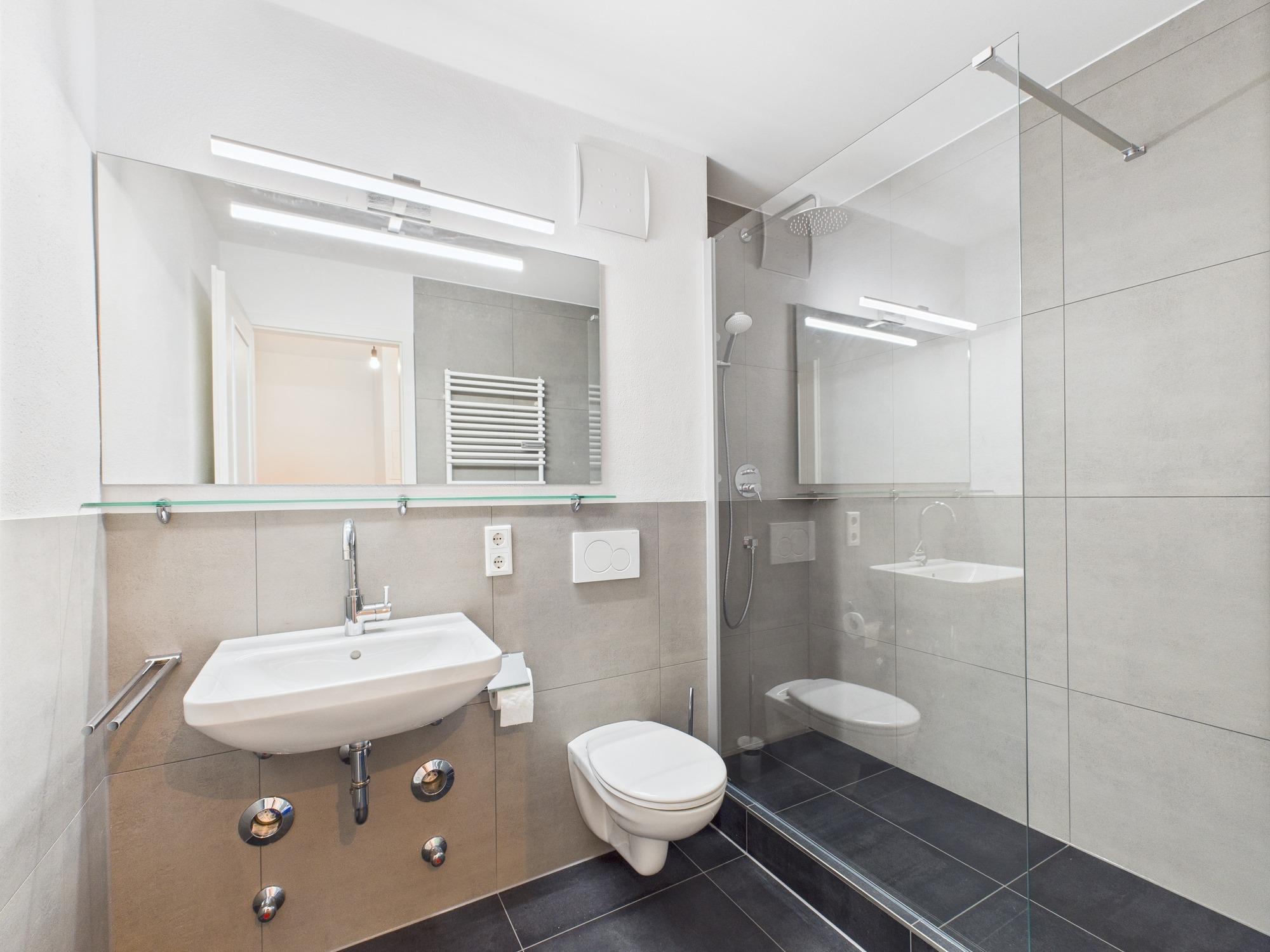 - Badezimmer mit Walk-In-Dusche, Handwaschbecken und WC.