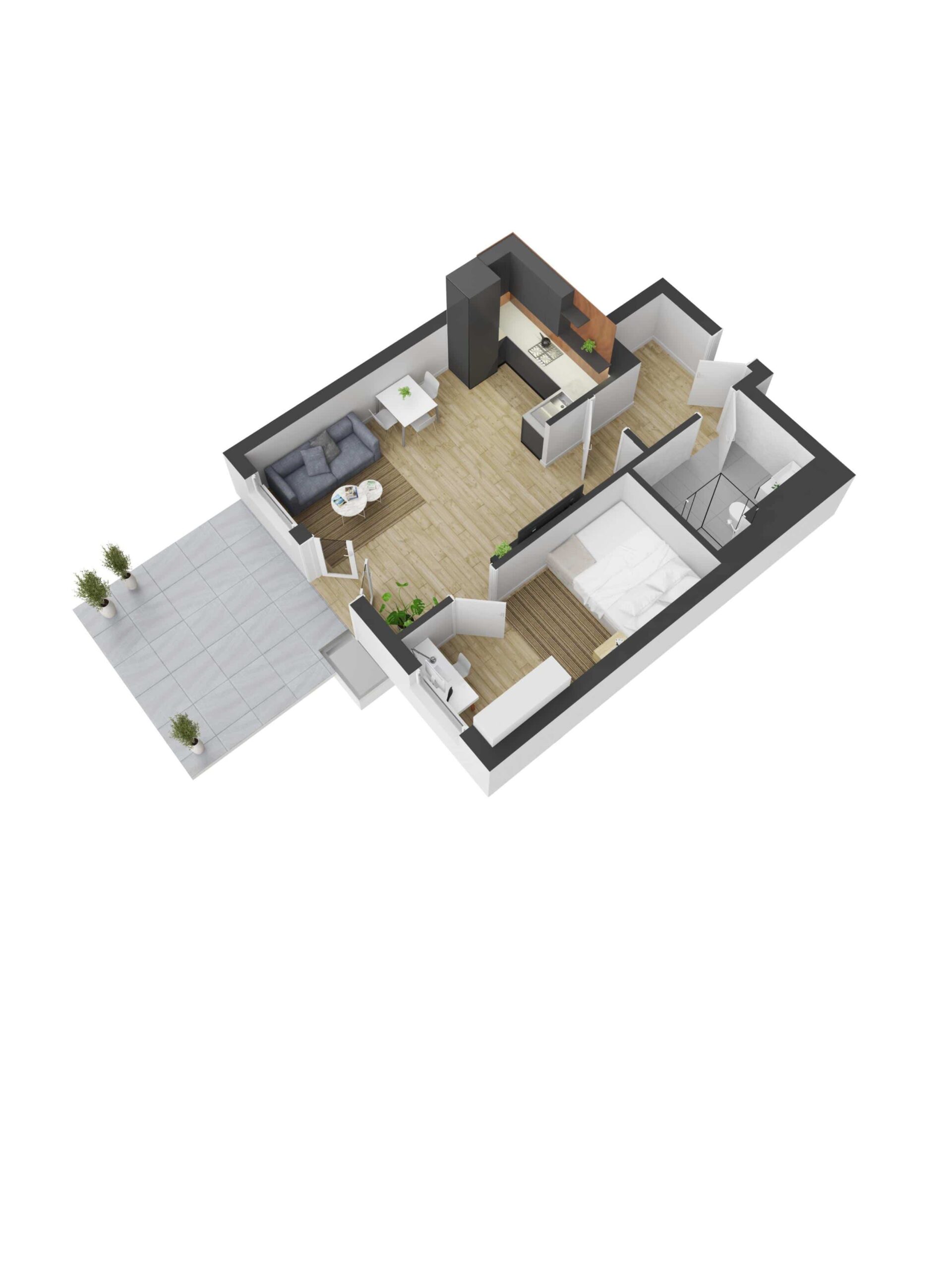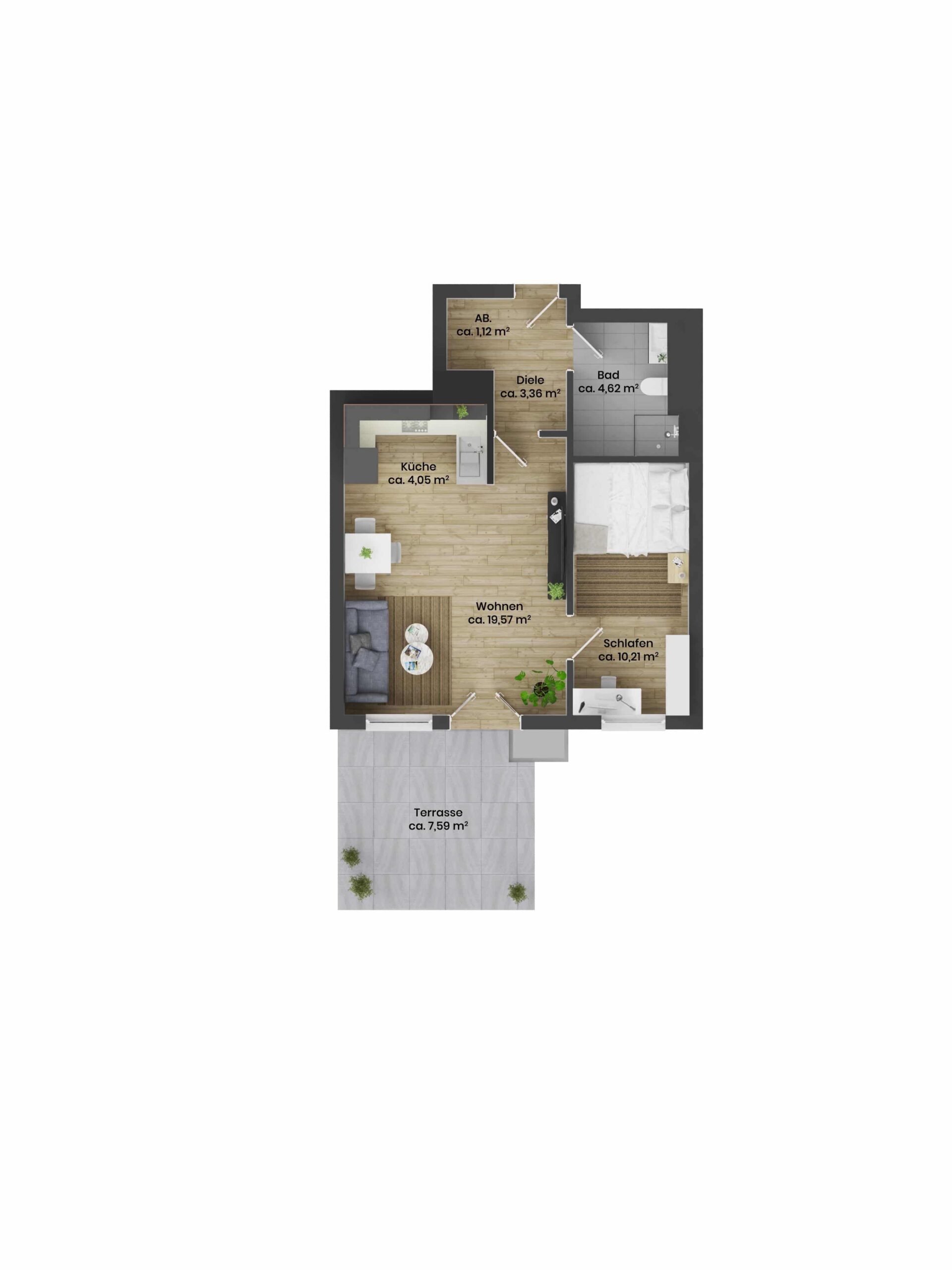 -Gesamtwohnfläche ohne Terrassenanteil ca. 42,93 m², zzgl. Terrasse ca. 7,59 m²