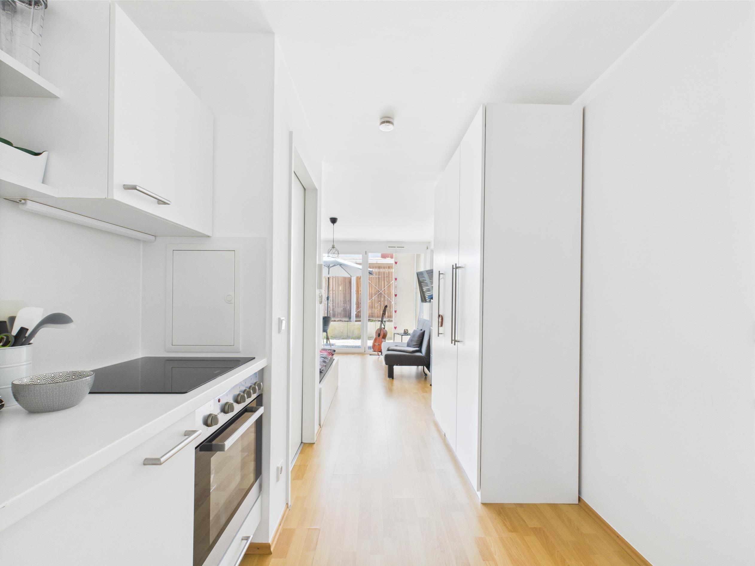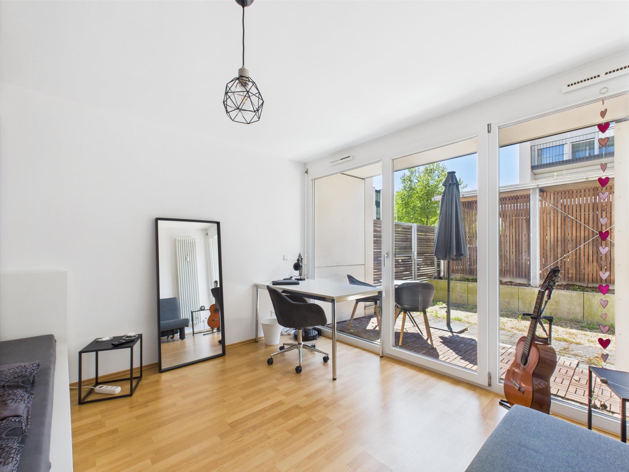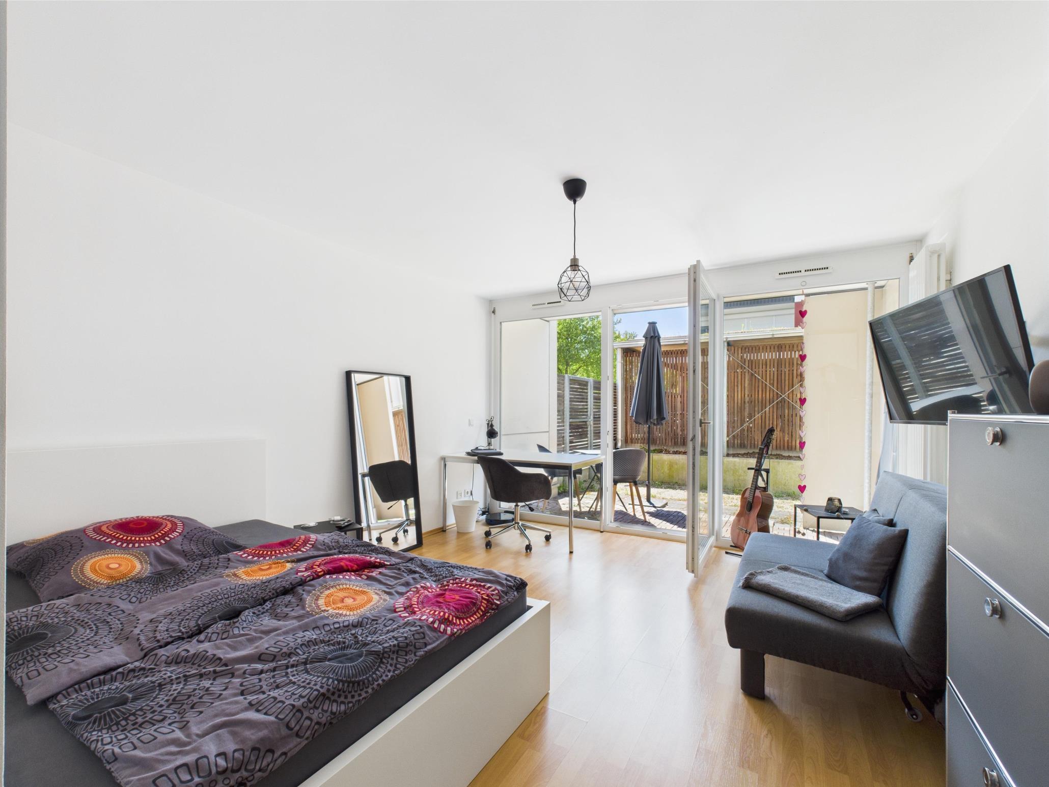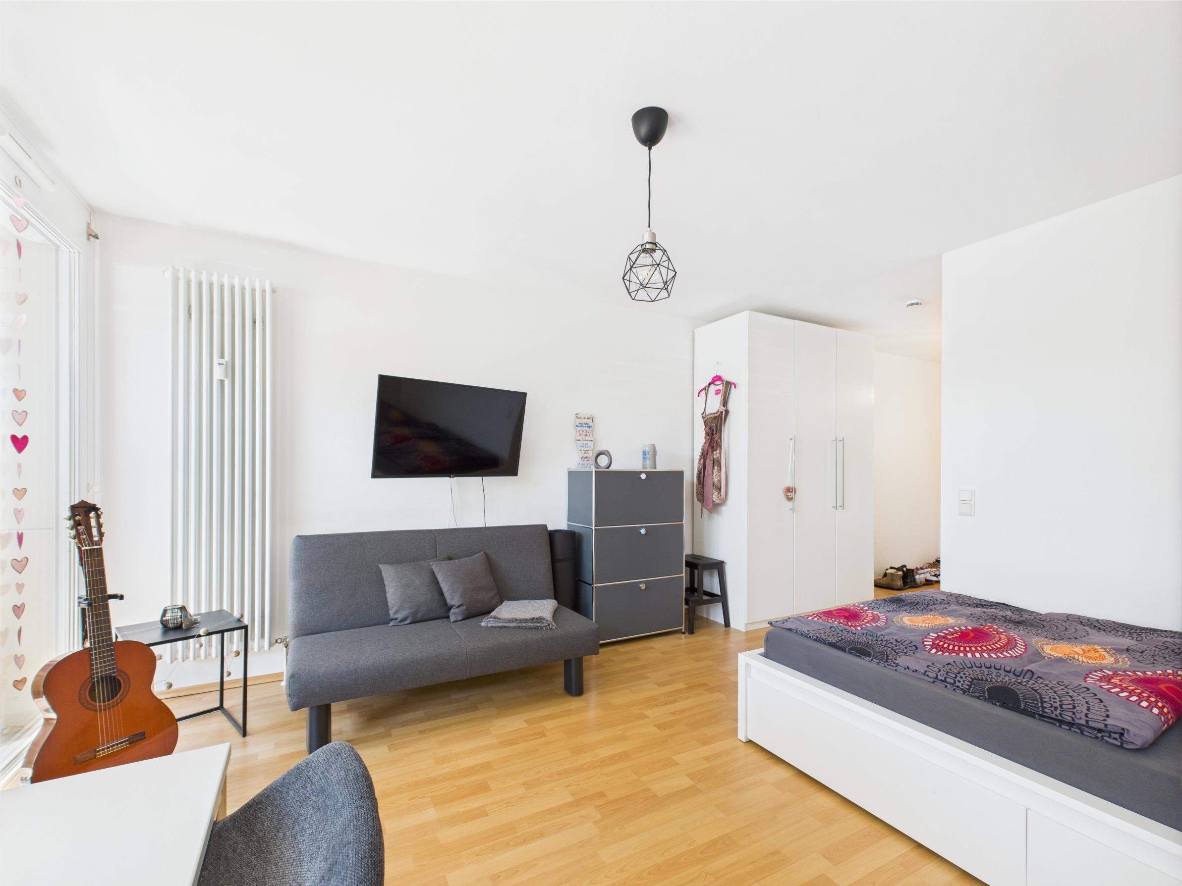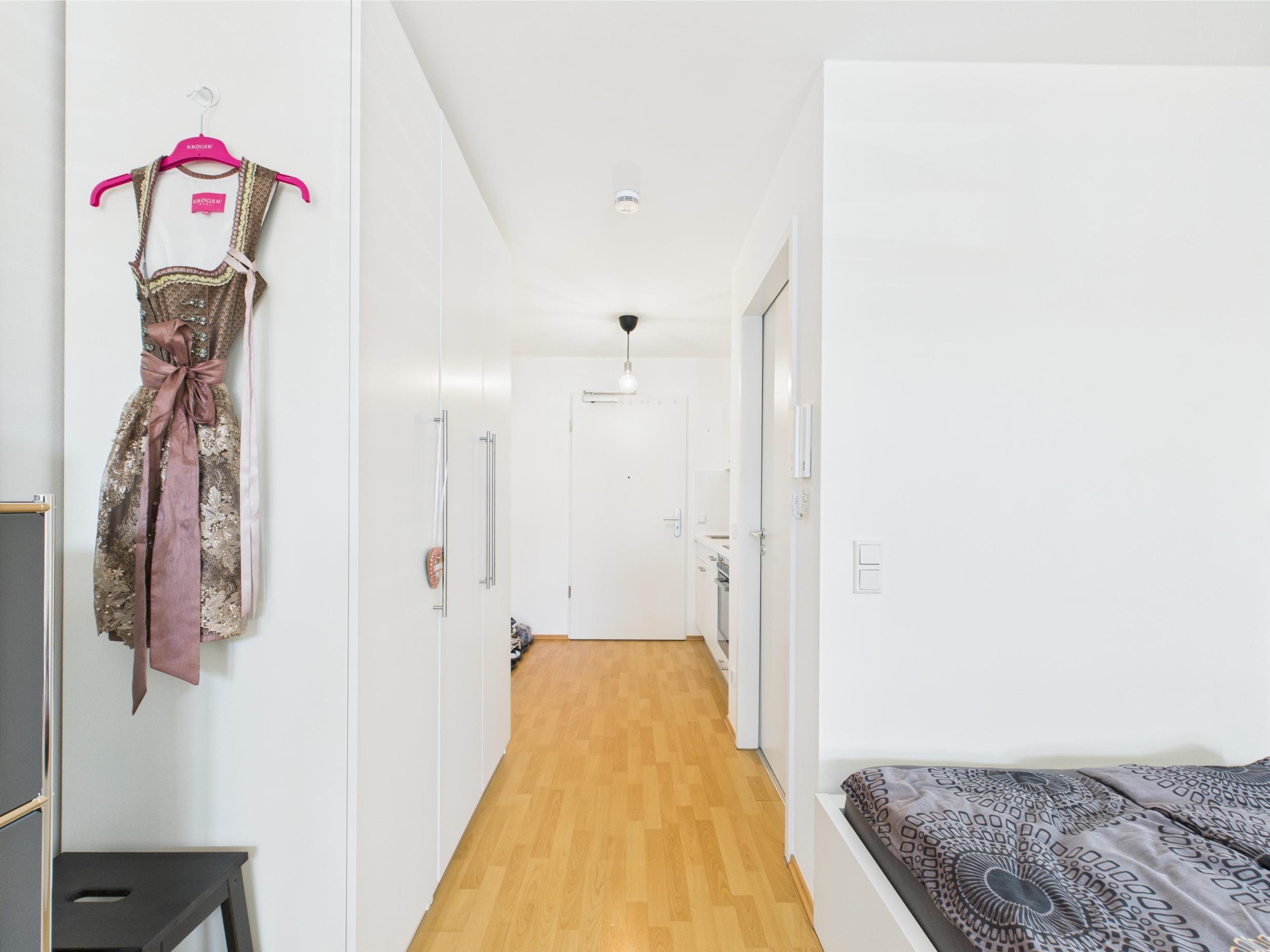 Der offen gestaltete Wohnraum bietet ausreichend Platz zum Wohnen, Schlafen und Arbeiten. Große Fensterflächen lassen viel Tageslicht herein und sorgen für ein helles, freundliches Wohnambiente. Die Fenster sind mit Rollläden ausgestattet und sorgen so für zusätzlichen Komfort und Schutz. Der Boden ist mit ansprechendem Laminat ausgelegt. Eine praktische Küchenzeile ist bereits integriert, ebenso wie ein modernes Duschbad mit Fußbodenheizung.