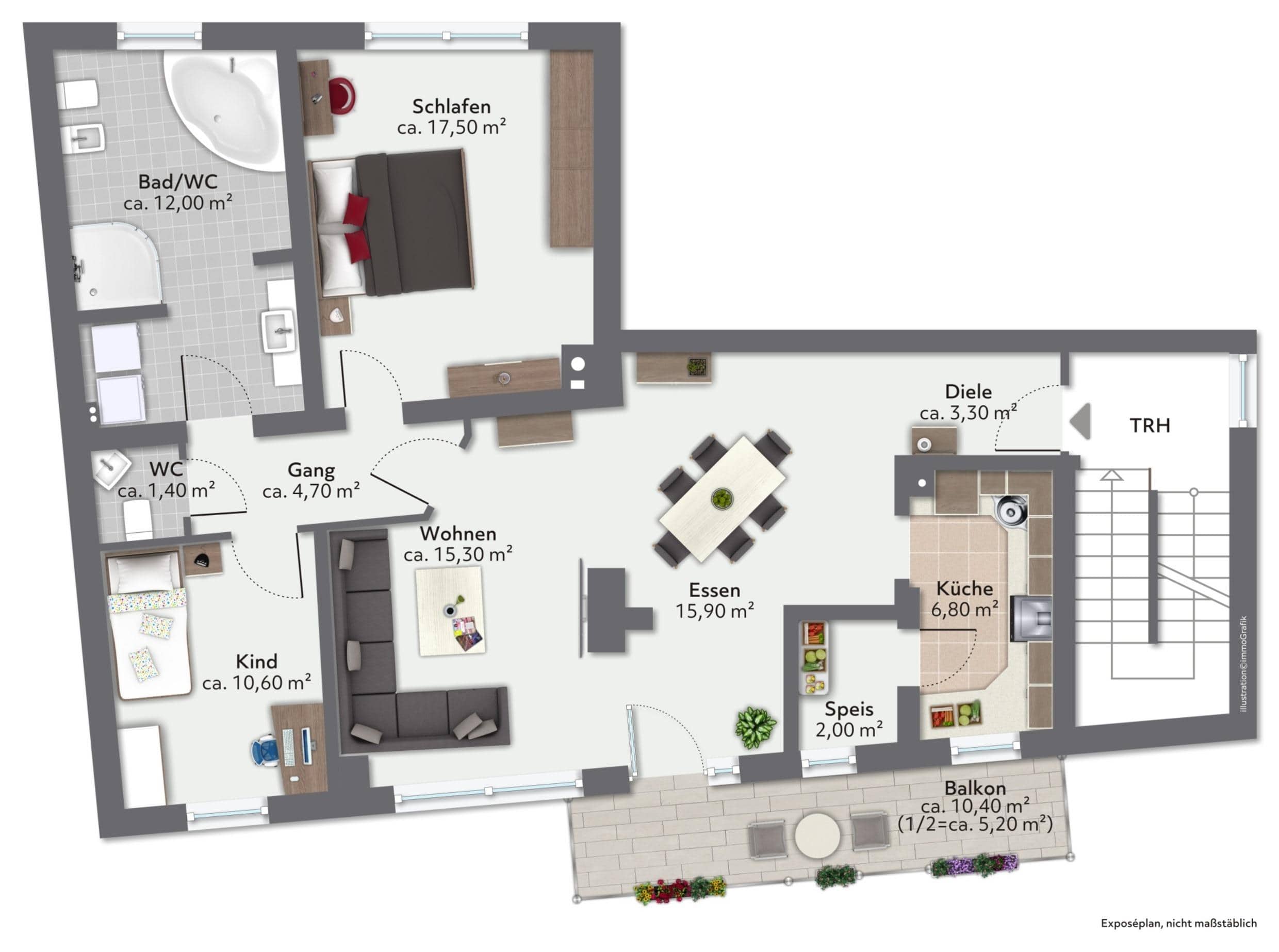 Die in den Grundrissen und Visualisierungen dargestellten Möbel sind nur ein Einrichtungsvorschlag und nicht Gegenstand dieses Angebots.