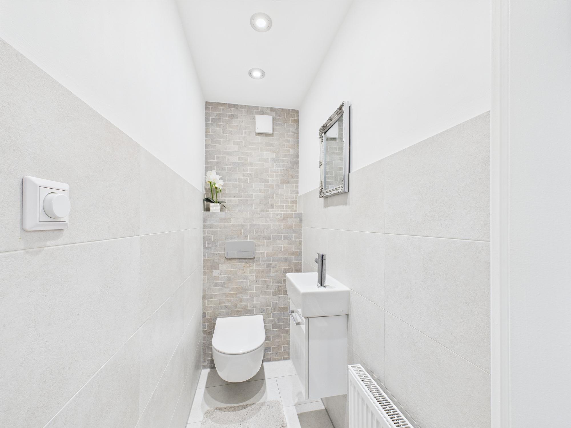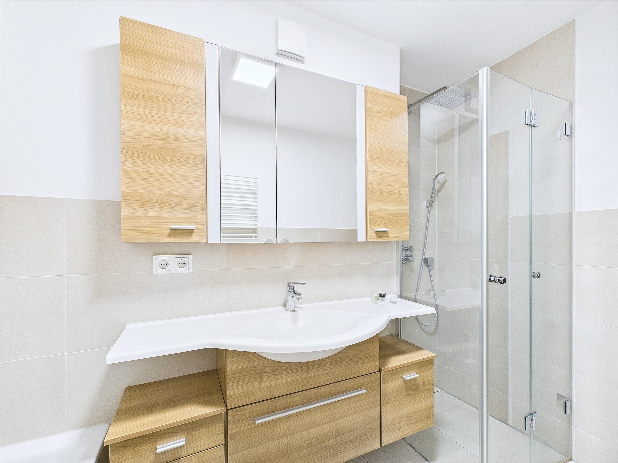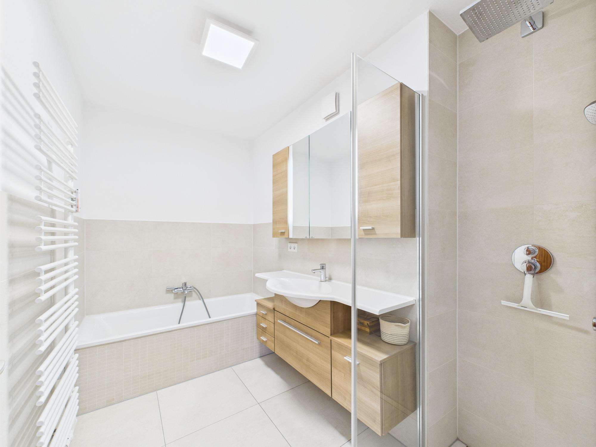 Vom Flur aus sind alle weiteren Räume direkt zugänglich, zuerst das separate WC. Dieses wurde – gemeinsam mit dem Badezimmer – im Jahr 2020 vollständig renoviert. Das Badezimmer verfügt über eine bodengleiche Raindance-Dusche, eine Badewanne, ein großflächiges Waschbecken sowie eine Handtuchheizung.