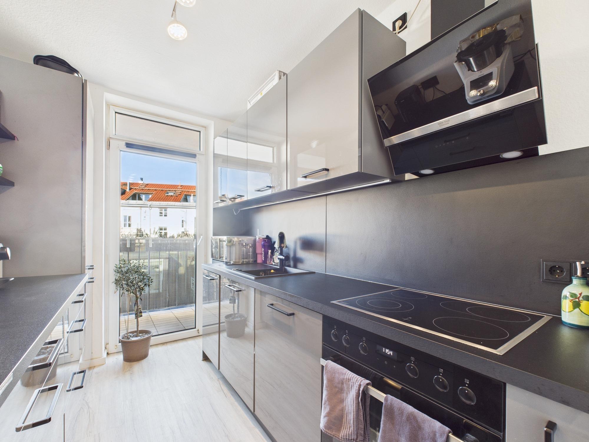Im Inneren erwartet Sie ein großzügiger Eingangsbereich mit Platz für eine elegante Garderobe. Der Flur öffnet sich zur Küche, von der Sie direkten Zugang zum Balkon mit Nordwestausrichtung haben. Dieser blickt in den ruhigen Innenhof und auf das Rückgebäude der Hausnummer 12. Ob ein Glas Wein bei Sonnenuntergang oder der erste Kaffee am Morgen, dieser Balkon wird schnell zu Ihrem Lieblingsplatz.