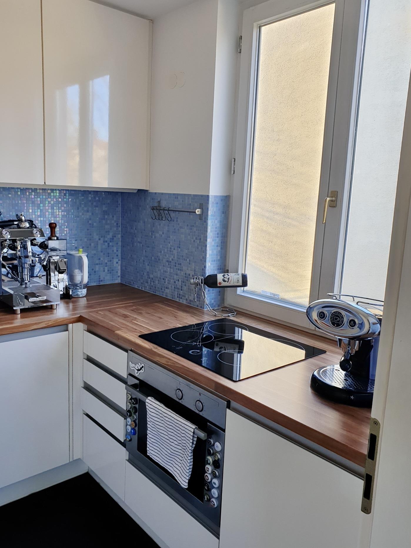 Ein besonderes Highlight ist die separierte Küche mit Fenster, die ganztägig von natürlichem Licht durchflutet wird. Die stilvolle Einrichtung und die moderne Einbauküche mit Cerankochfeld, Backofen, Spülmaschine und großem Kühlschrank laden zu kulinarischen Momenten ein.