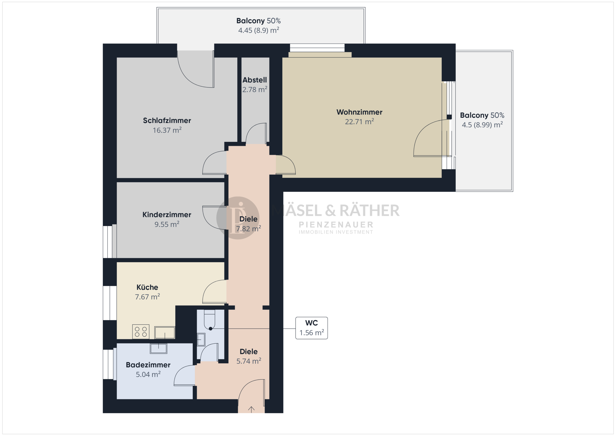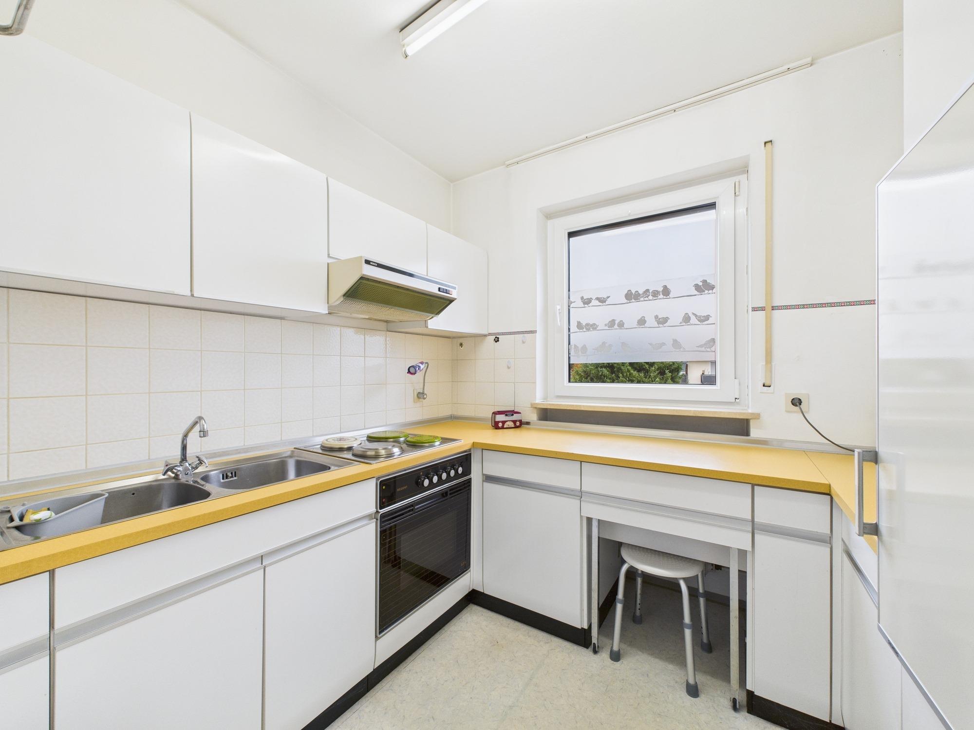 Die Küche ist derzeit mit einer funktionalen Einbauküche ausgestattet, die auf Wunsch durch eine moderne Variante ersetzt werden kann. Das Tageslicht-Badezimmer überzeugt mit einer besonderen ebenerdig zugänglichen Badewannen-/Duschkombination und Platz für die Waschmaschine. Das separate WC im Eingangsbereich sowie ein praktischer Abstellraum bieten zusätzlichen Komfort.