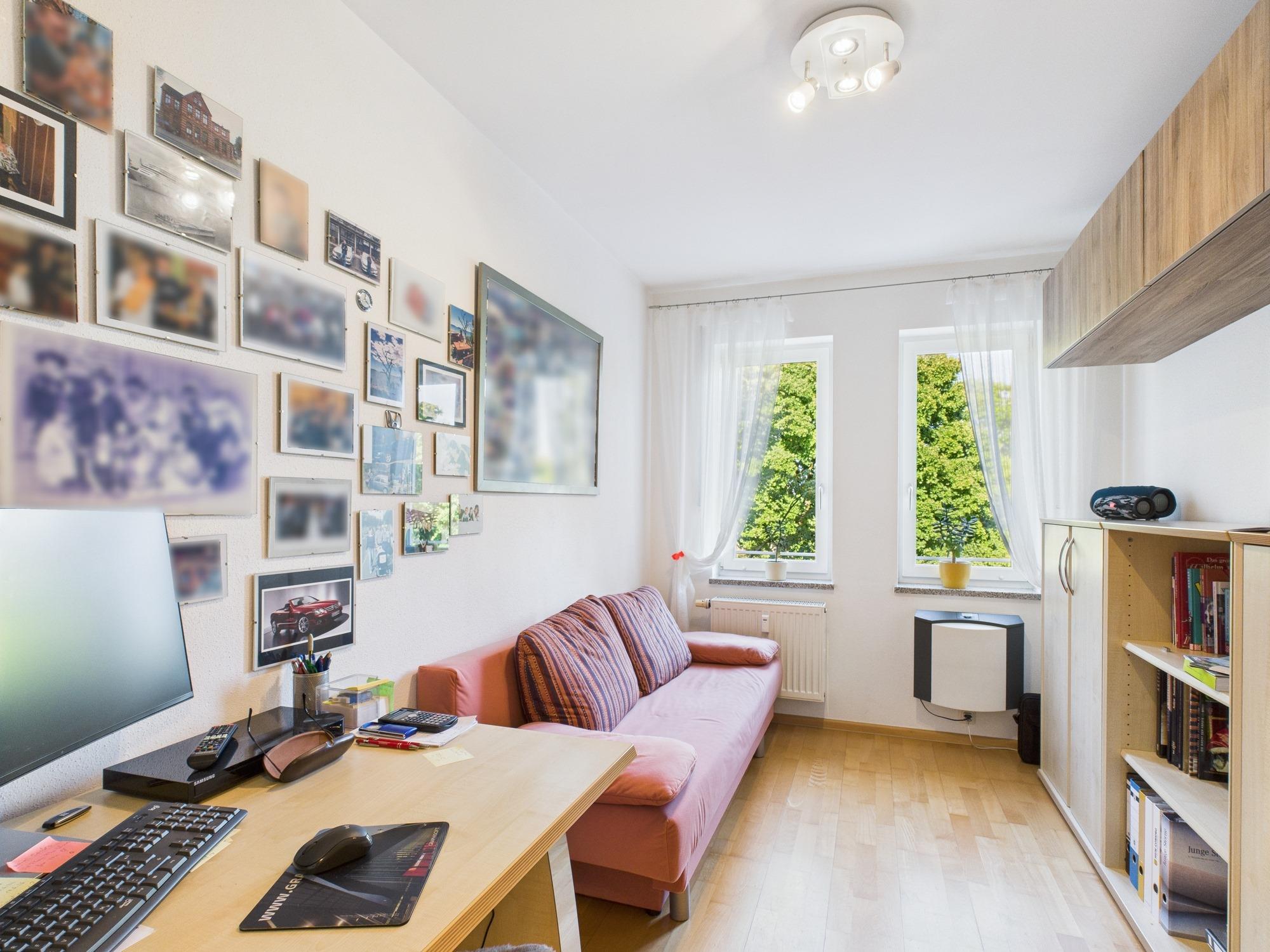 Die Diele eröffnet den Zugang zu einem flexibel nutzbarem Zimmer, das sich ideal als Arbeits-, Gäste- oder Kinderzimmer eignet. Das Schlafzimmer selbst empfängt Sie mit großen Fensterflächen, die viel Licht und eine angenehme Atmosphäre bieten.