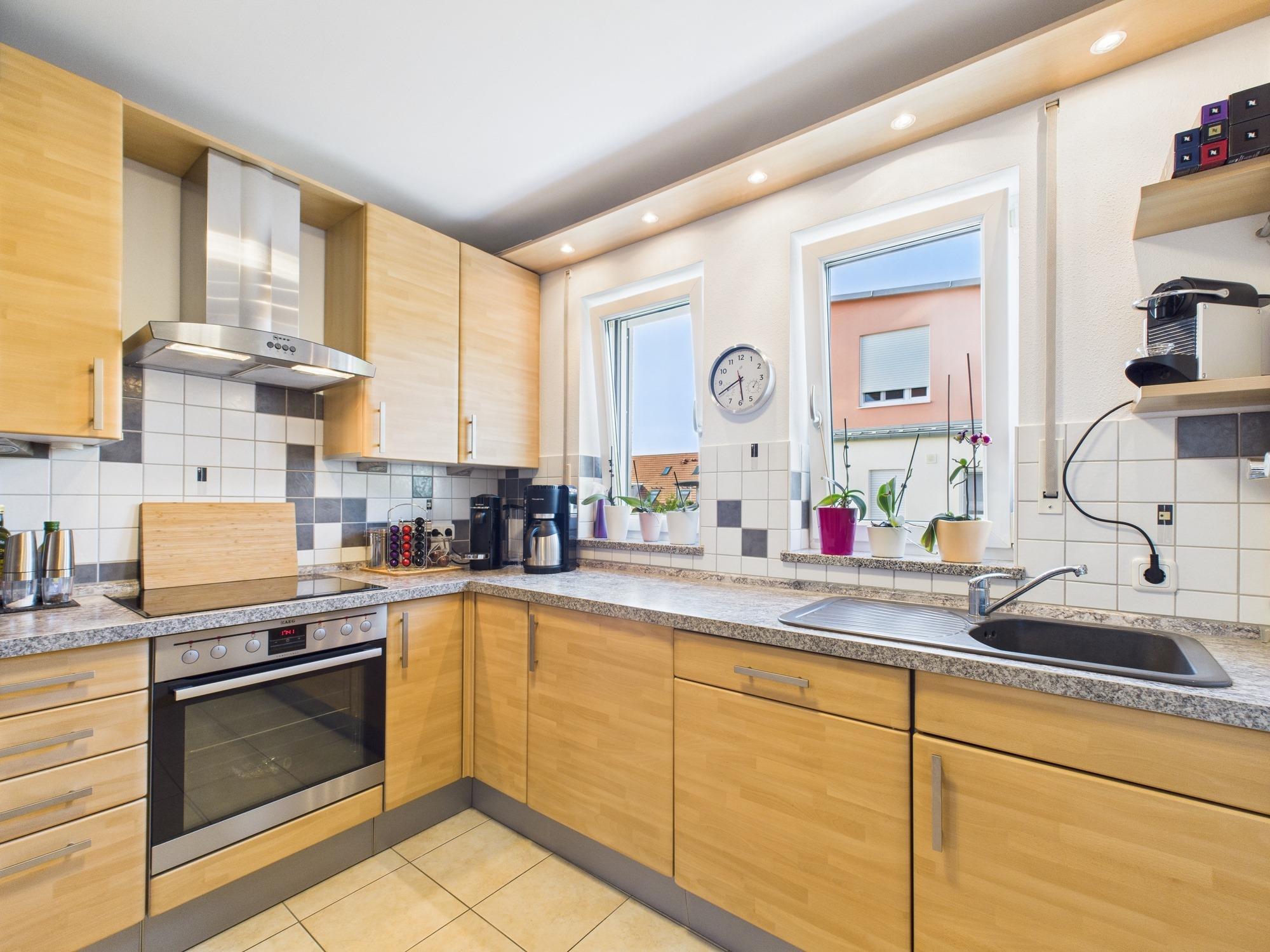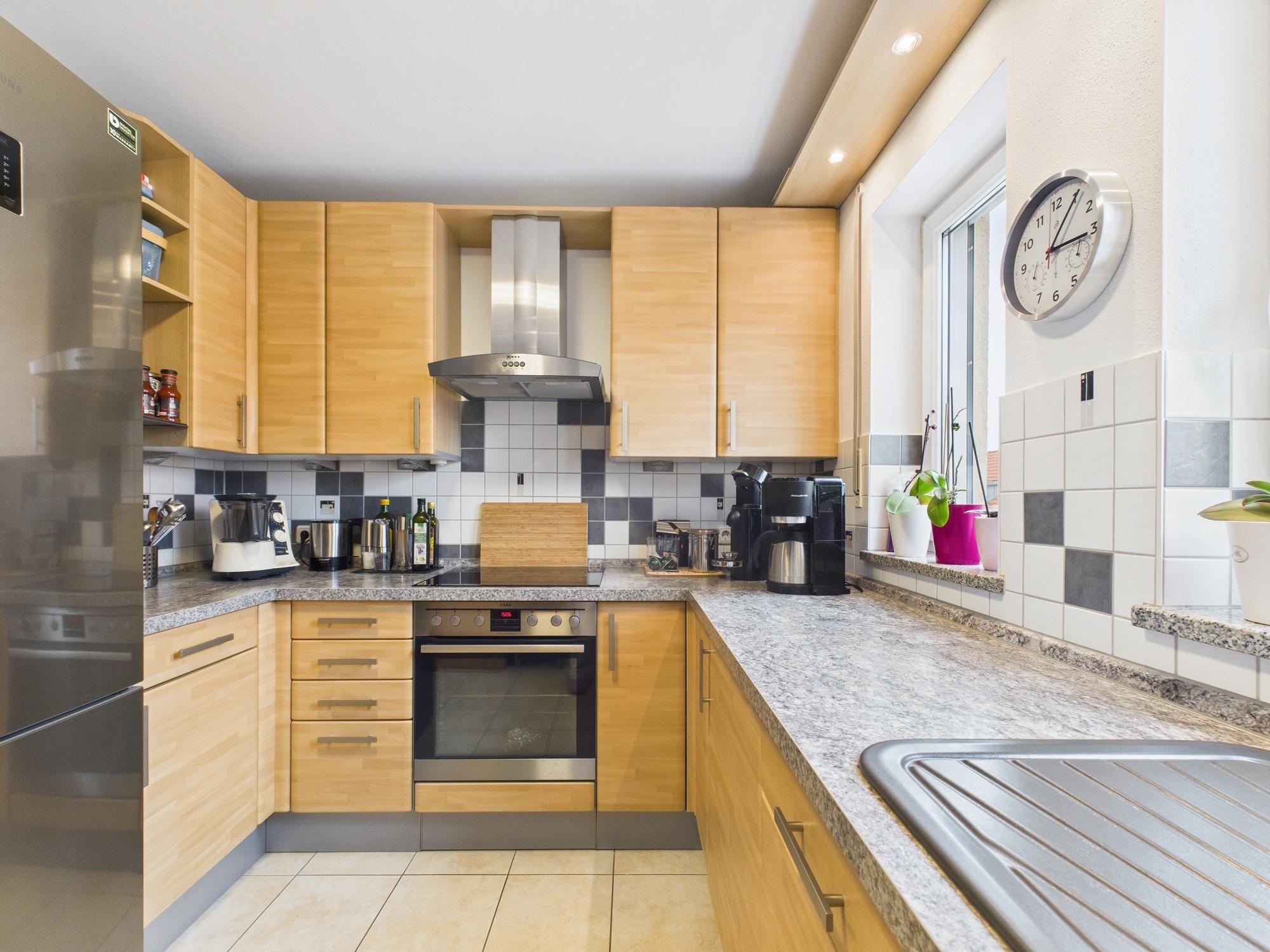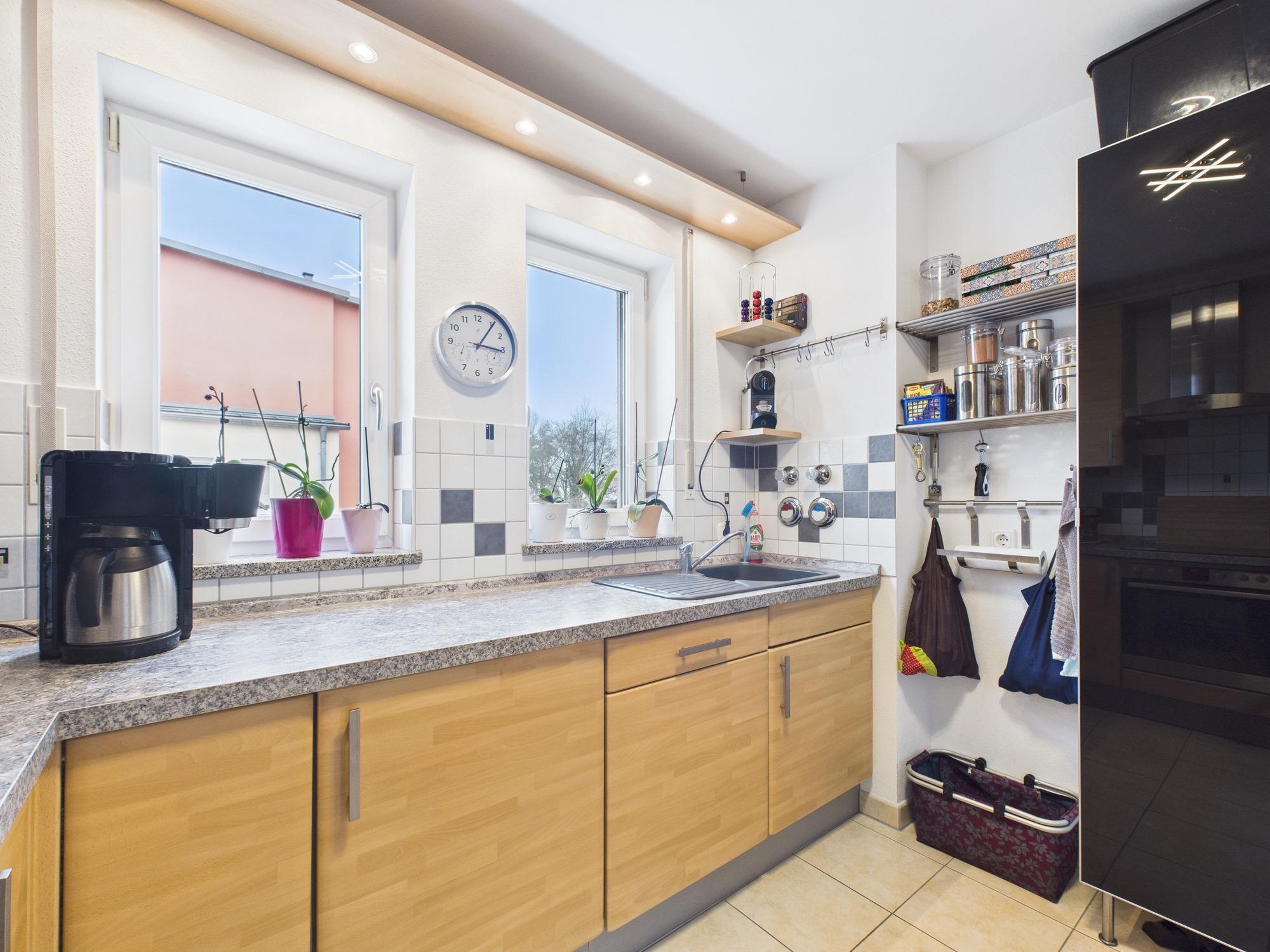Die moderne Küche in ansprechender Holzoptik fügt sich harmonisch in das Gesamtbild der Wohnung ein. Ihr helles, zeitloses Design schafft eine einladende Umgebung, in der Kochen und Genießen gleichermaßen Freude bereiten.
