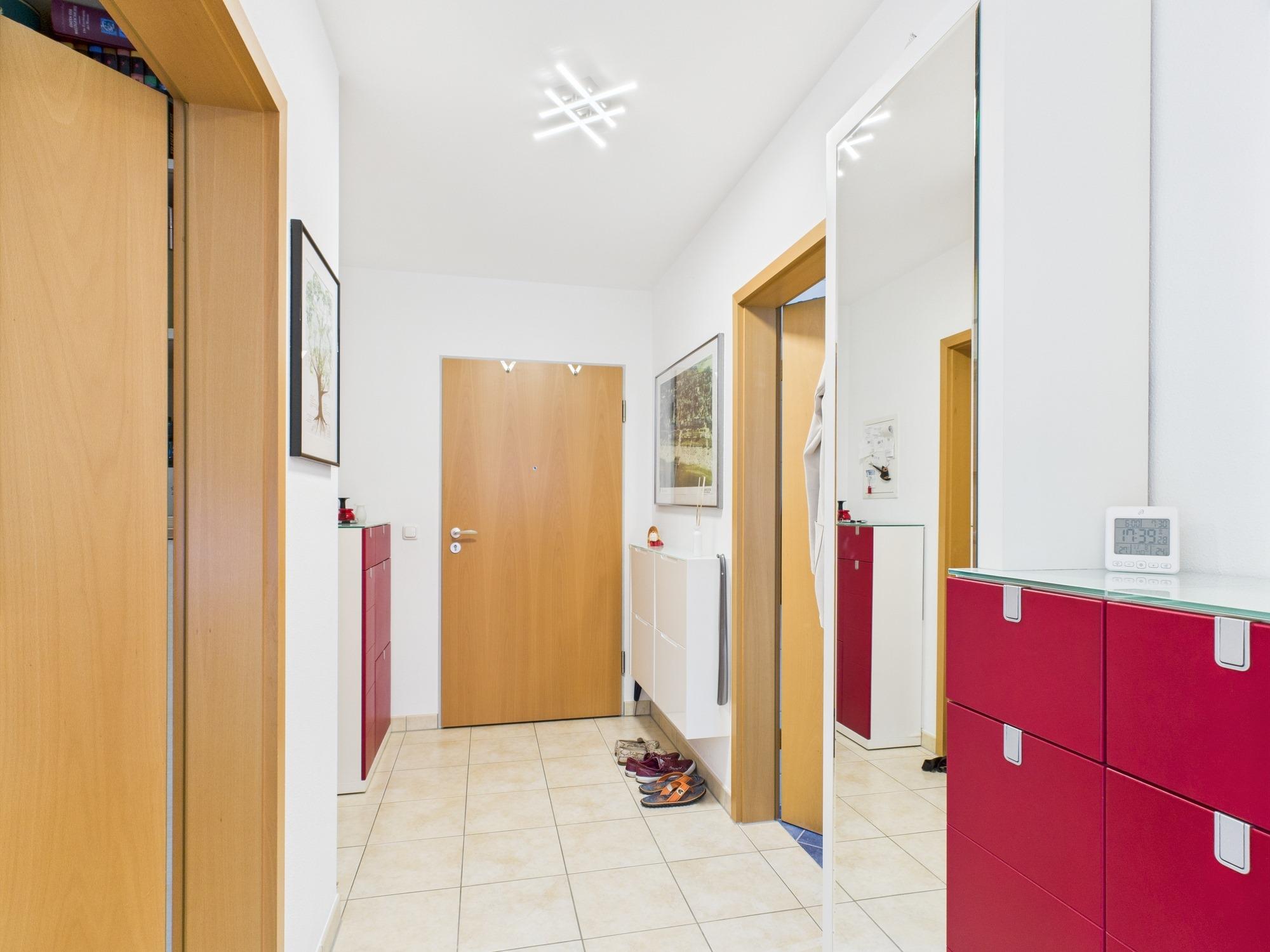 Schon beim Eintreten empfängt Sie eine großzügige Diele mit hellen, zeitlosen Fliesen, die einen freundlichen ersten Eindruck vermittelt. Von hier aus erreichen Sie bequem das modern gestaltete Badezimmer sowie das separat gelegene WC. Das Badezimmer überzeugt mit einer gelungenen Kombination aus großzügiger Dusche und komfortabler Badewanne – ideal für entspannte Auszeiten im Alltag.