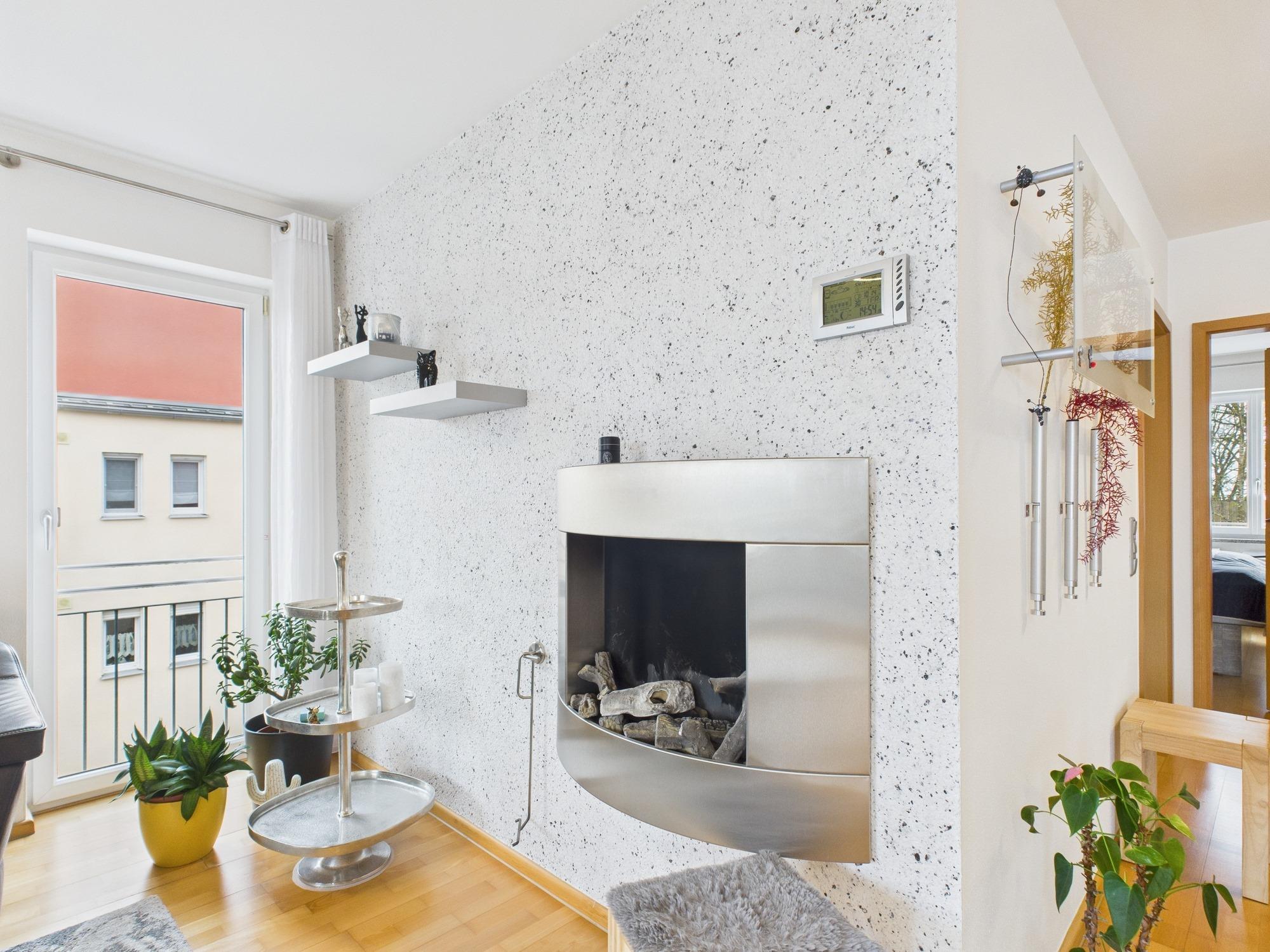 - Baumwollfaserbeschichtung an der Kaminwand im Wohnzimmer
