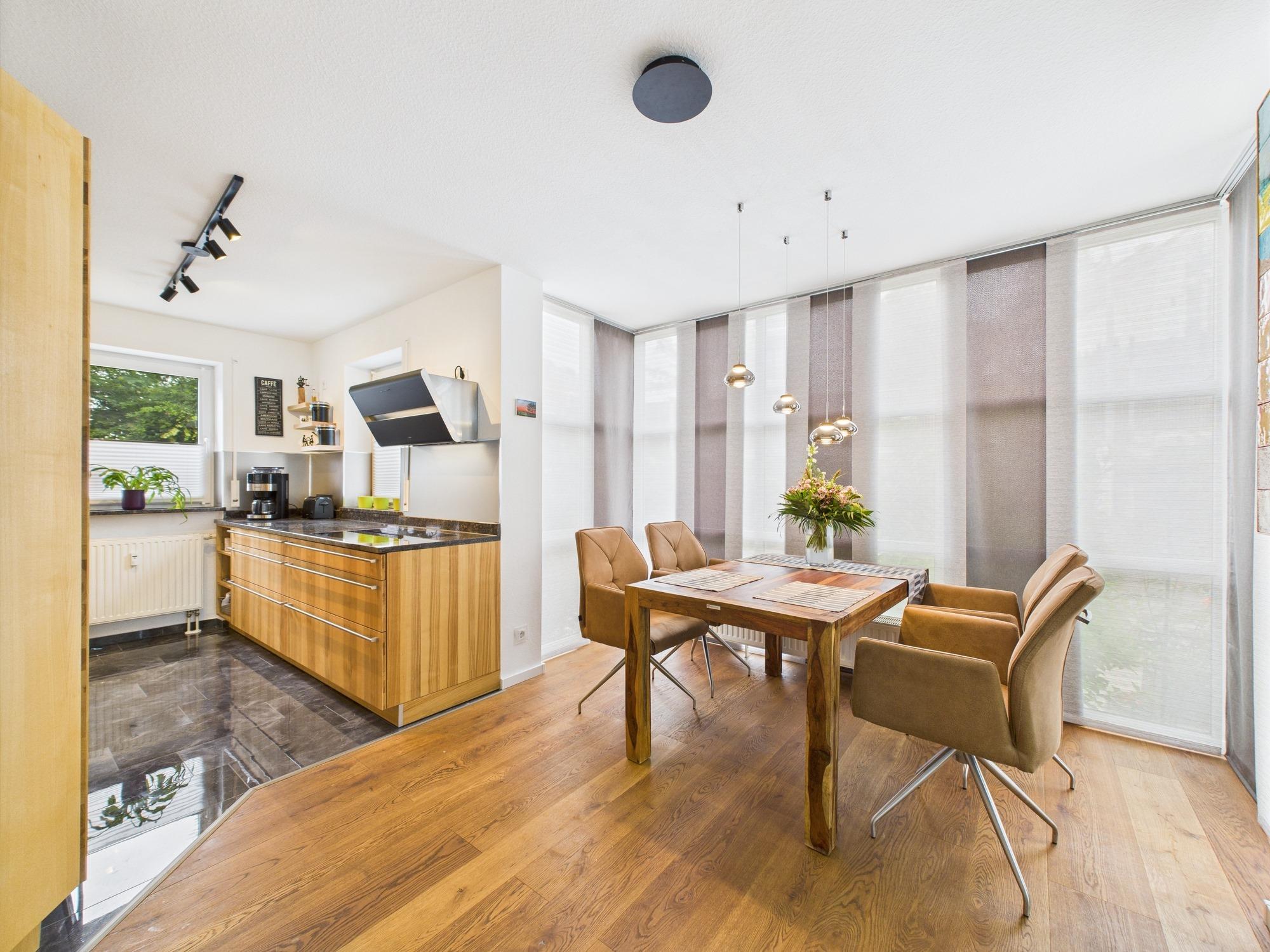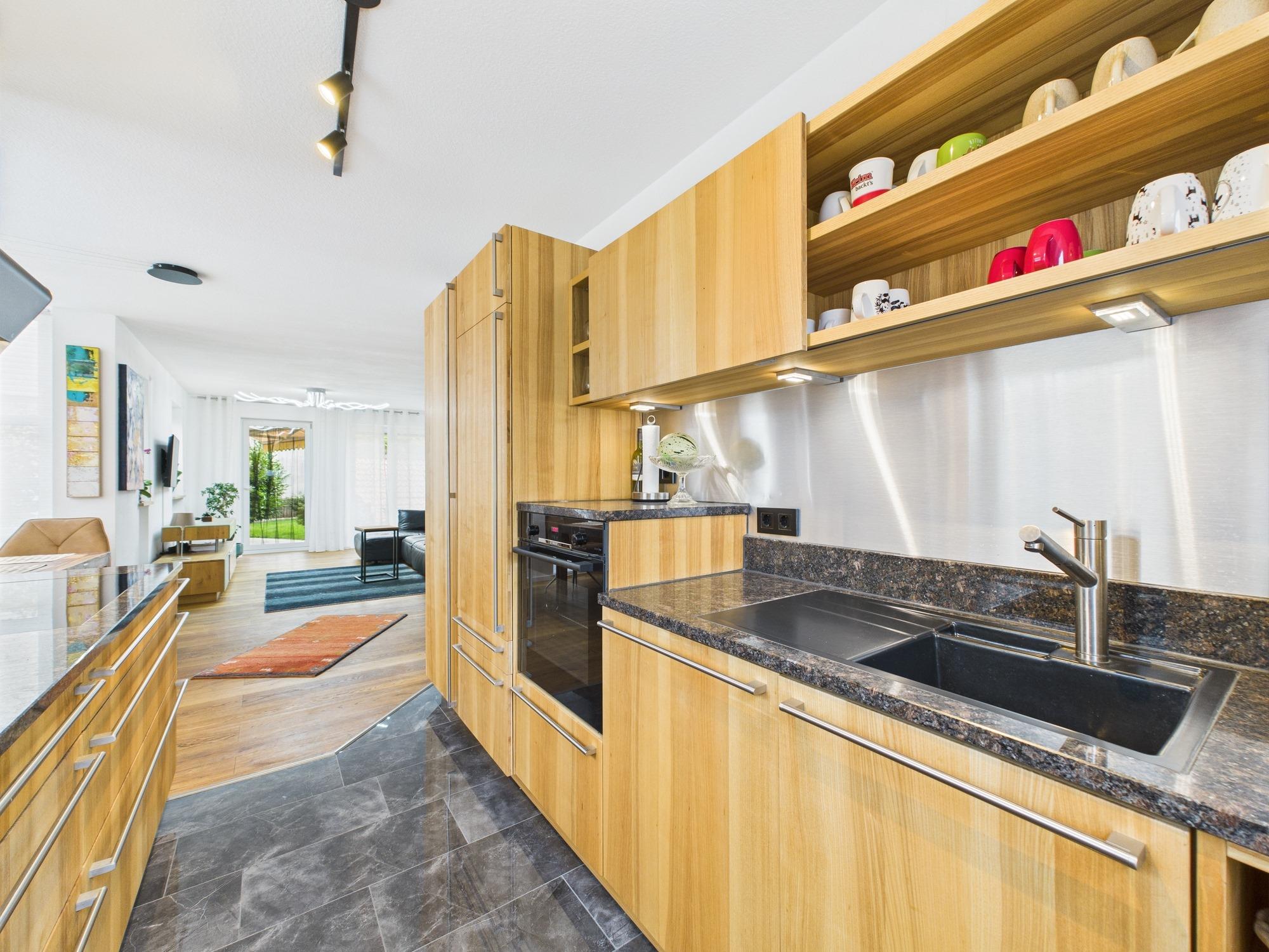 Ein weiteres Highlight ist die maßgefertigte Einbauküche im offenen Wohnbereich. Mit einem Investitionswert von rund 40.000 € lässt sie in Sachen Qualität, Funktionalität und Design keine Wünsche offen. Hochwertige Elektrogeräte, durchdachte Stauraumlösungen und stilvolle Oberflächen machen diese Küche zum Herzstück der Wohnung – perfekt für alle, die gerne kochen und genießen.