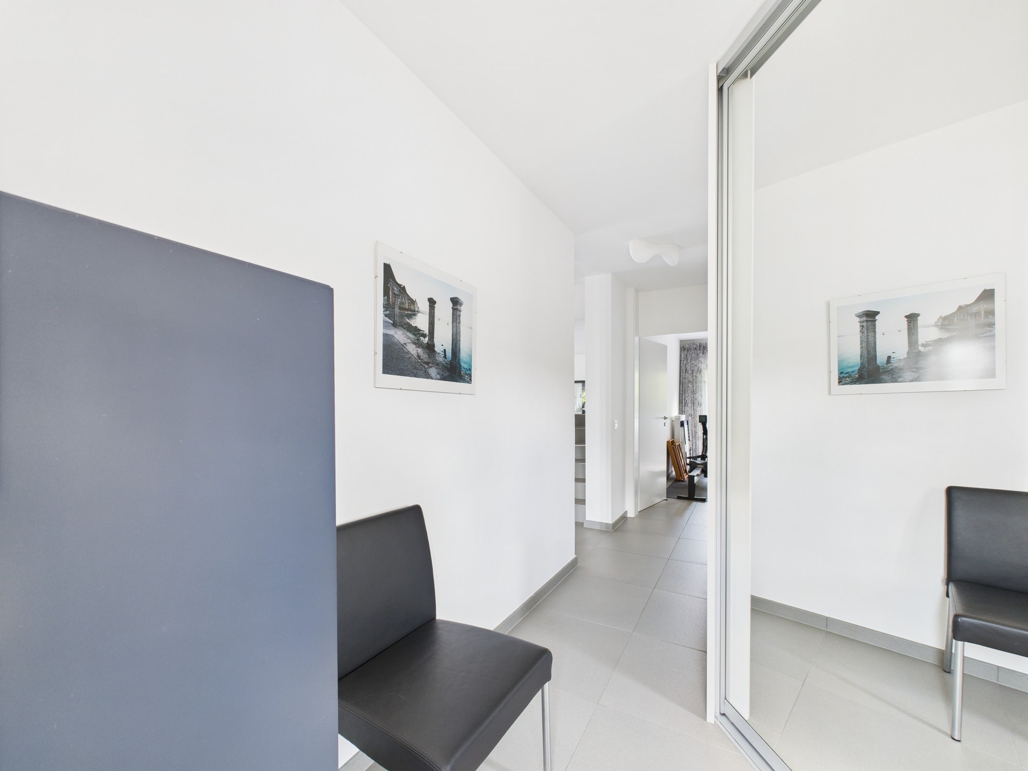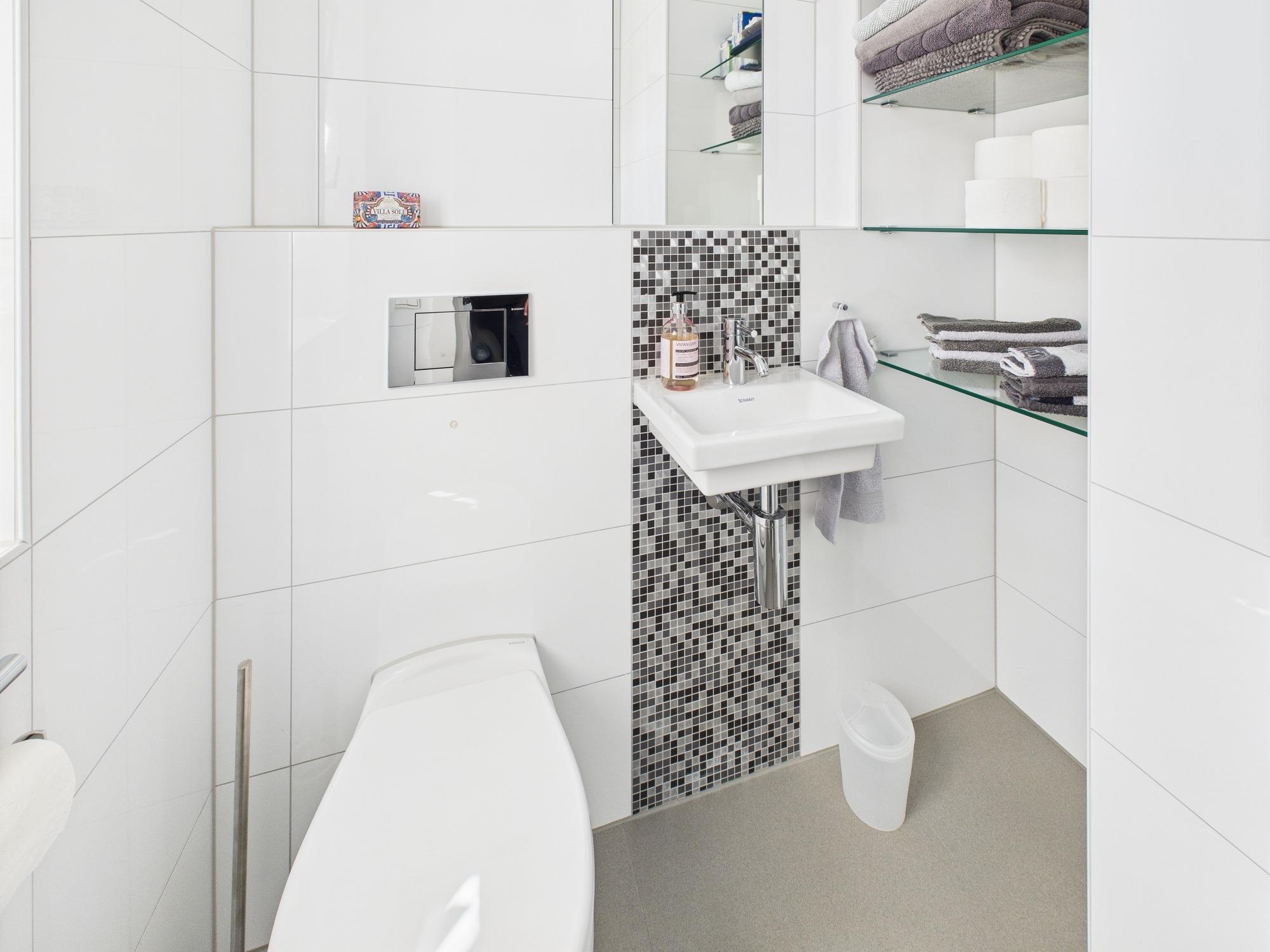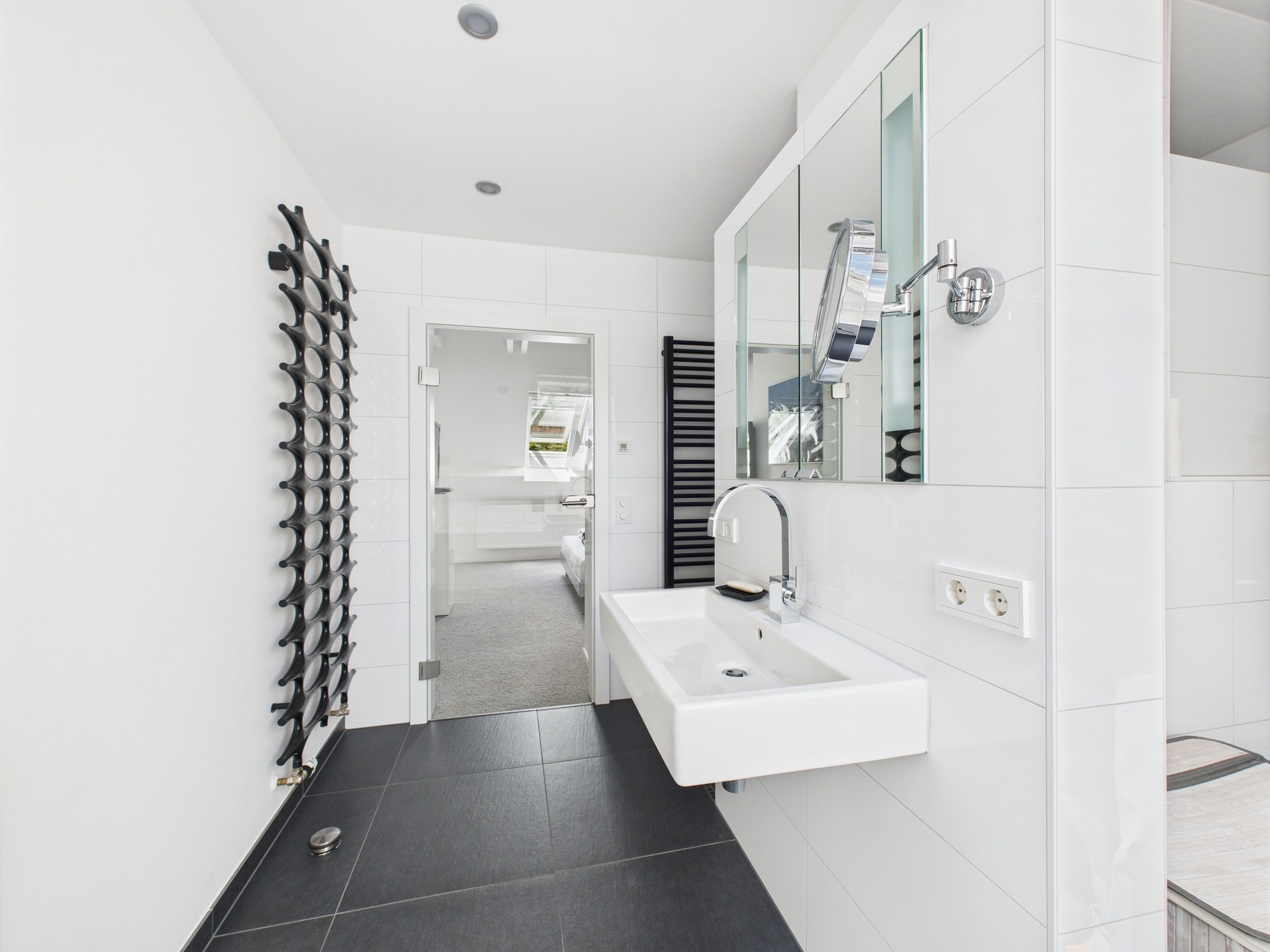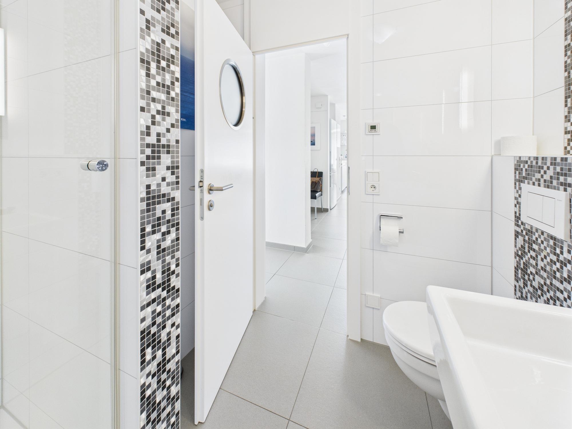- Zwei voll ausgestattete Bäder: Obergeschoss: Bad mit Dusche, WC, elektrischer Fußbodenheizung Dachgeschoss: Bad mit bodengleicher Raindance-Dusche, Badewanne, WC, schwarzem Handtuchheizkörper, elektrischer Fußbodenheizung