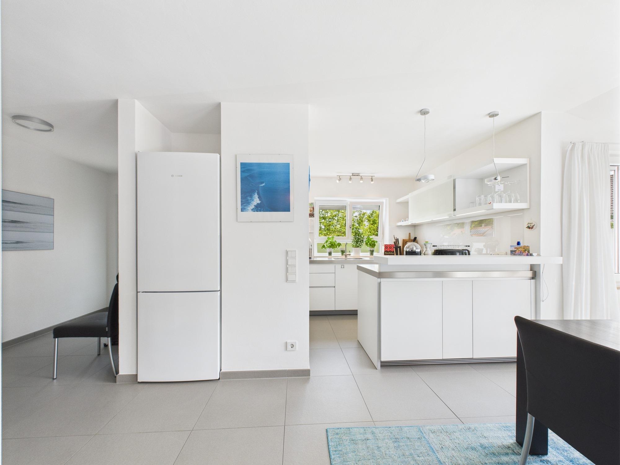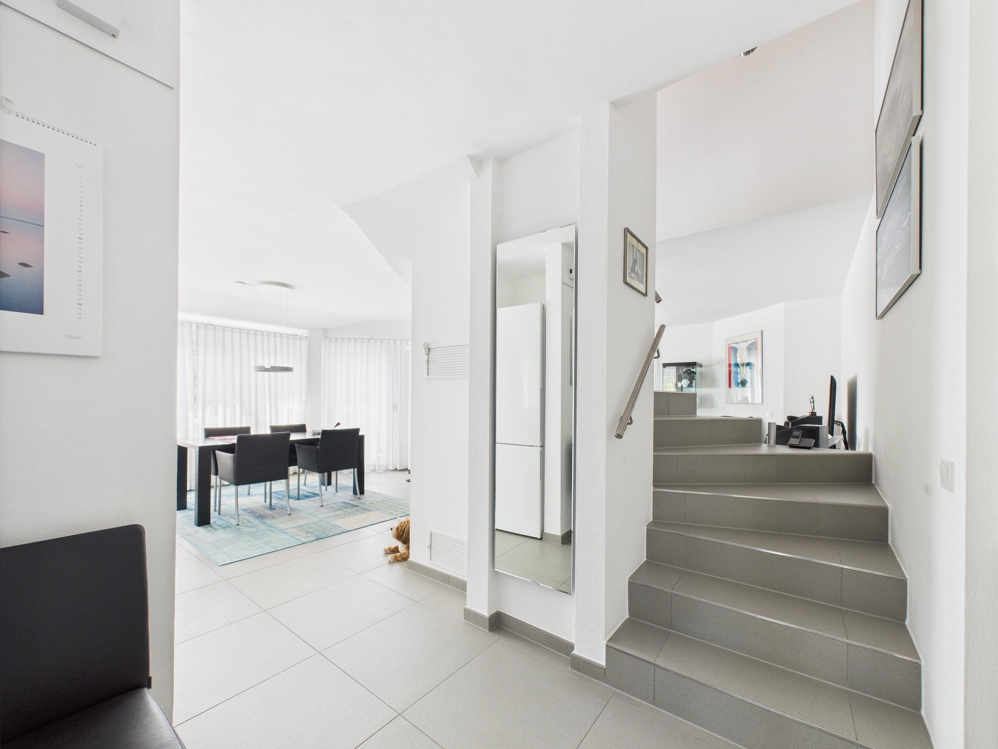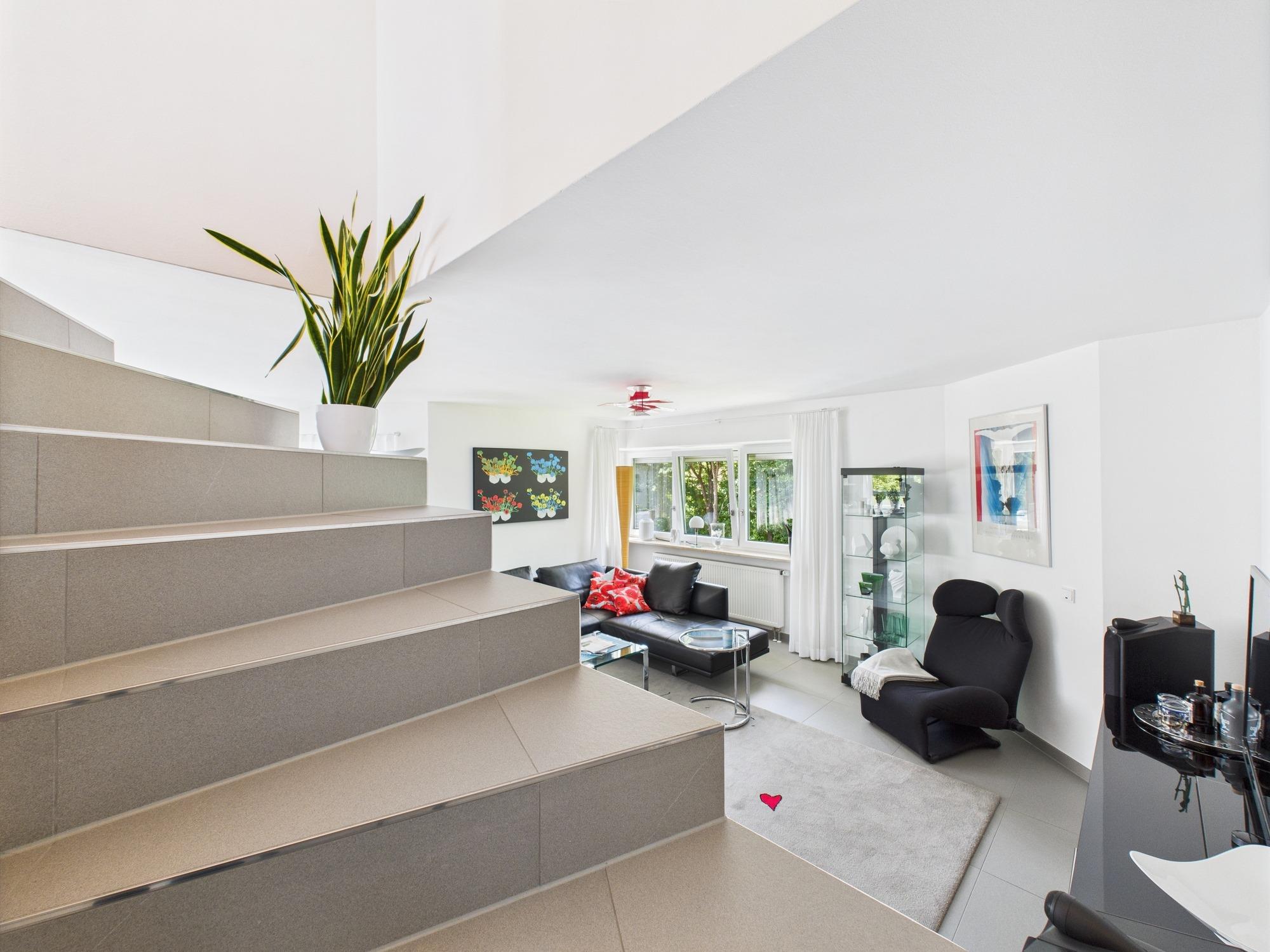 Die 1979 erbaute Wohnung wurde 2011 umfassend saniert und um ein hochwertig ausgebautes Dachgeschoss ergänzt. Im unteren Bereich (1. Obergeschoss) befinden sich ein Gäste-WC, ein Badezimmer mit Dusche, Handwaschbecken und elektrischer Fußbodenheizung sowie zwei Schlafzimmer – eines mit Zugang zum Westbalkon. Der helle Wohn-Essbereich mit gemauertem Kaminofen und Südbalkon ist offen zur Design-Küche gestaltet. Diese ist mit hochwertigen Gaggenau-Geräten ausgestattet: Induktionskochfeld mit Muldenlüfter, Dampfbackofen, Backofen mit Pyrolyse, ergonomisch erhöhter Spülmaschine und Edelstahl-Arbeitsflächen.