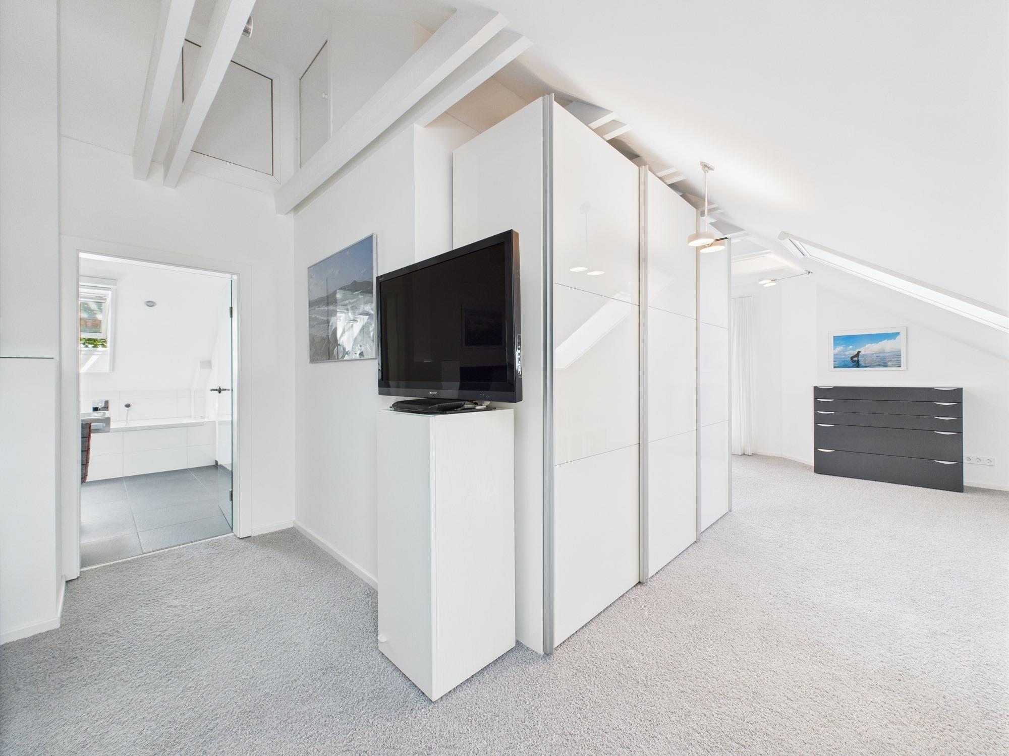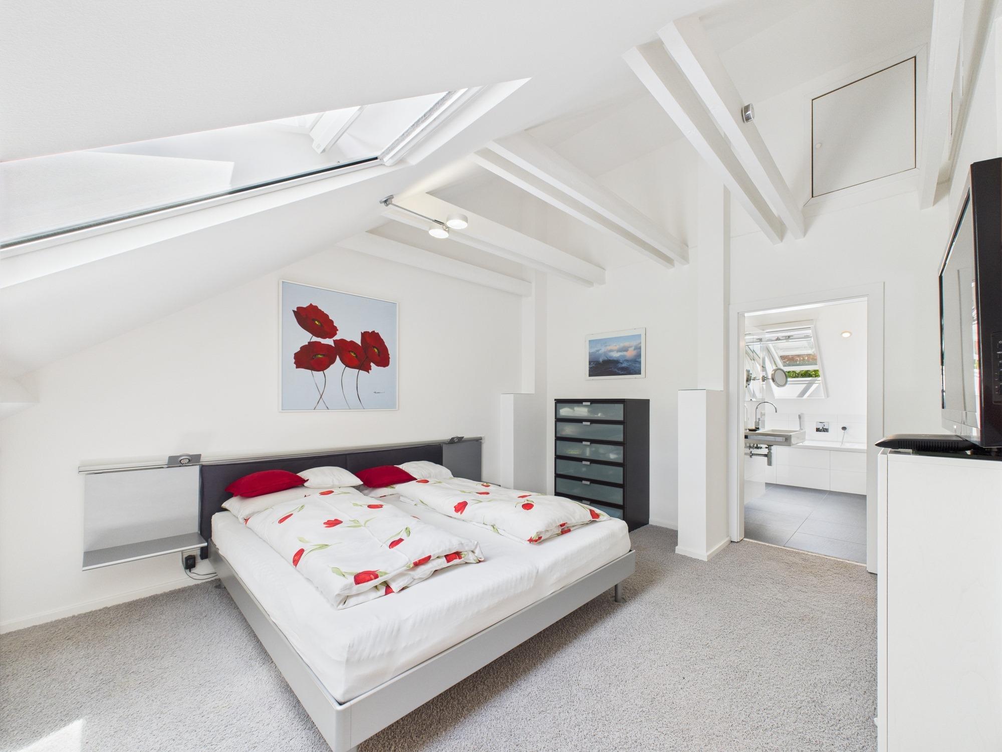 Das Dachgeschoss bietet auf rund 60 m² ein Schlafzimmer mit Arbeitsbereich, Teppichboden und fast drei Meter hohen Decken. Das großzügige Bad verfügt über eine bodengleiche Raindance-Dusche, Badewanne, WC, schwarzen Designerheizkörper, elektrischer Fußbodenheizung sowie Anschlüsse für Waschmaschine und Trockner. Vier elektrische Dachfenster mit Regensensor, Außenbeschattung und Insektenschutz sorgen für Tageslicht und höchsten Komfort.