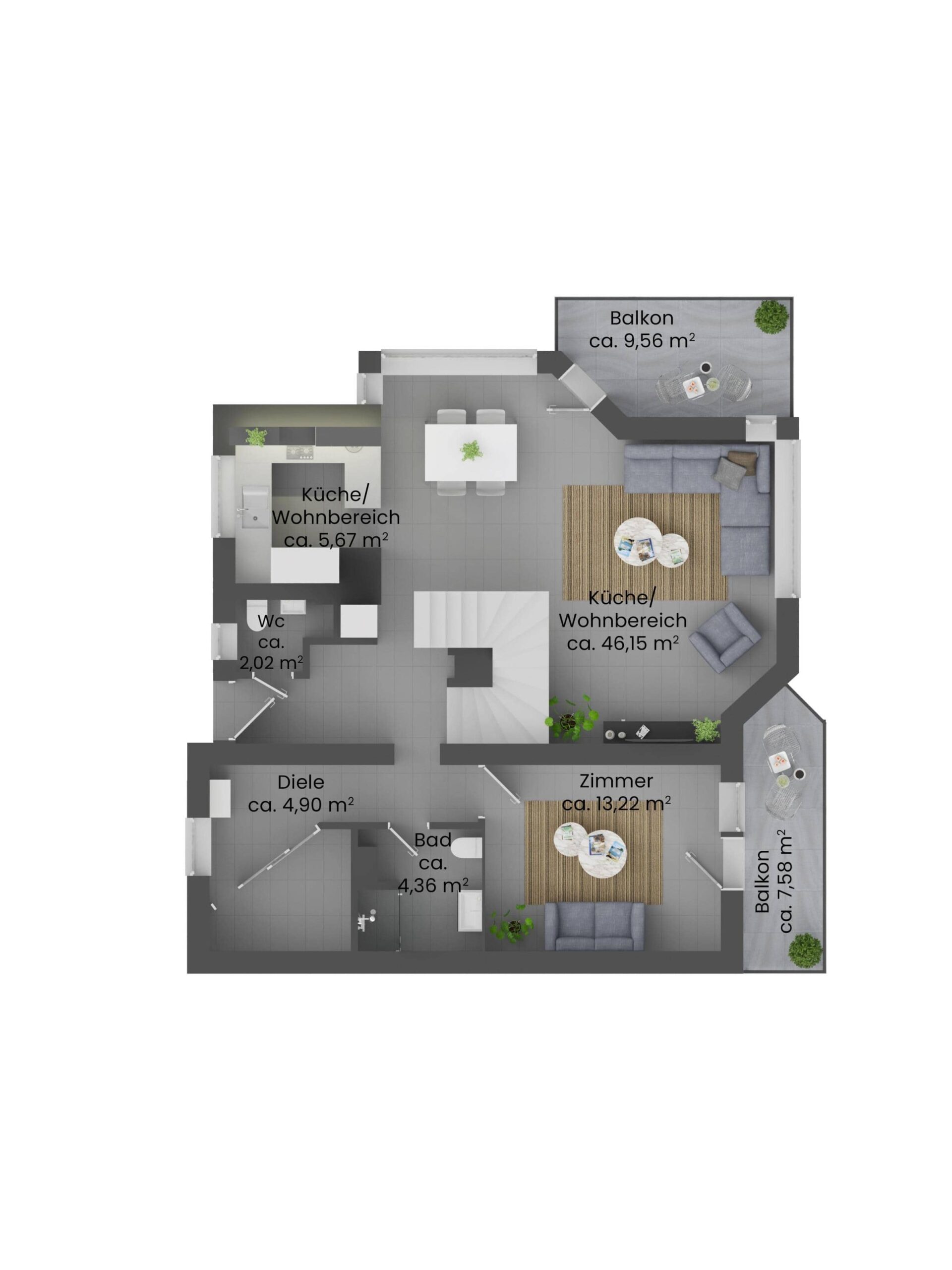 - Zwei Balkone: Südbalkon am Wohnbereich, Westbalkon am Gäste-/Kinderzimmer