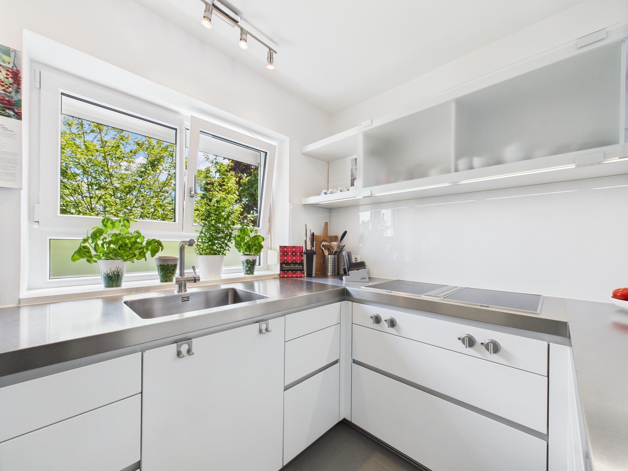 - Moderne Bulthaup Küche, offen zum Wohnbereich, ausgestattet mit: Gaggenau Induktionskochfeld mit Muldenlüfter, Dampfbackofen, Backofen mit Pyrolyse-Funktion, ergonomische Spülmaschine sowie Arbeitshöhe, Arbeitsplatten aus Edelstahl