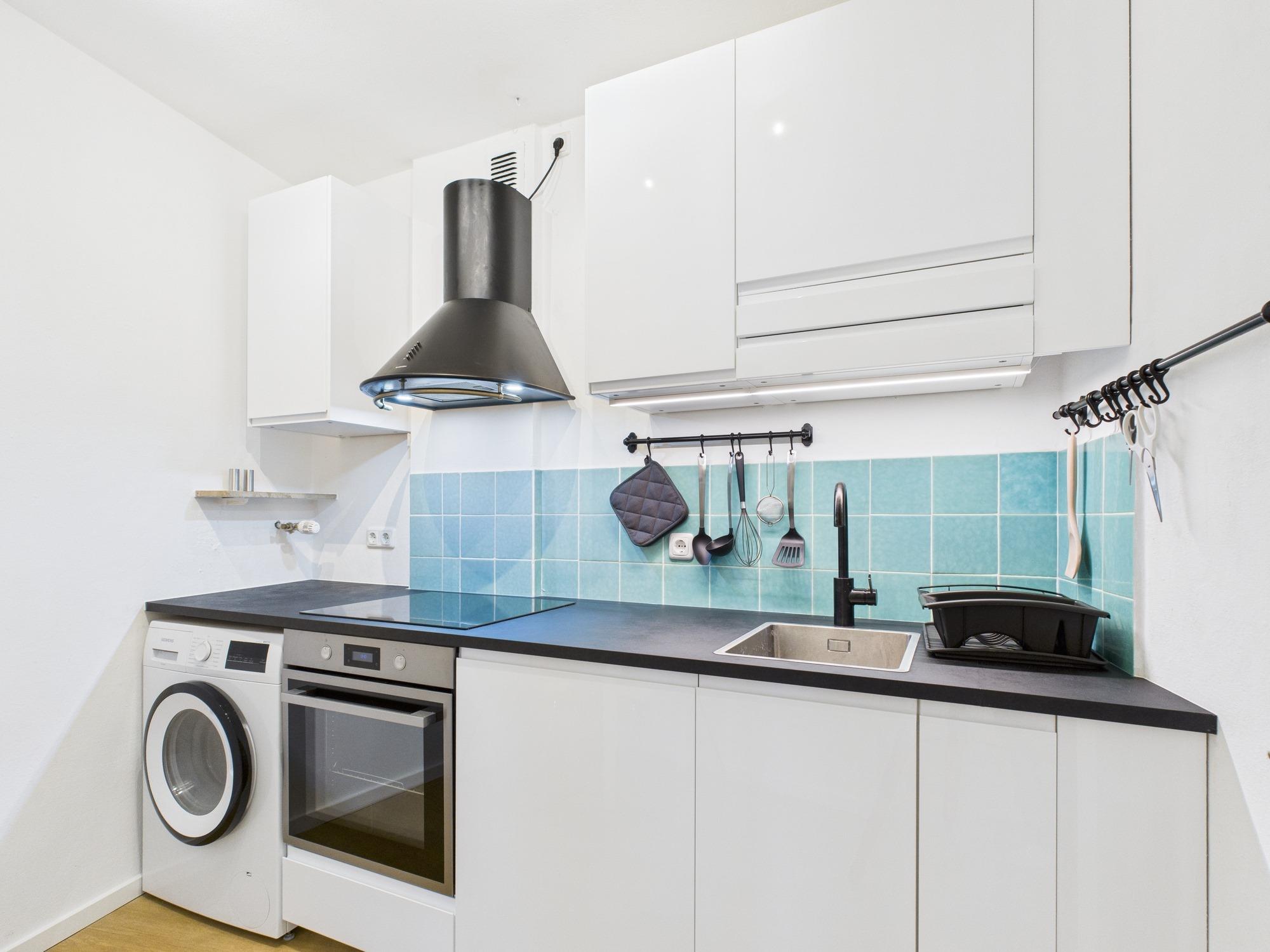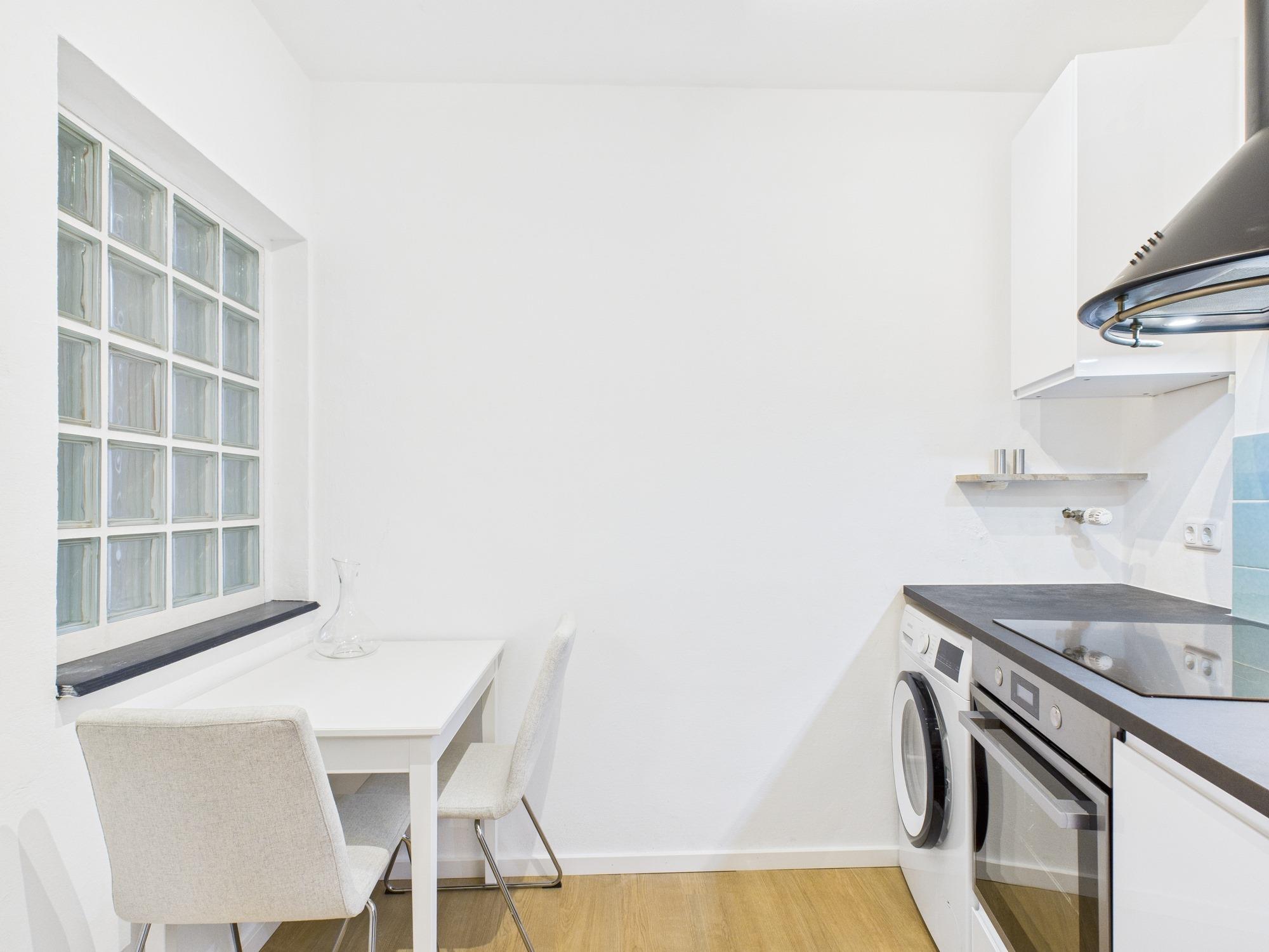 Die moderne Einbauküche schließt direkt an den Wohnbereich an und überzeugt durch Funktionalität und zeitloses Design. Sie ist mit einem Cerankochfeld, einem Backofen, einem Kühlschrank und einer Waschmaschine ausgestattet. Zudem steht eine vollständige Auswahl an Geschirr und Küchenutensilien zur Verfügung, sodass Sie sofort einziehen und sich ohne Aufwand einrichten können.
