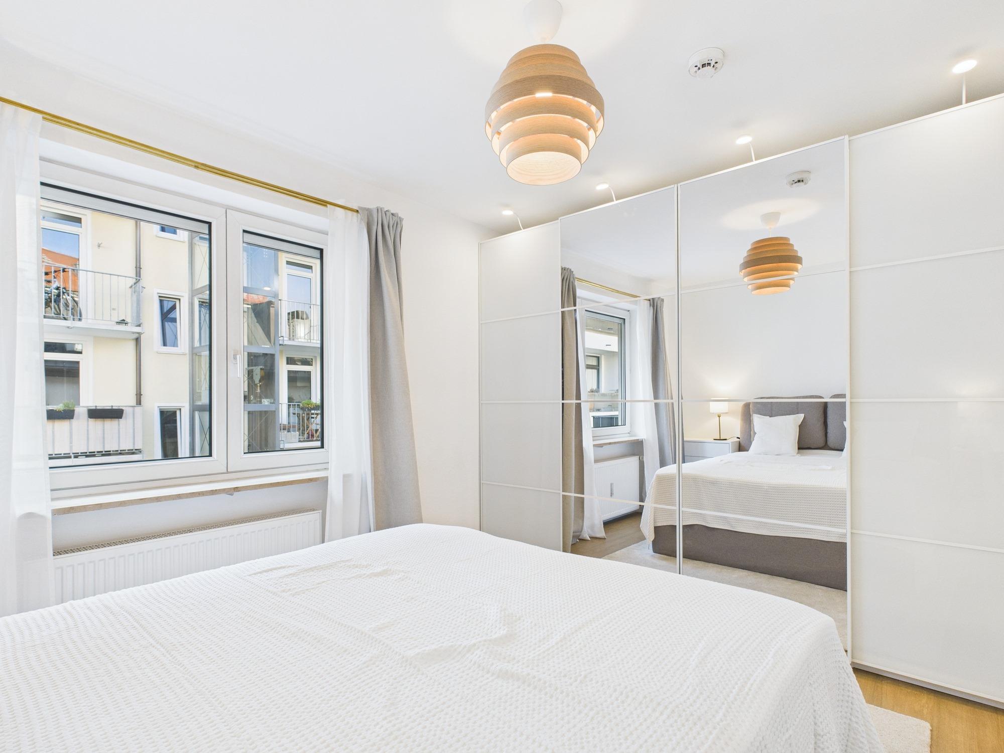 Das helle Schlafzimmer bietet durchdachte Möblierung mit einem hochwertigen Boxspringbett, passenden Nachttischen mit Lampen und einem großen Kleiderschrank, der ausreichend Stauraum schafft. Große Fenster sorgen für viel Tageslicht und eine ruhige Atmosphäre, die den Raum zu einem idealen Ort der Erholung macht.