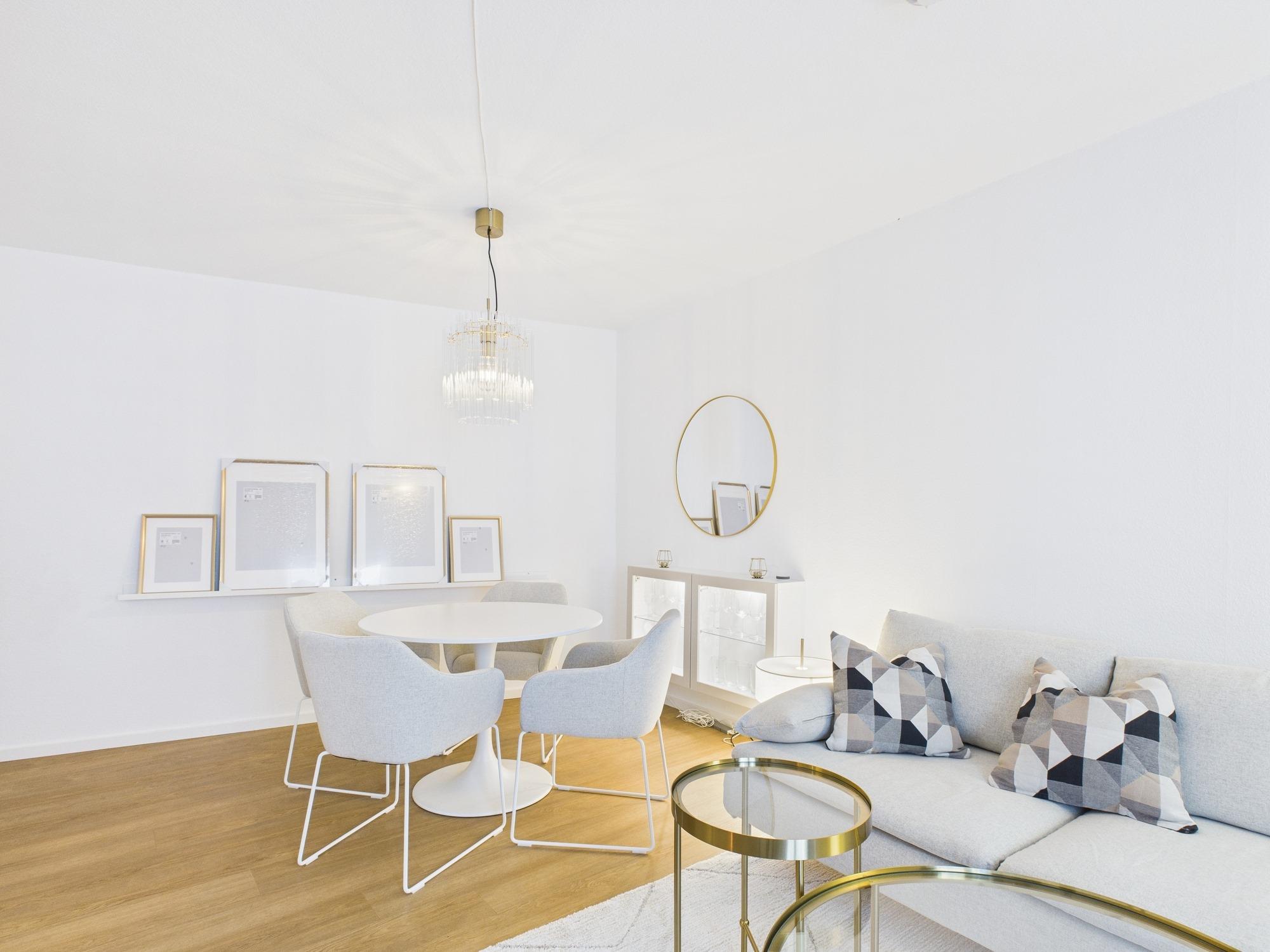 Der Wohn- und Essbereich bildet das Herzstück der Wohnung. Eine gemütliche Couch mit passenden Couchtischen, ein moderner 65-Zoll-Fernseher sowie ein stilvoller Esstisch mit Stühlen schaffen einen Ort, an dem man sich sofort wohlfühlt. Geschmackvolle Details und hochwertige Materialien verleihen dem Raum eine edle und wohnliche Ausstrahlung. Vom Wohnzimmer aus gelangen Sie auf den überdachten Südostbalkon, der einen Blick in den ruhigen Innenhof bietet. Der Balkon lädt zu entspannten Stunden im Freien ein und bietet einen angenehmen Rückzugsort mitten in der Stadt.