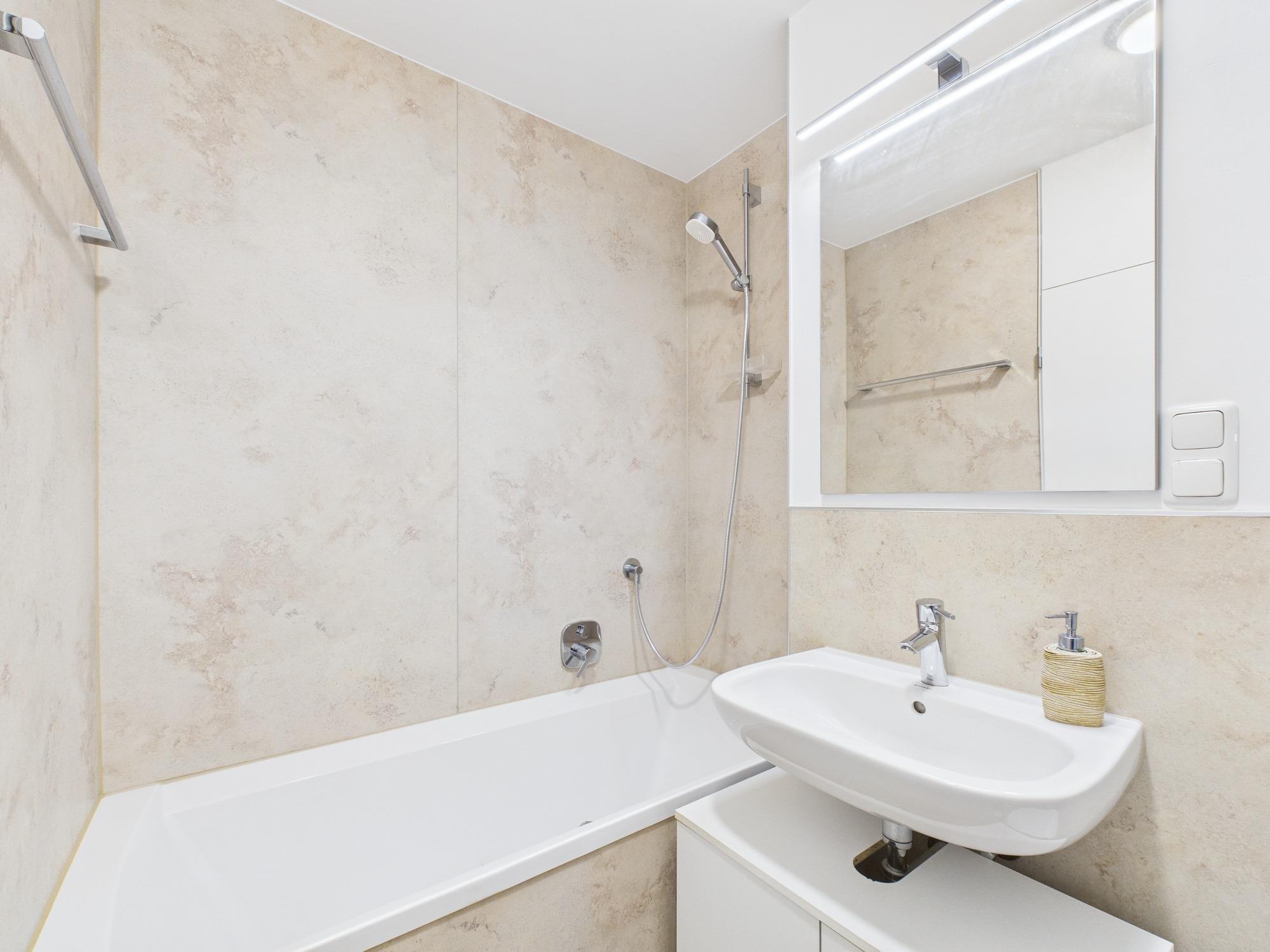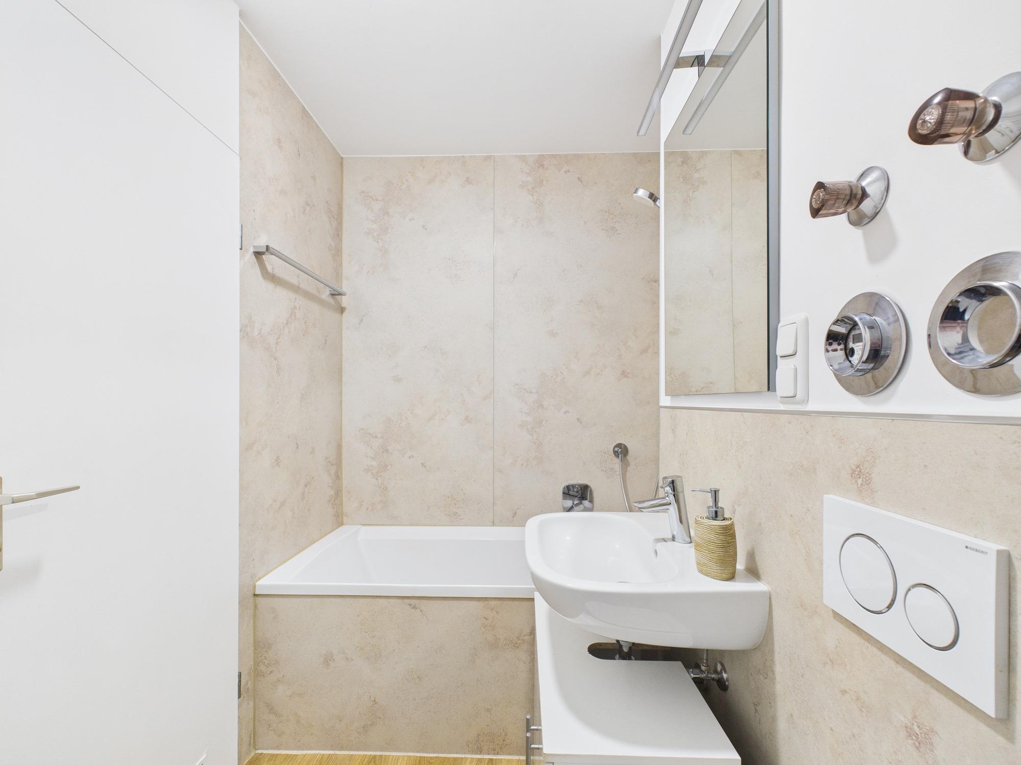 - Hauptbad mit Badewanne, WC, Waschbecken und Waschmaschine