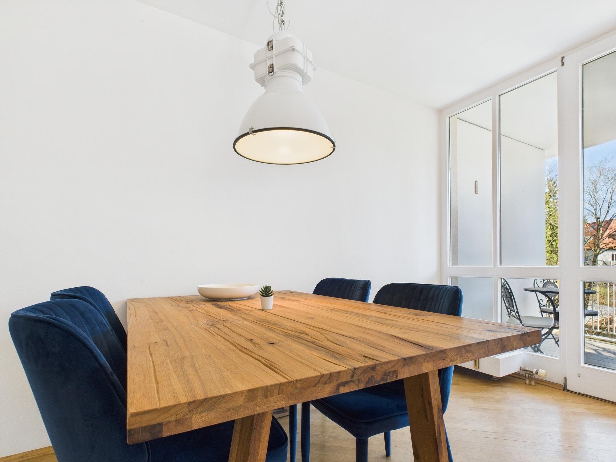 Betreten Sie die Wohnung und erleben Sie das großzügige Wohn-Esszimmer, das mit viel Tageslicht und großen Fensterflächen punktet. Der Esstisch aus hochwertigem Massivholz lädt sowohl zum gemeinsamen Essen als auch zu geschäftlichen Meetings ein. Direkt angrenzend befindet sich der Balkon mit einer Nord-Ost-Ausrichtung, der Ihnen an warmen Tagen eine grüne Oase bietet. Hier können Sie mit Blick auf den gepflegten Innenhof sowie die blühenden Gärten genießen.