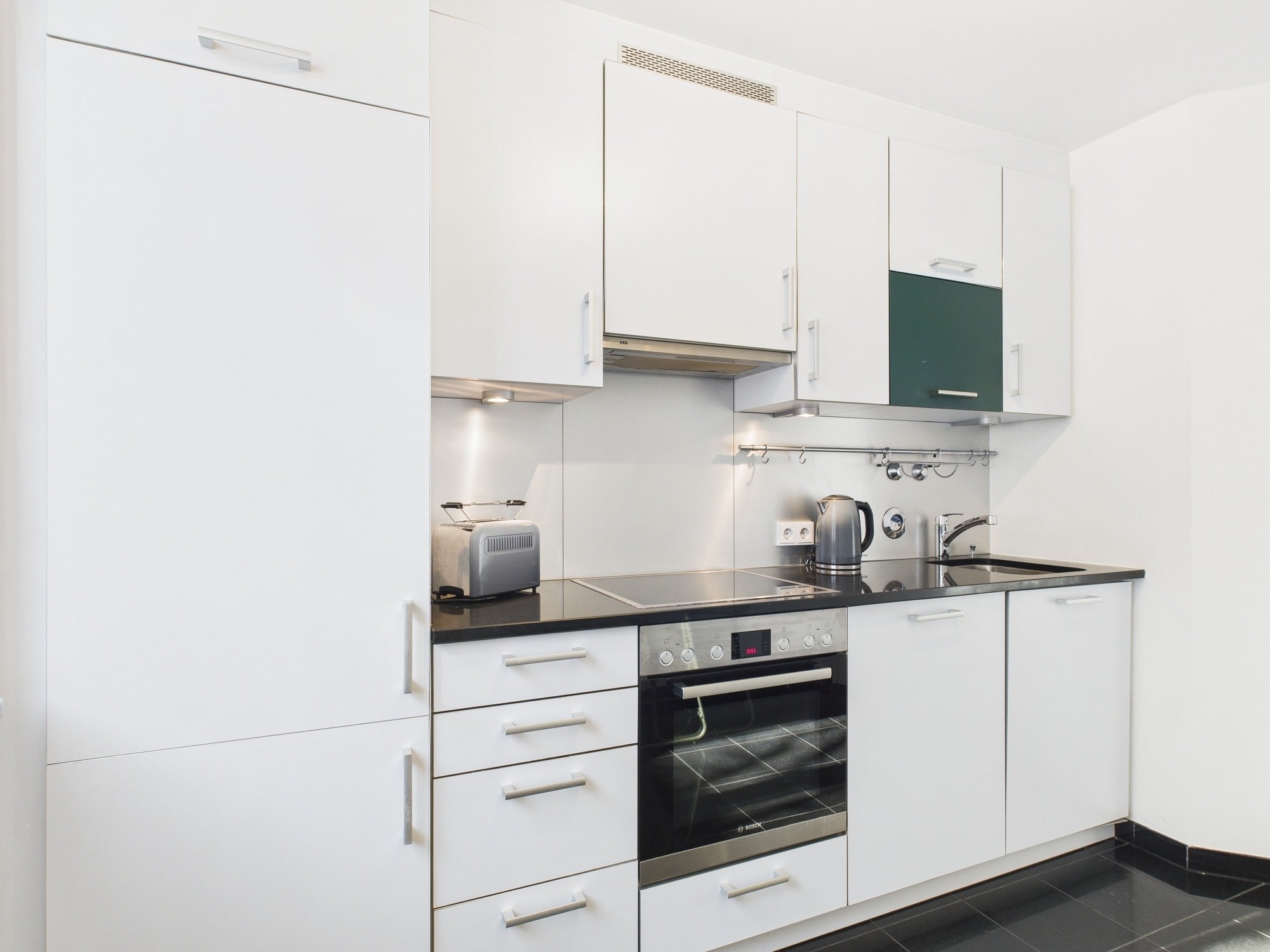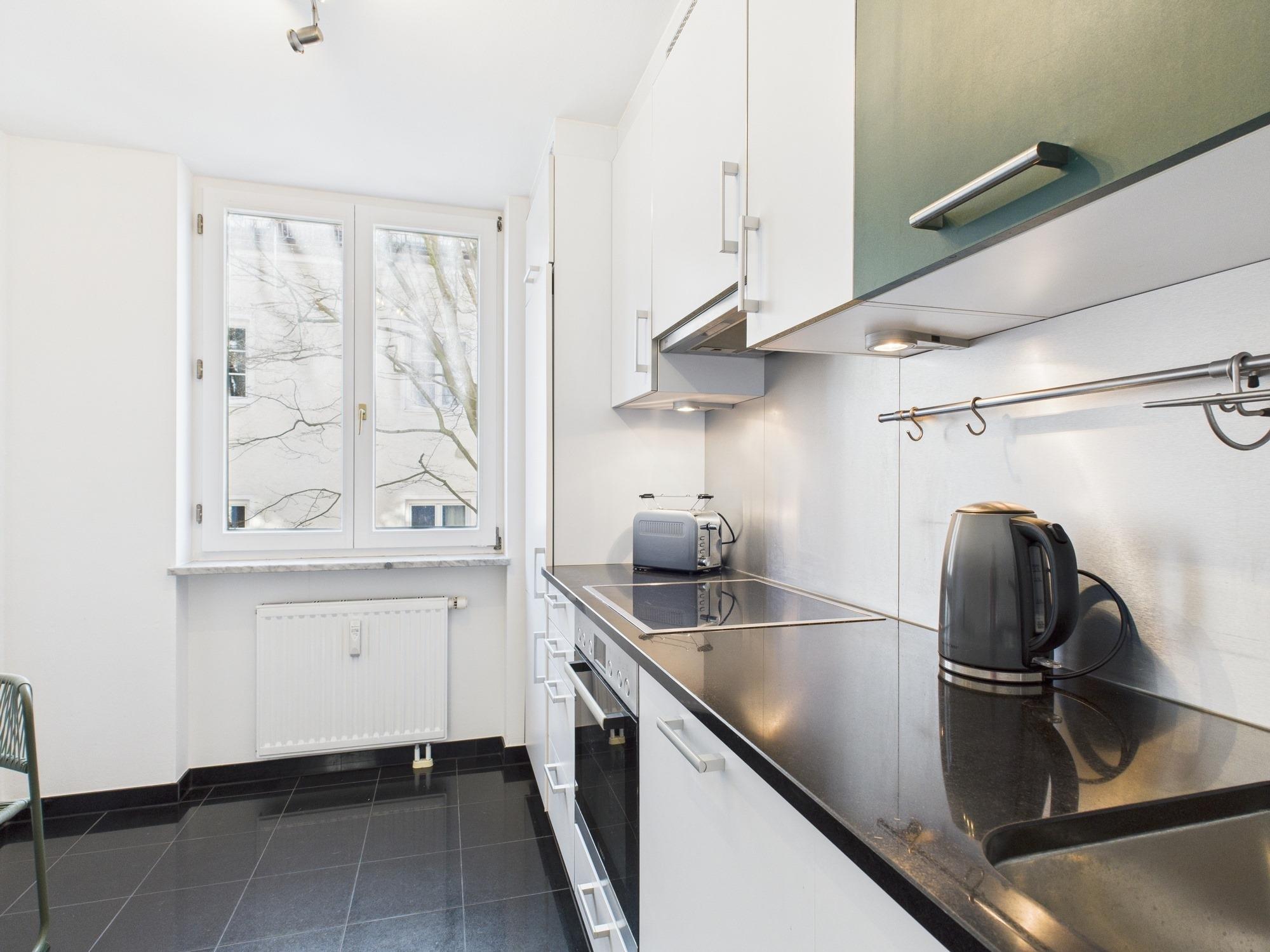 Ein weiteres Highlight der Wohnung ist die separate Küche, die mit einer voll ausgestatteten Einbauküche zum Kochvergnügen einlädt. Vom großen Kühlschrank über Backofen, Wasserkocher, Toaster bis hin zur Spülmaschine ist hier alles vorhanden. Der kleine Tisch bietet zusätzlichen Platz für schnelle Mahlzeiten oder kleine Arbeitspausen. Auch hier profitieren Sie von einer grünen Aussicht und viel Tageslicht.
