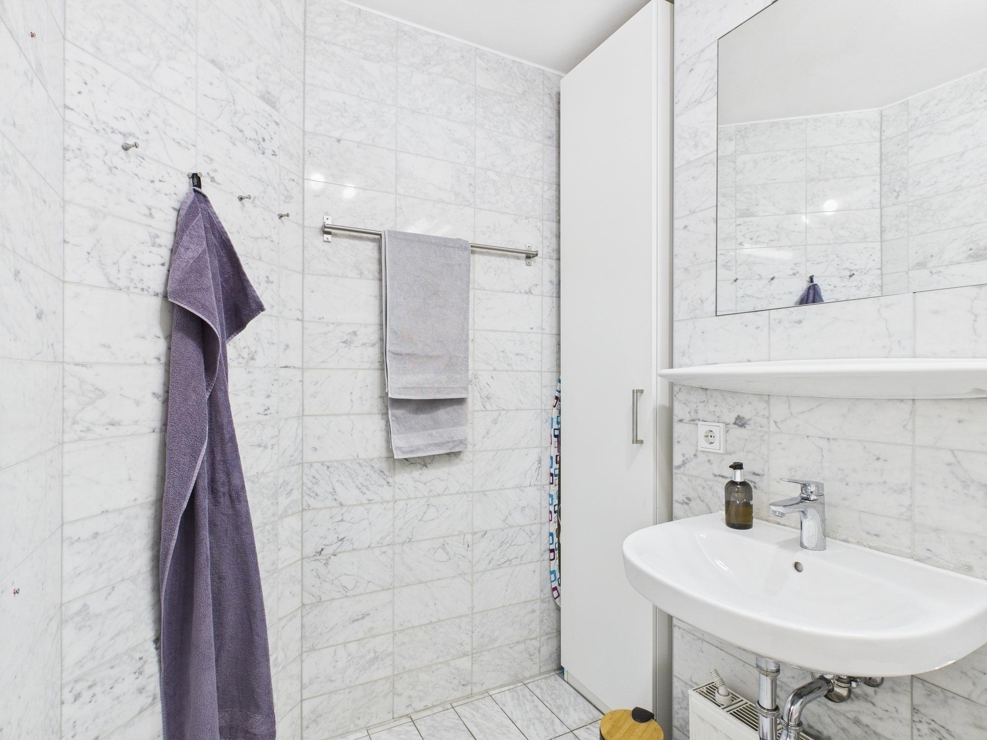 Gegenüber dem Bad befindet sich ein praktischer Einbauschrank, der zusätzlichen Stauraum bietet.