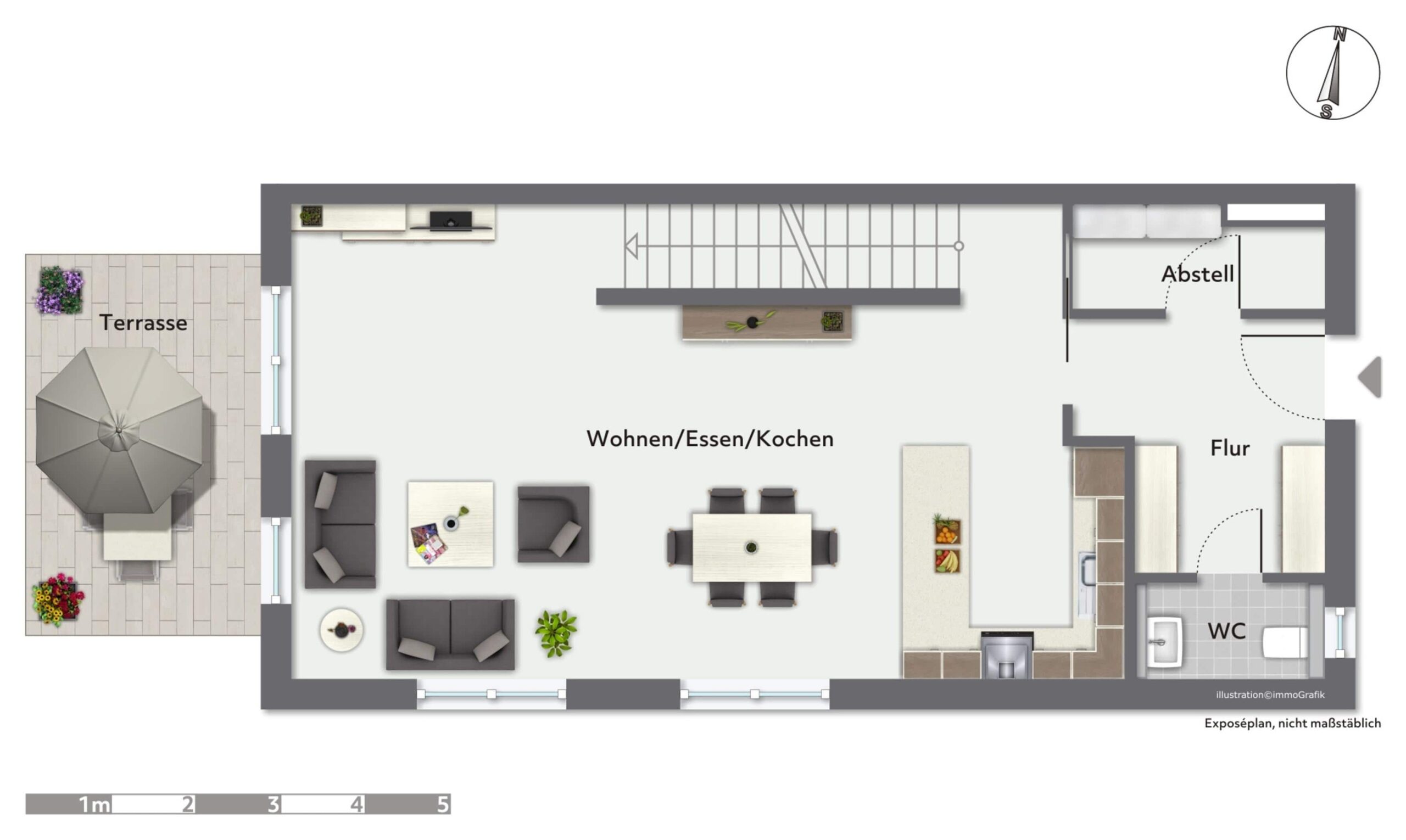 Die Terrasse und der eigene Garten erweitern Ihren Wohnraum ins Freie und laden zu entspannten Momenten im Grünen ein.