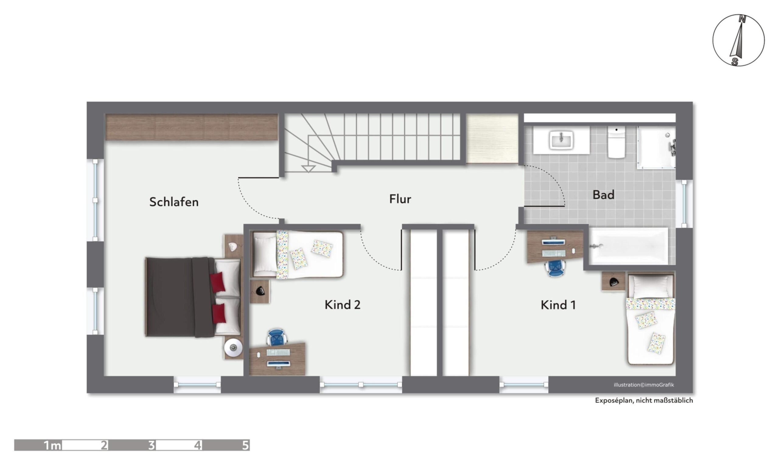 Im Obergeschoss finden Sie eine optimale Raumaufteilung der Schlafräume und das moderne Badezimmer mit Wanne und bodengleicher Dusche darf natürlich auch nicht fehlen.